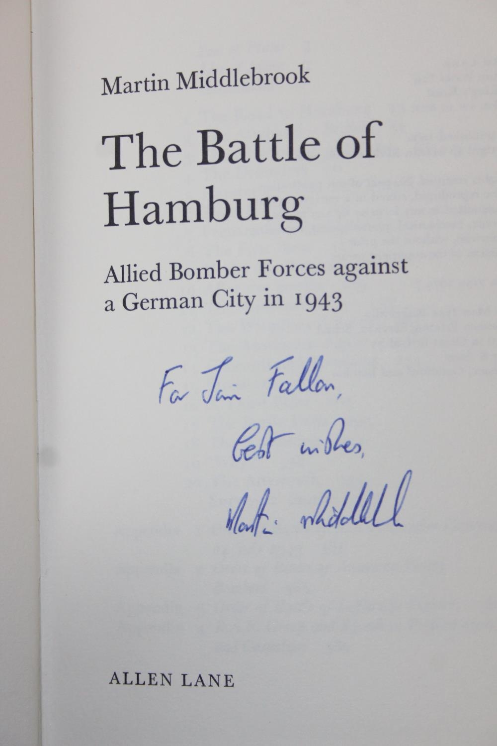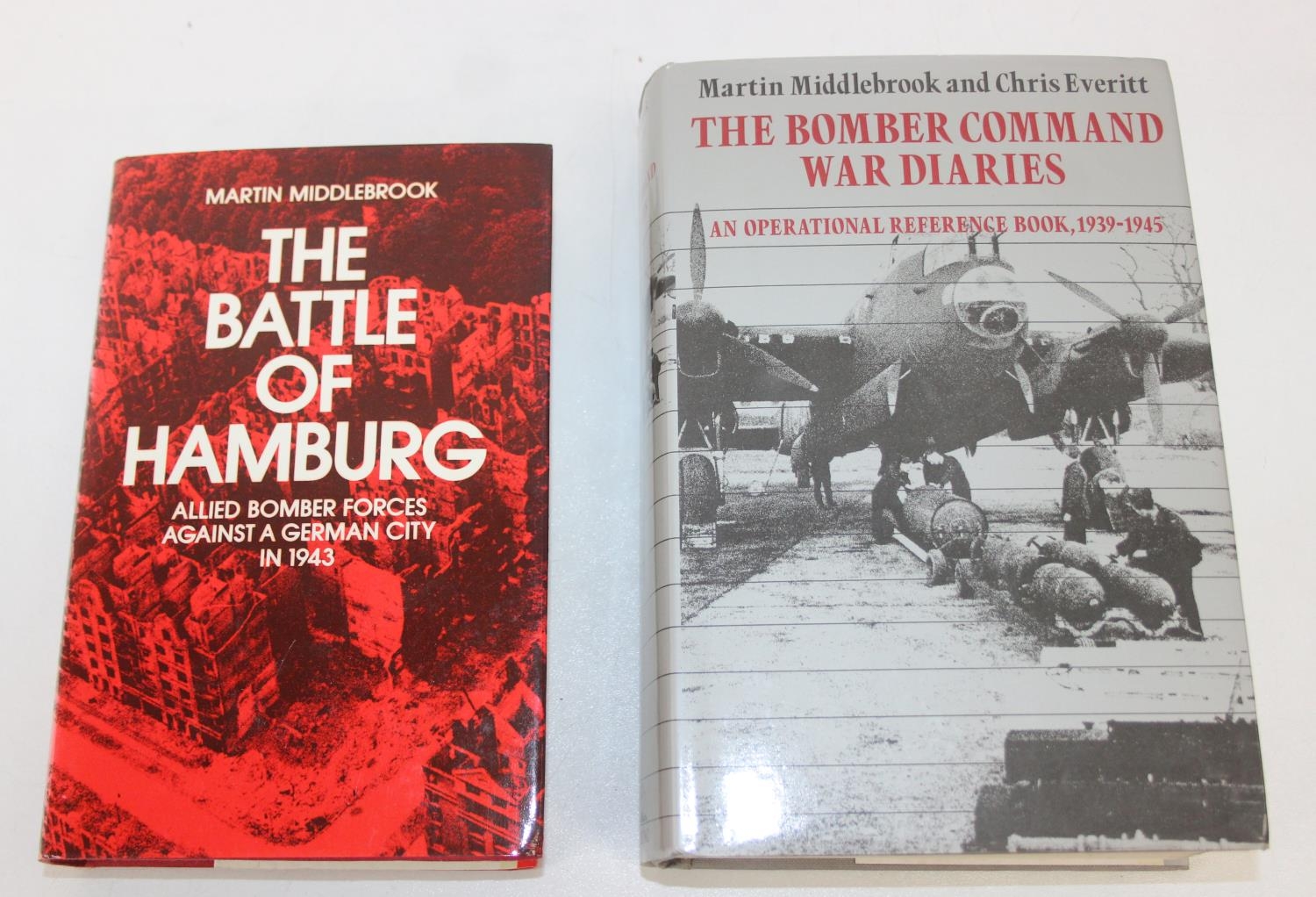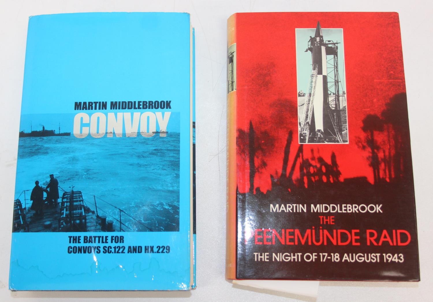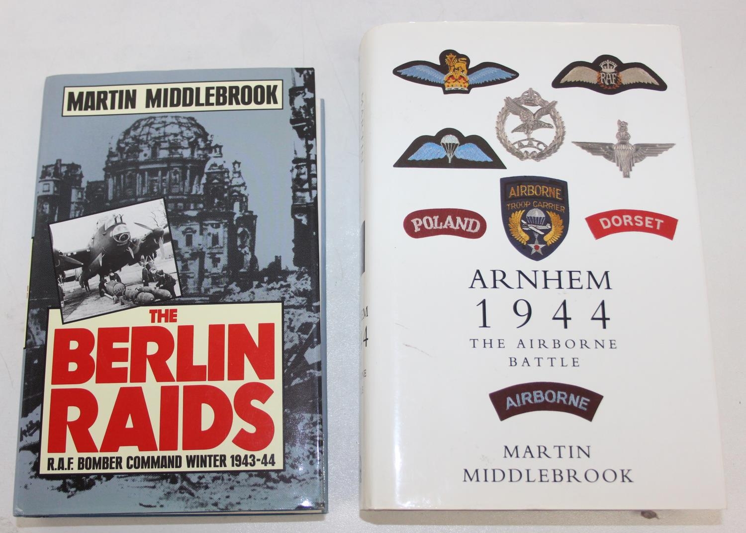 Eight WW2 interest books by renowned military historian Martin Middlebrook, all signed by the author, most with dedications, titles include 'The Schweinfurt-Regensburg Mission', 'The Berlin Raids', 'The Peenemunde Raid', 'Convoy', 'The Battle of Hamburg', Arnhem 1944', 'The Bomber Command War Diaries' and 'Battleship' which is also signed by co-author Patrick Mahoney [8]