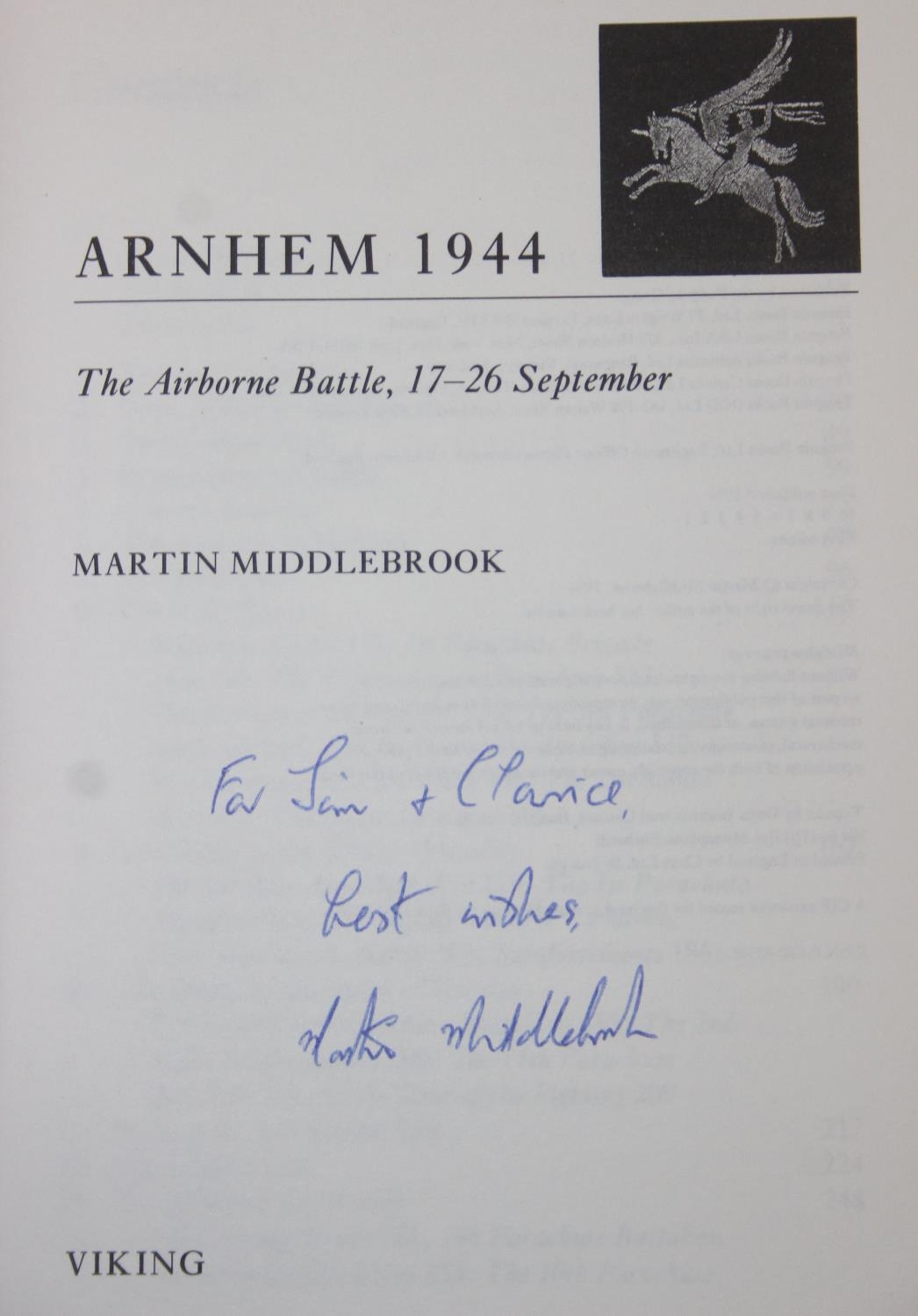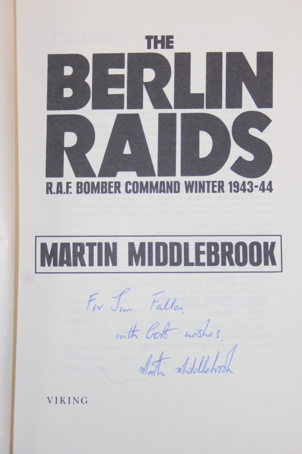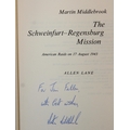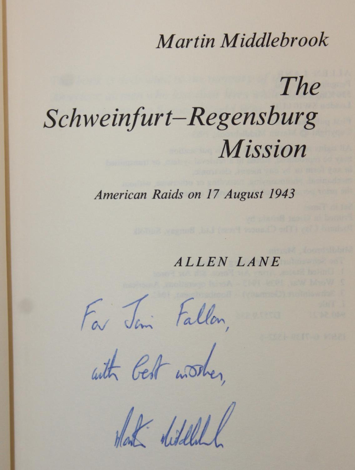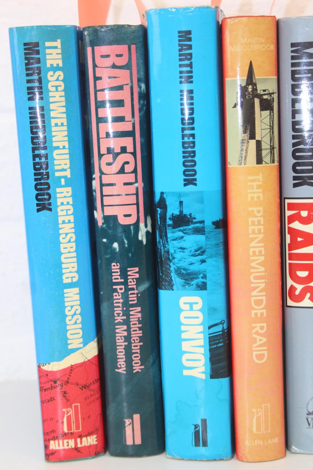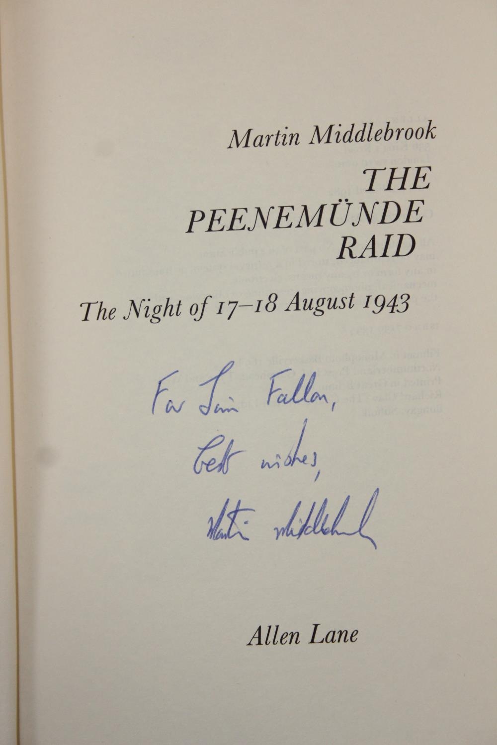Eight WW2 interest books by renowned military historian Martin Middlebrook, all signed by the author, most with dedications, titles include 'The Schweinfurt-Regensburg Mission', 'The Berlin Raids', 'The Peenemunde Raid', 'Convoy', 'The Battle of Hamburg', Arnhem 1944', 'The Bomber Command War Diaries' and 'Battleship' which is also signed by co-author Patrick Mahoney [8]