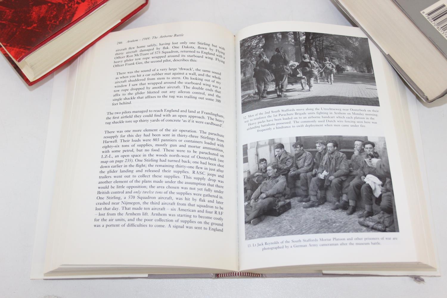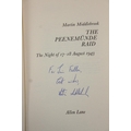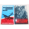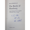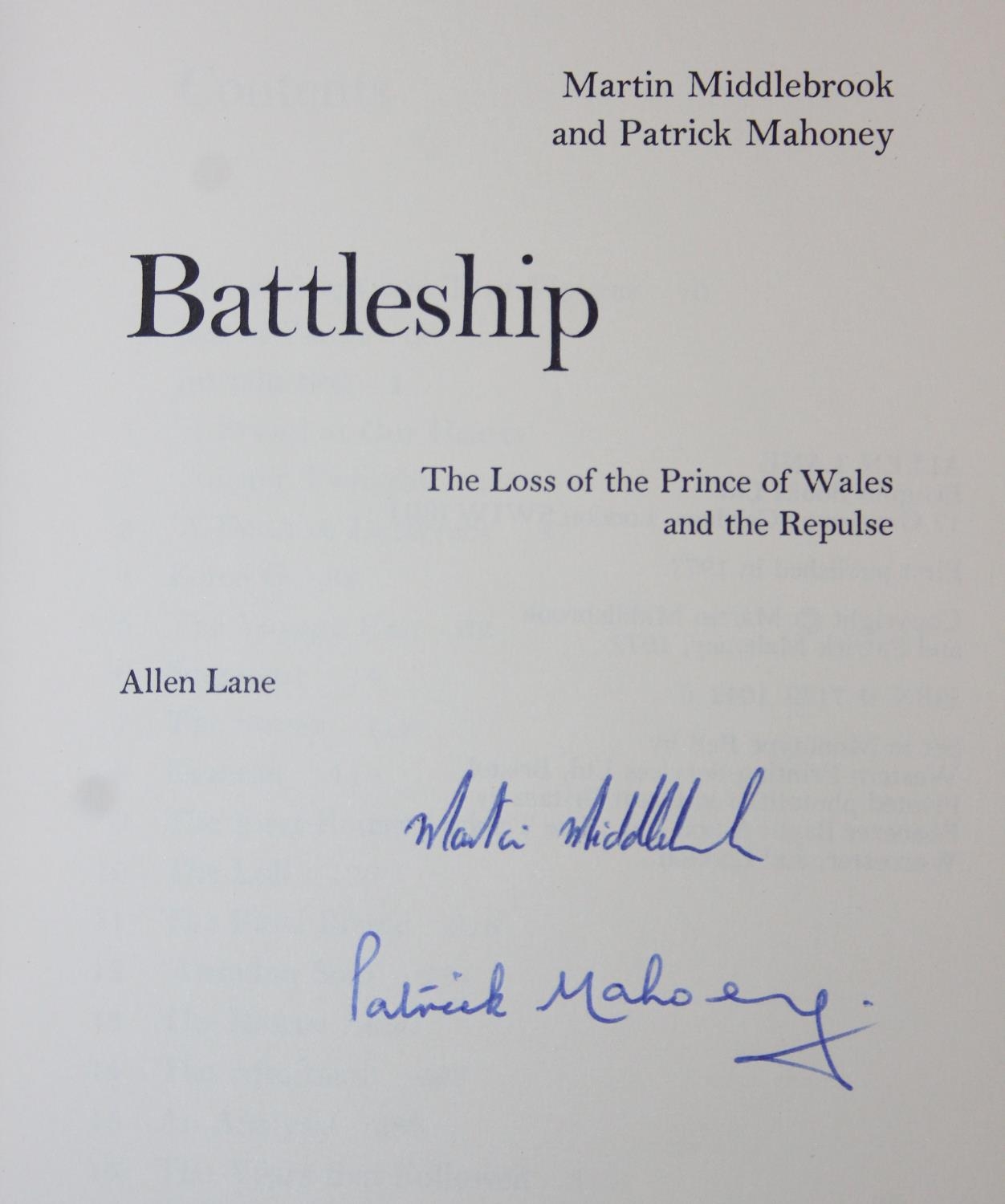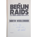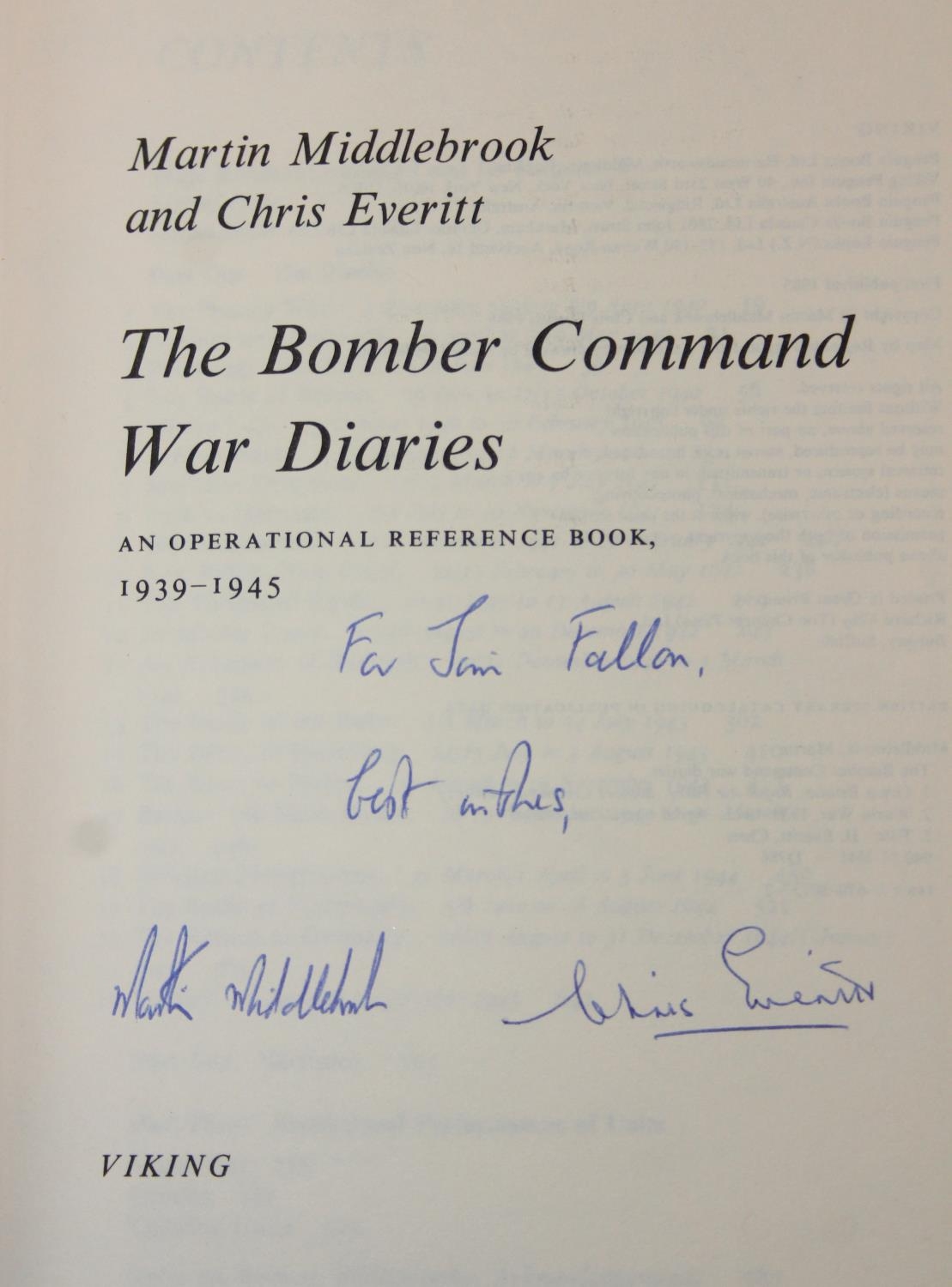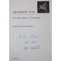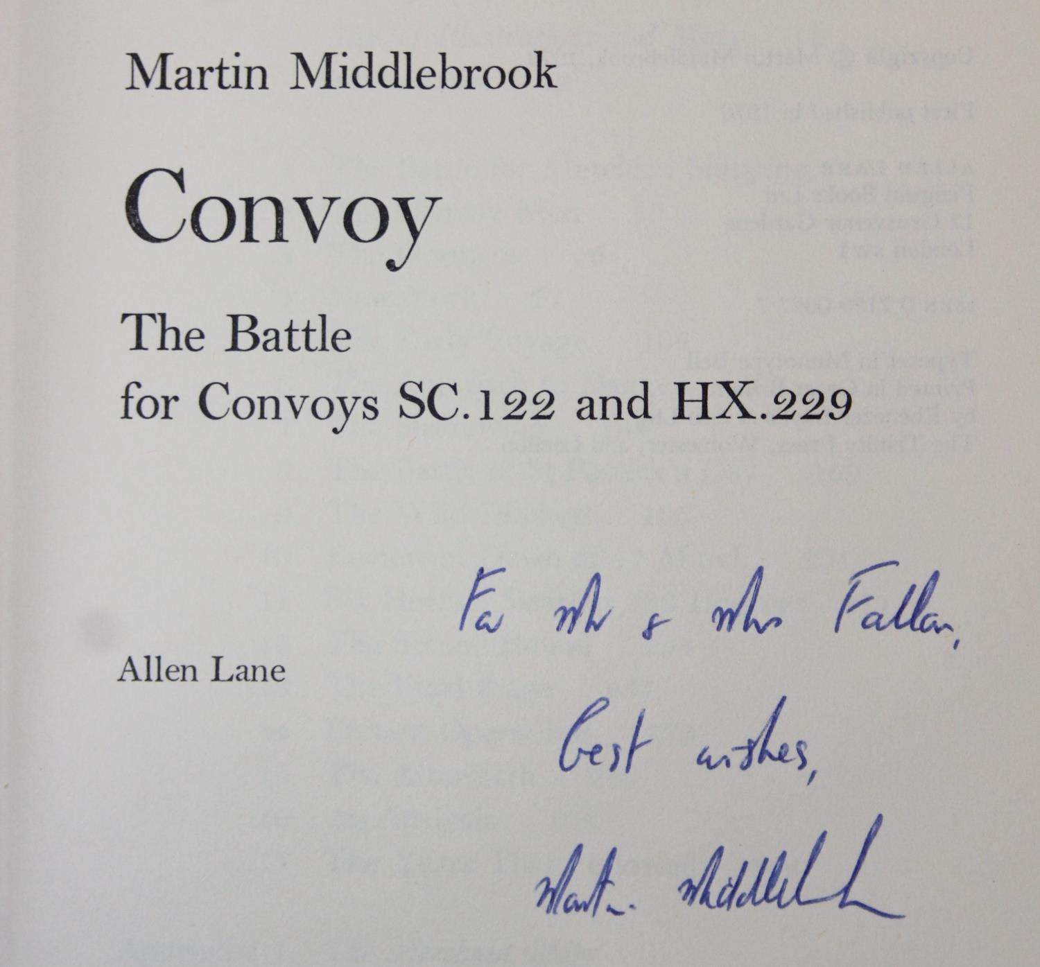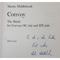 Eight WW2 interest books by renowned military historian Martin Middlebrook, all signed by the author, most with dedications, titles include 'The Schweinfurt-Regensburg Mission', 'The Berlin Raids', 'The Peenemunde Raid', 'Convoy', 'The Battle of Hamburg', Arnhem 1944', 'The Bomber Command War Diaries' and 'Battleship' which is also signed by co-author Patrick Mahoney [8]