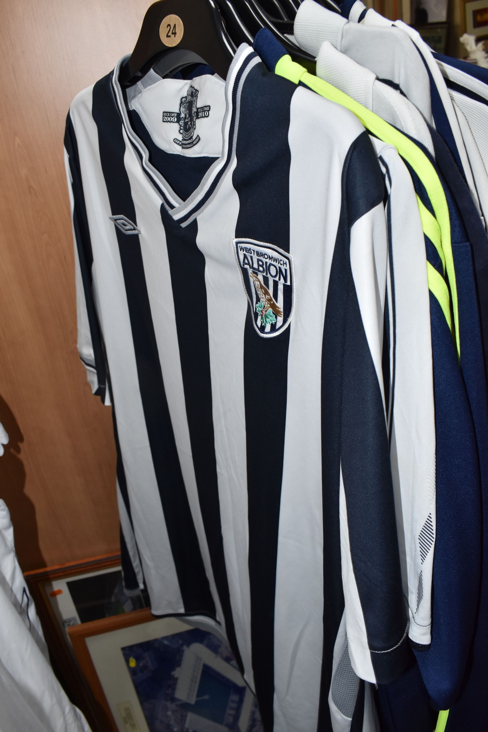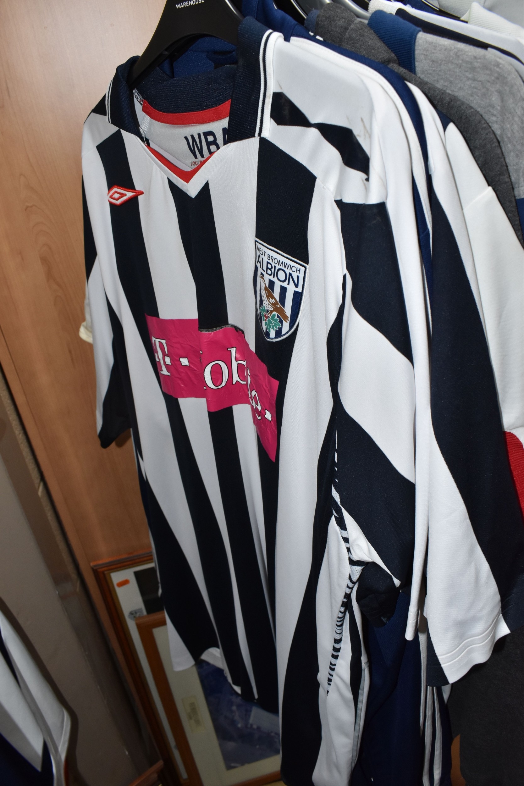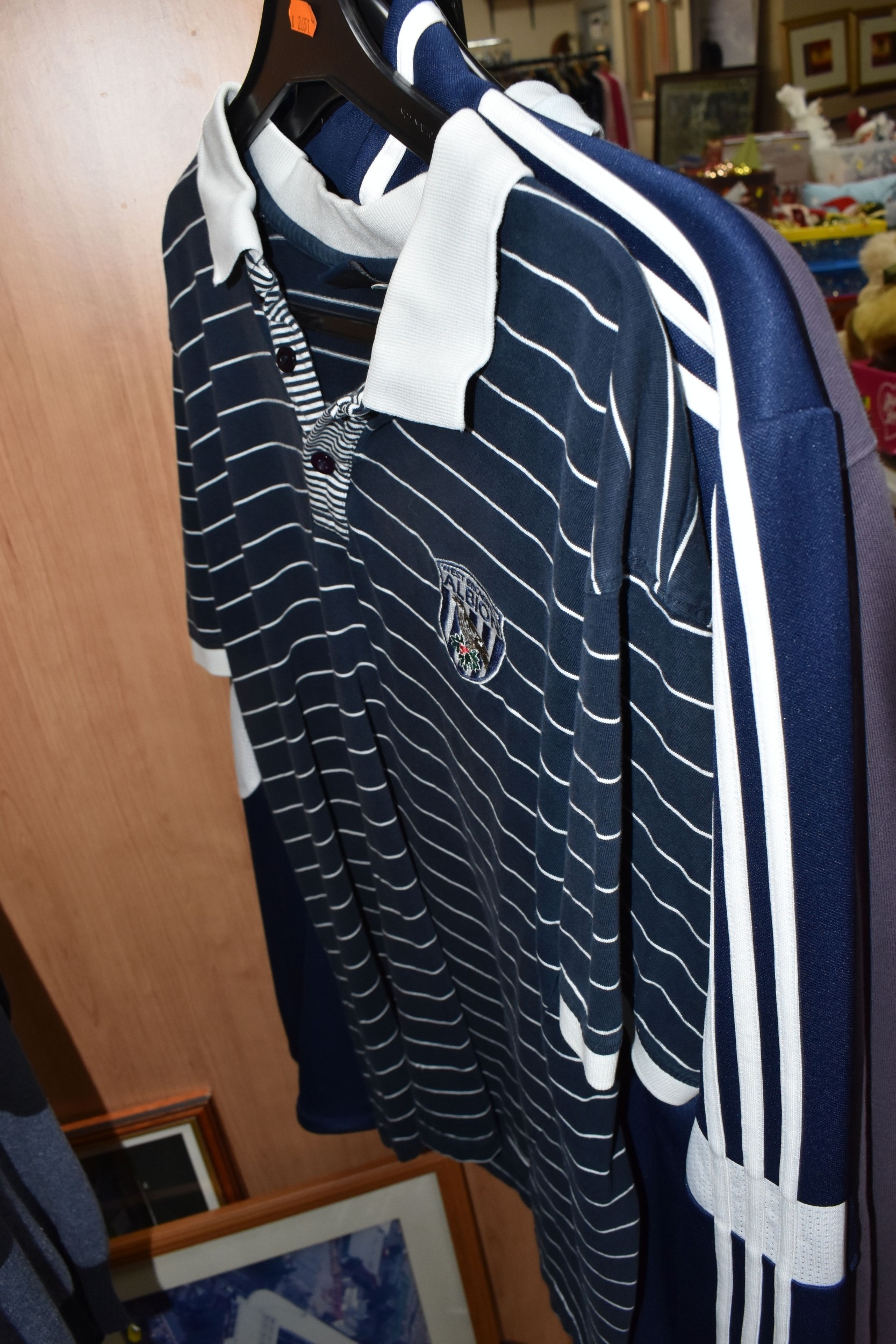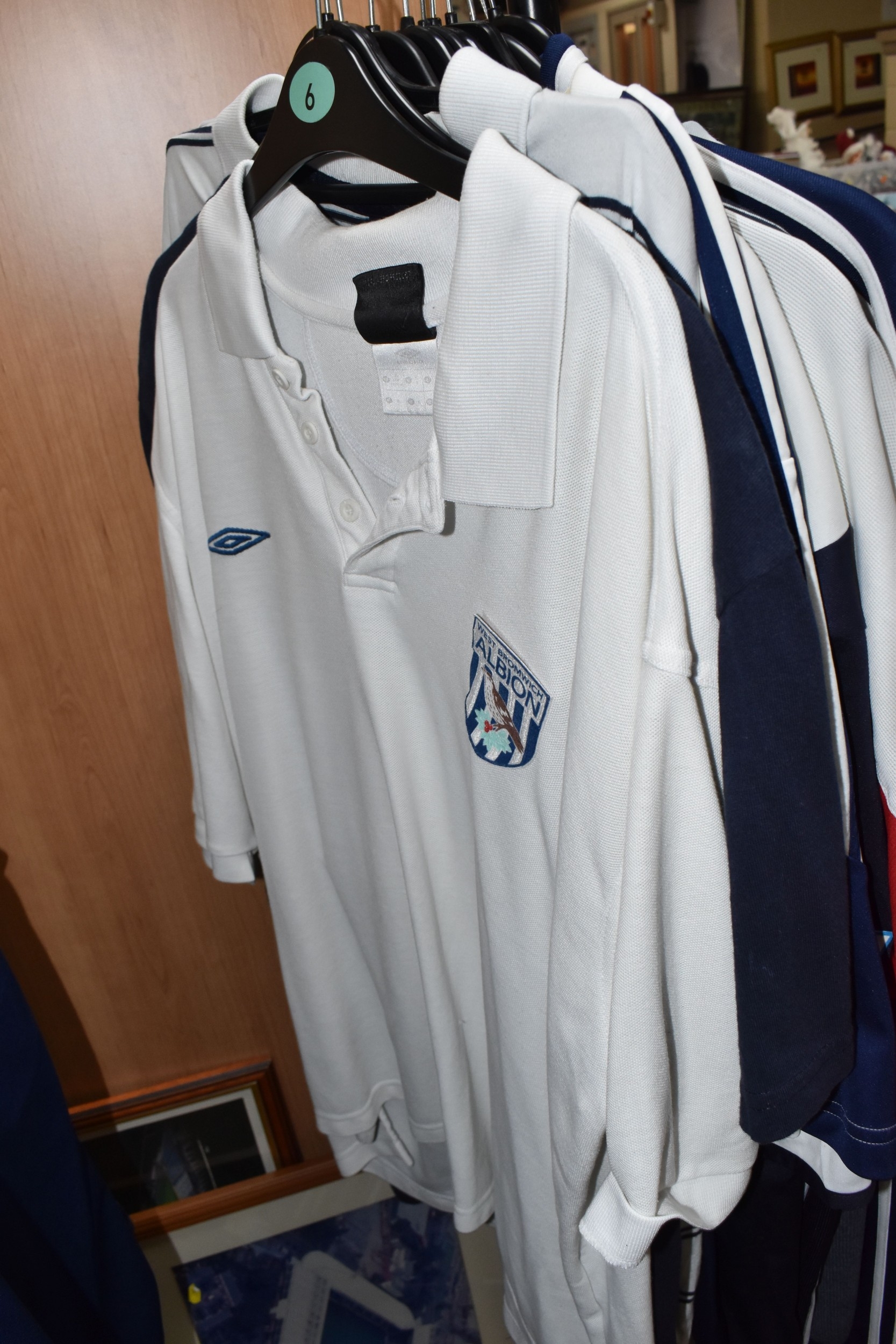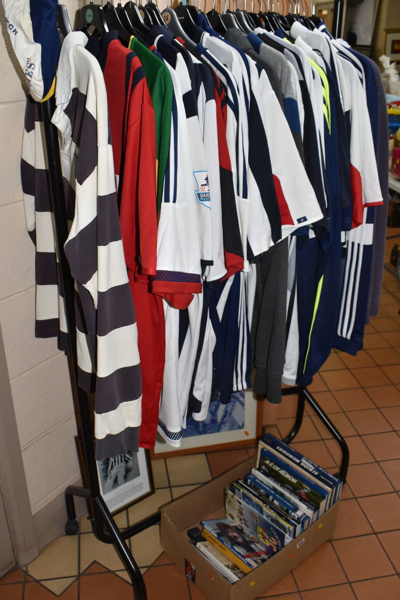 ONE BOX AND LOOSE WEST BROMWICH ALBION FOOTBALL MEMORABILIA, to include approximately thirty tops, including polo tops, quarter zip, full zip tops, rugby style etc. sizes XL, together with various books, and framed prints including the stadium, (1 box + loose), (sd/af), PLEASE NOTE THE RAIL IS NOT INCLUDED IN THE SALE