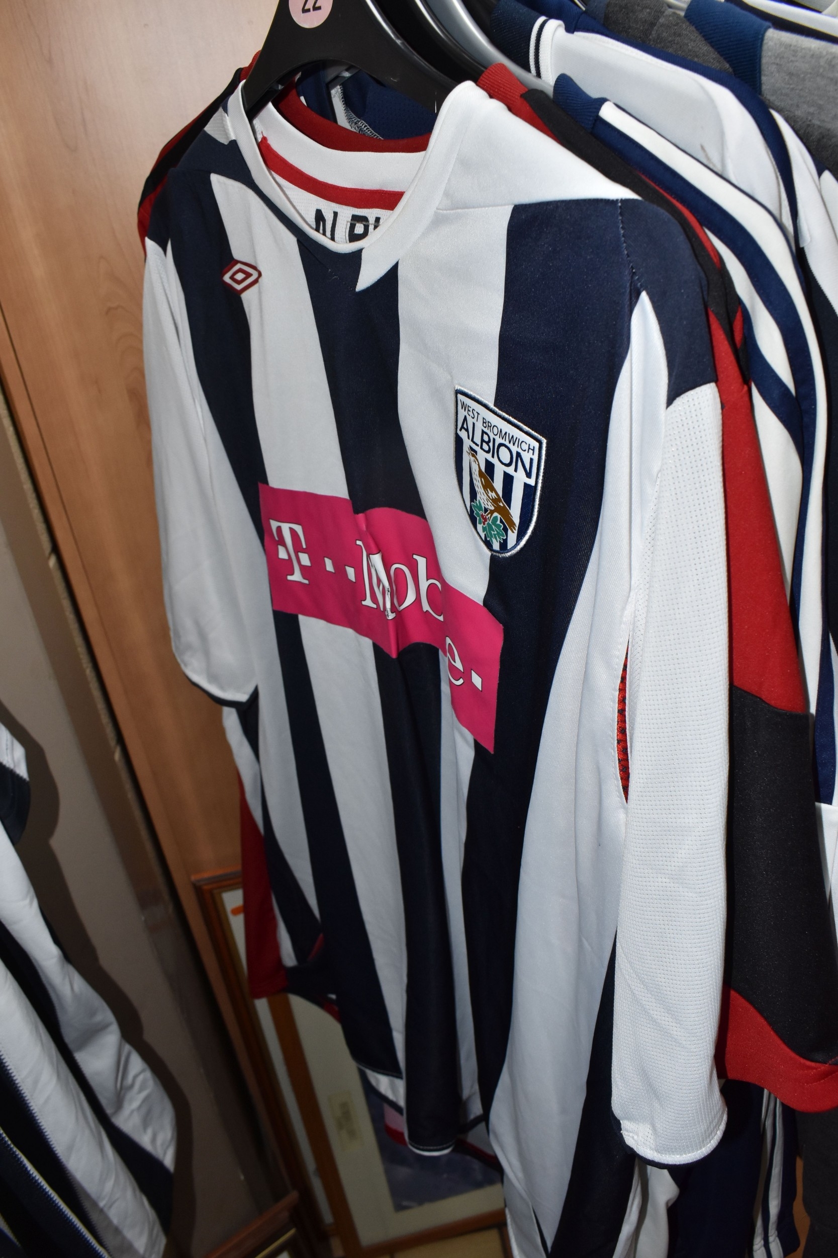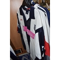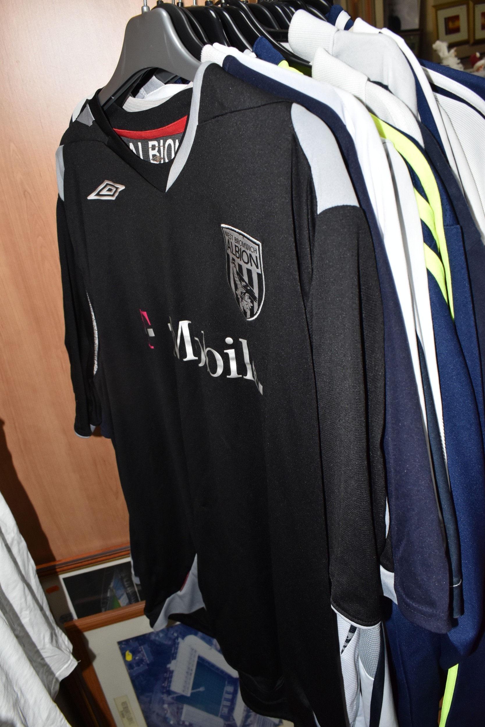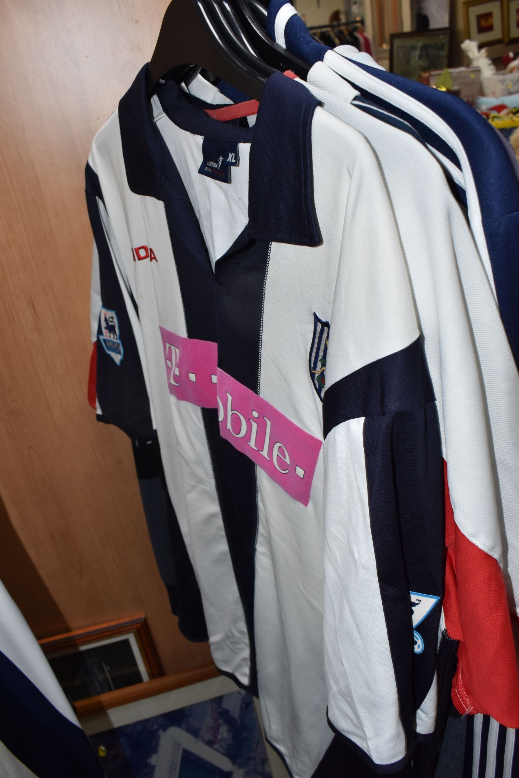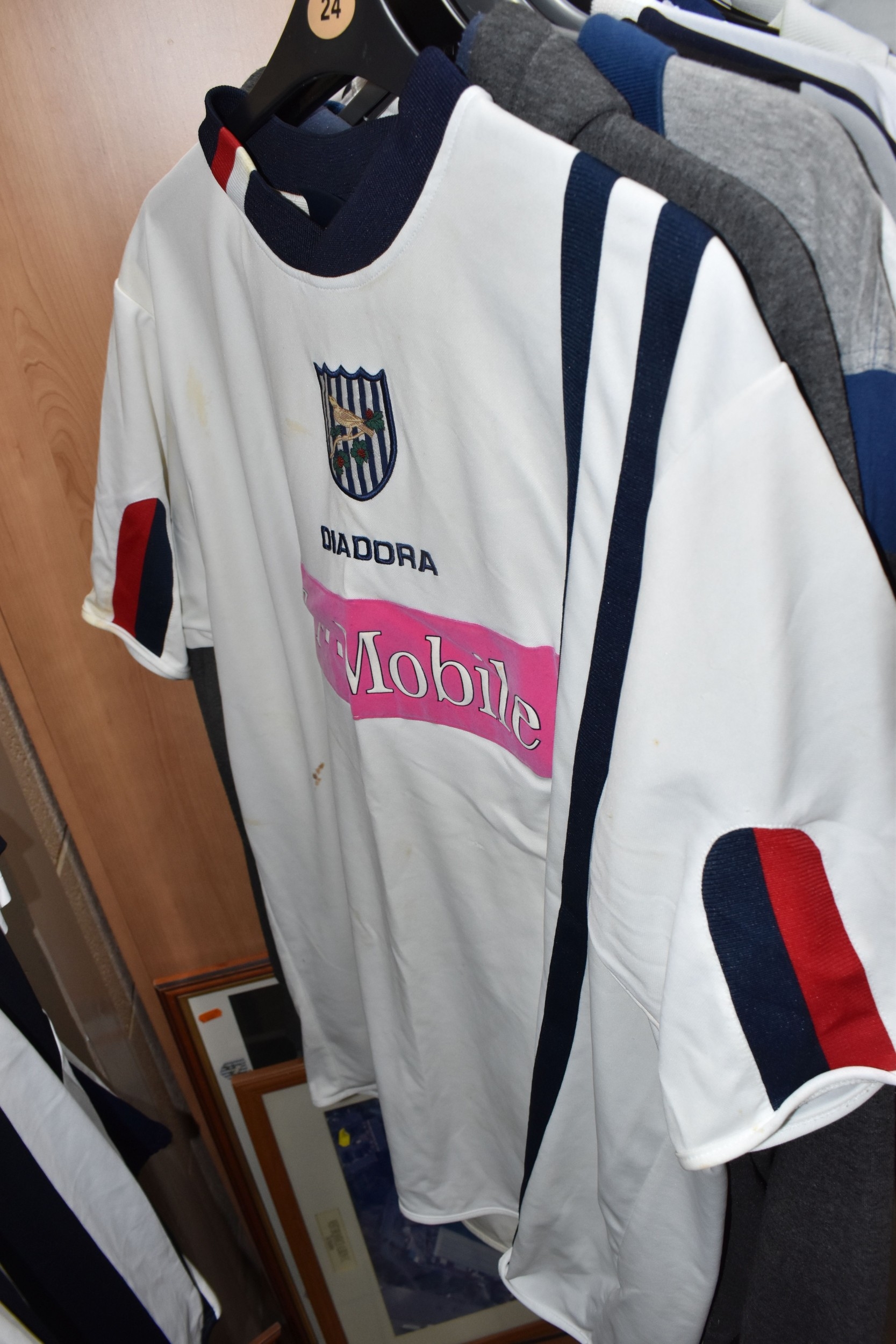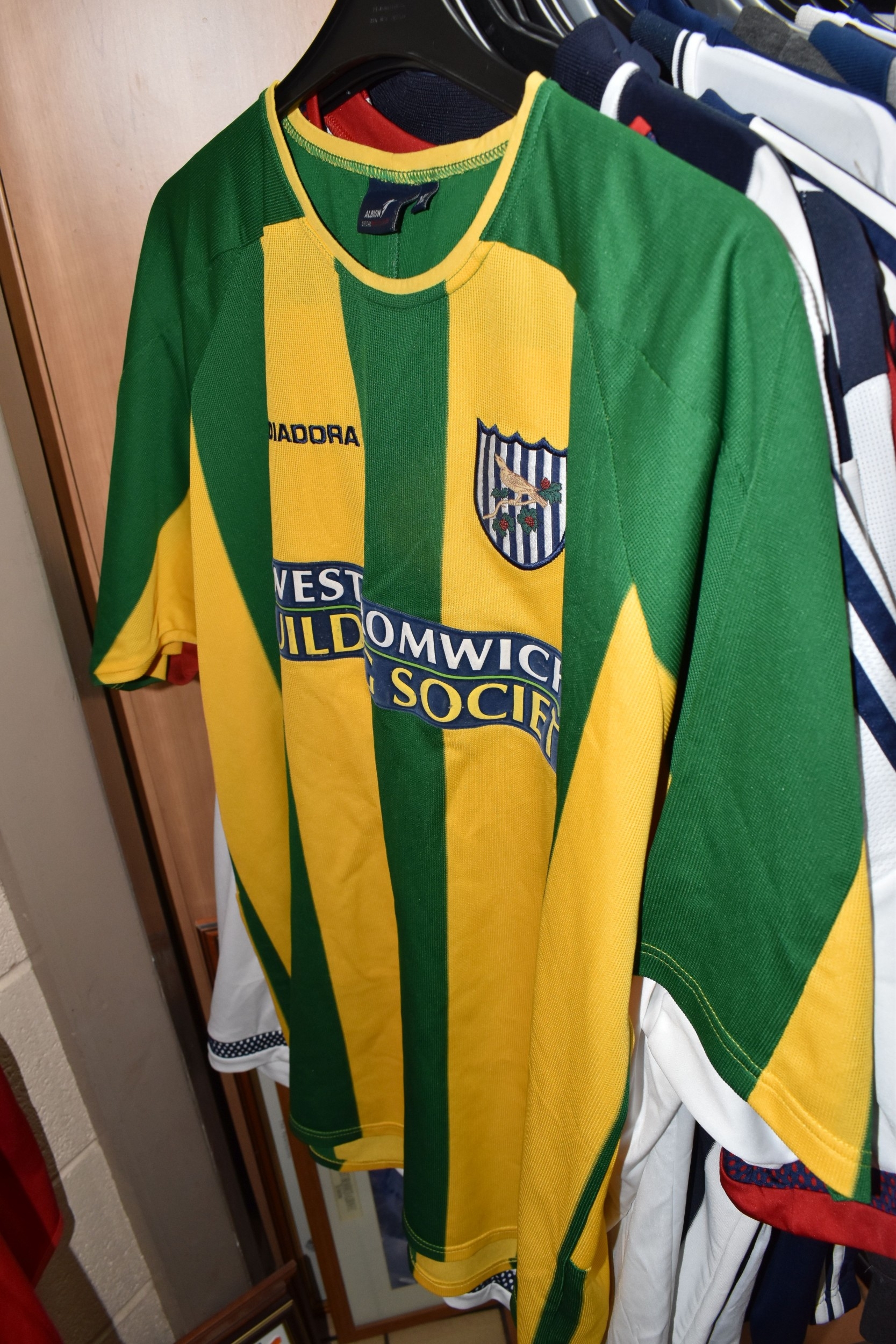 ONE BOX AND LOOSE WEST BROMWICH ALBION FOOTBALL MEMORABILIA, to include approximately thirty tops, including polo tops, quarter zip, full zip tops, rugby style etc. sizes XL, together with various books, and framed prints including the stadium, (1 box + loose), (sd/af), PLEASE NOTE THE RAIL IS NOT INCLUDED IN THE SALE