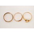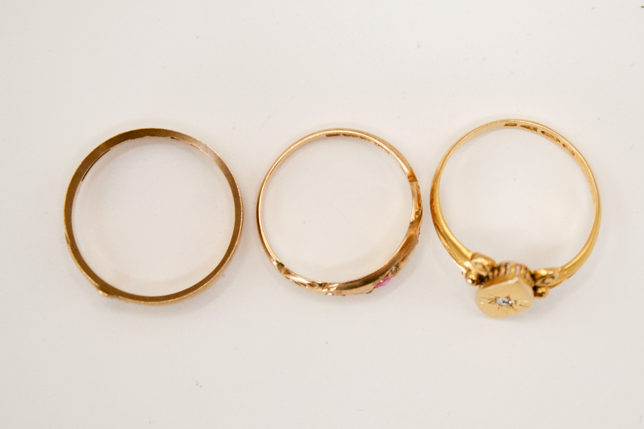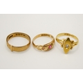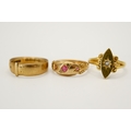 Three 18ct gold and stone set rings. Comprising a hallmarked buckle ring, size M; one set with three small pale rubies, size K; and one of marquise form set with a small diamond. Total gross weight 8.2g.