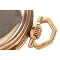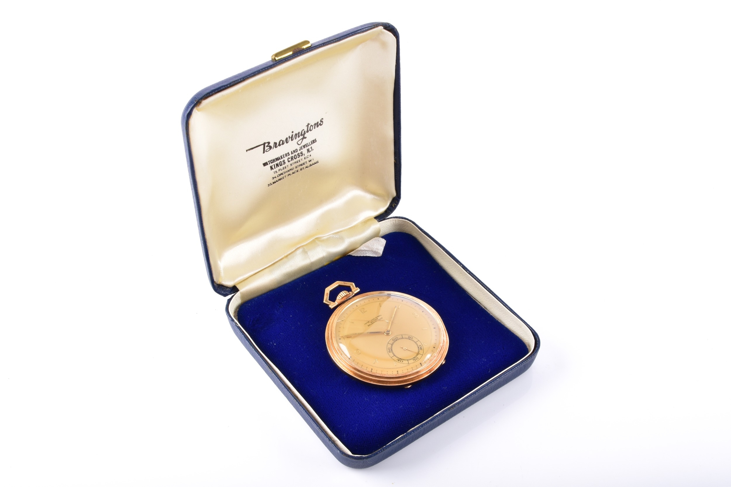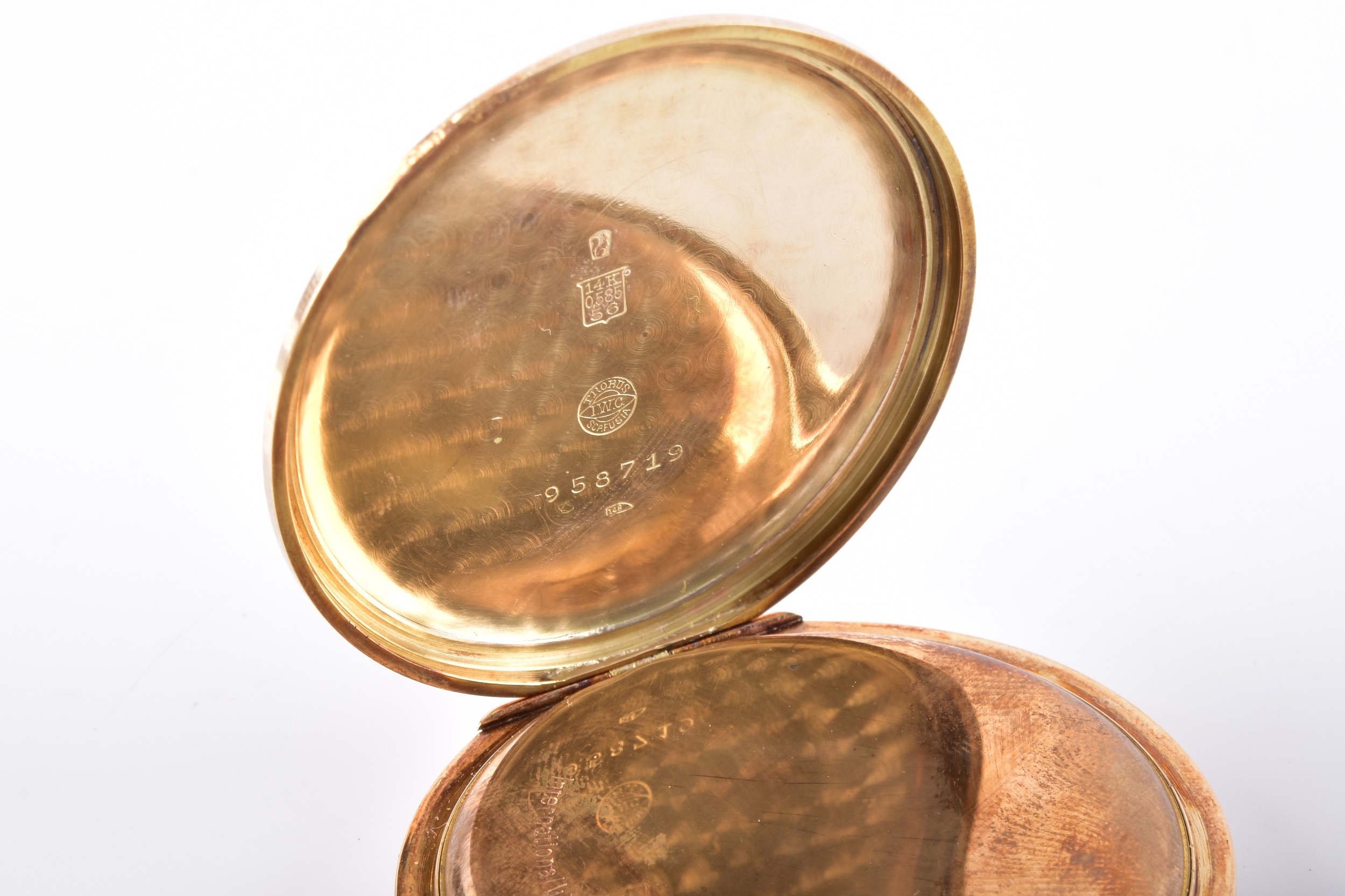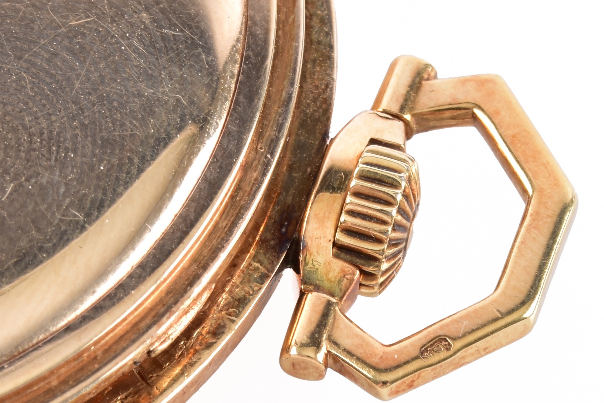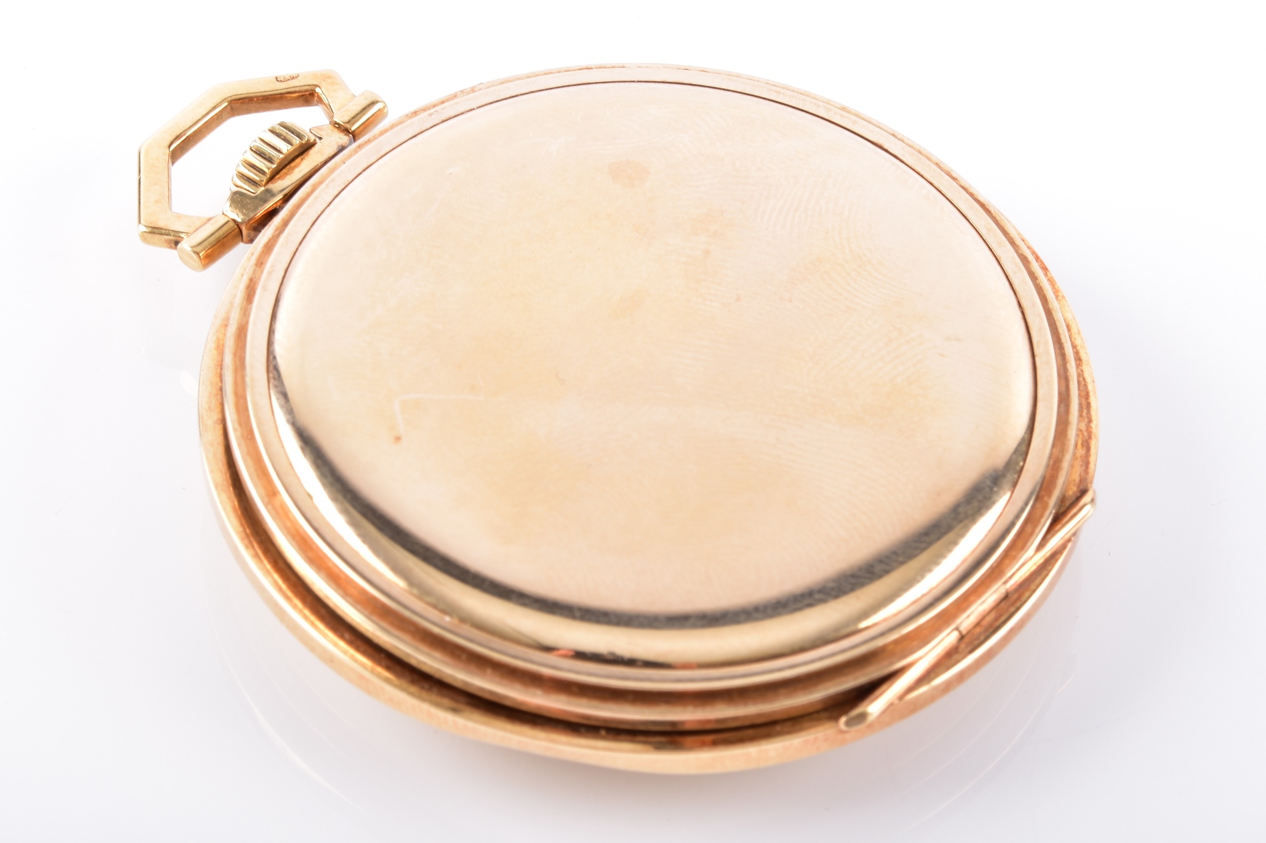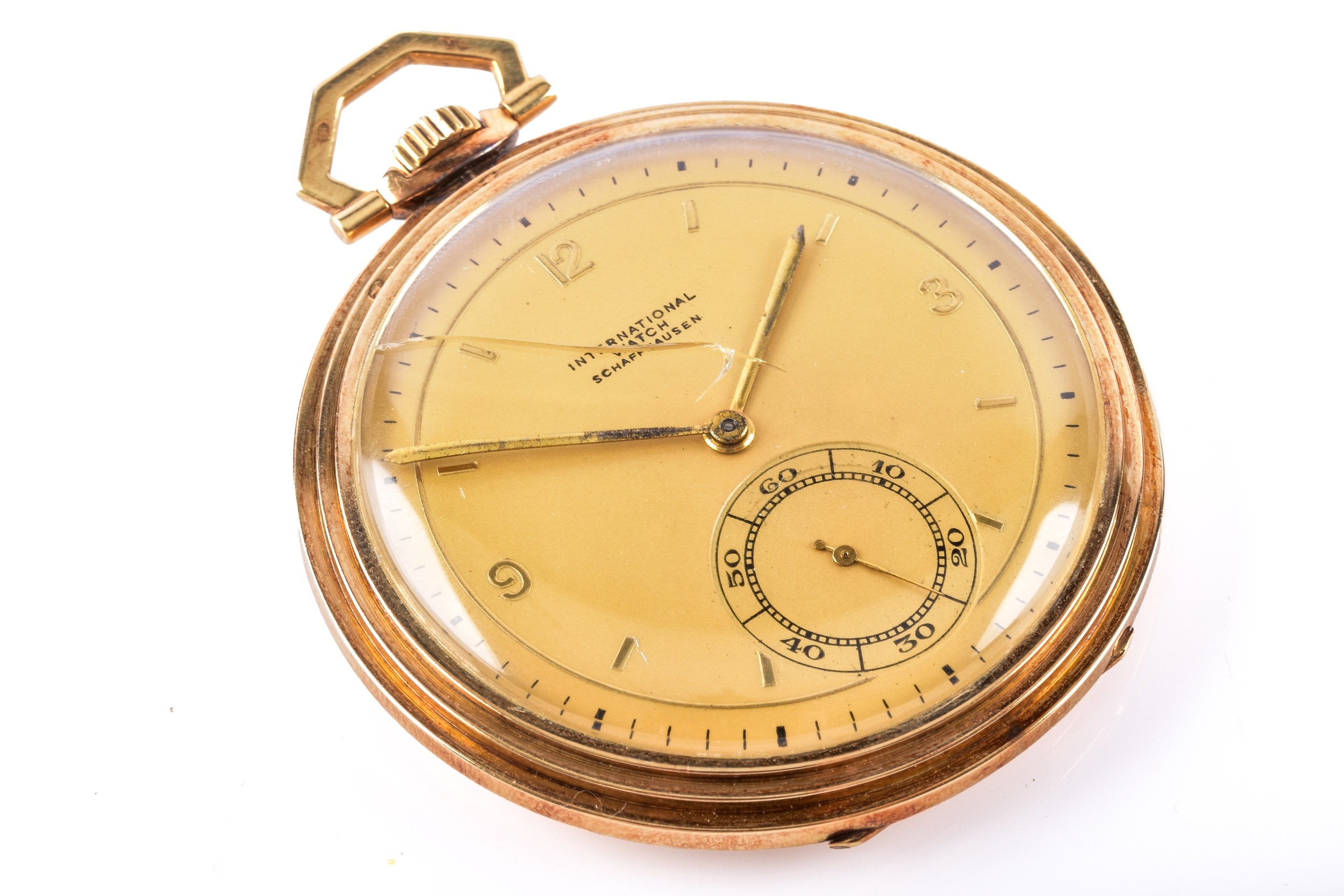 A 14ct gold International Watch Co. (IWC) Schaffhausen pocket watch, Swiss made, featuring a champagne dial with Arabic numerals and baton hour markers, dial signed, subsidiary seconds register at 6 o’clock in a 14ct yellow gold case with ridged bezel detail and a hexagonal bale, hallmarked 14k 0.585, numbered 958719, movement 928055, 48 mm case size, accompanied by a box and paperwork, with archive extract, purchased in 1934. Later painted dial.