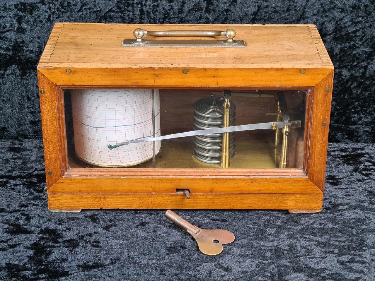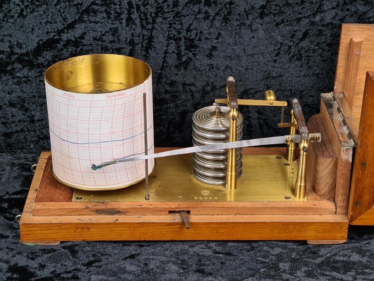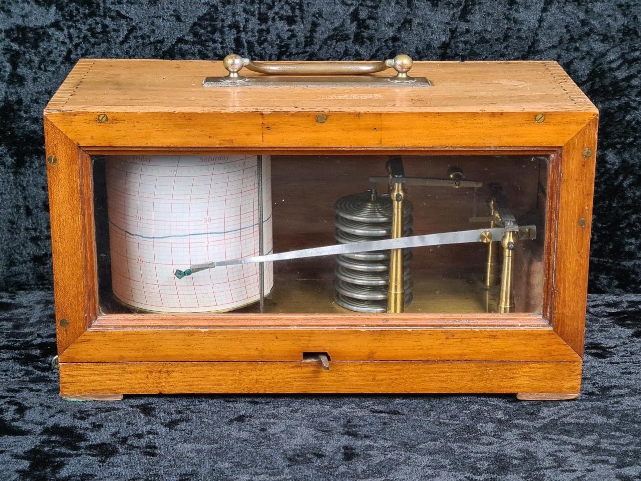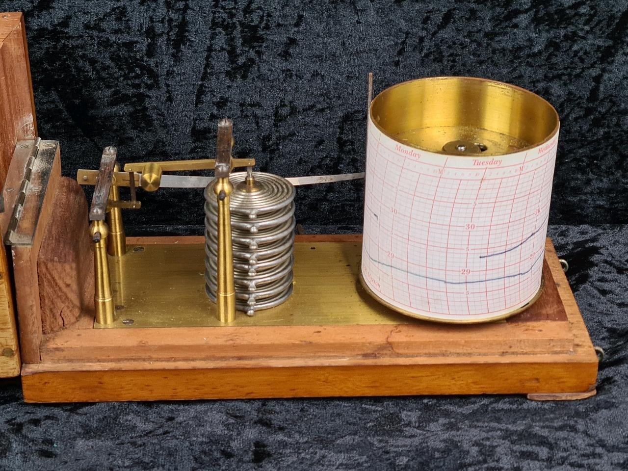 Antique recording barograph, used to measure and visually record changes in atmospheric pressure. Has a serial number engraved on the brass 34292.