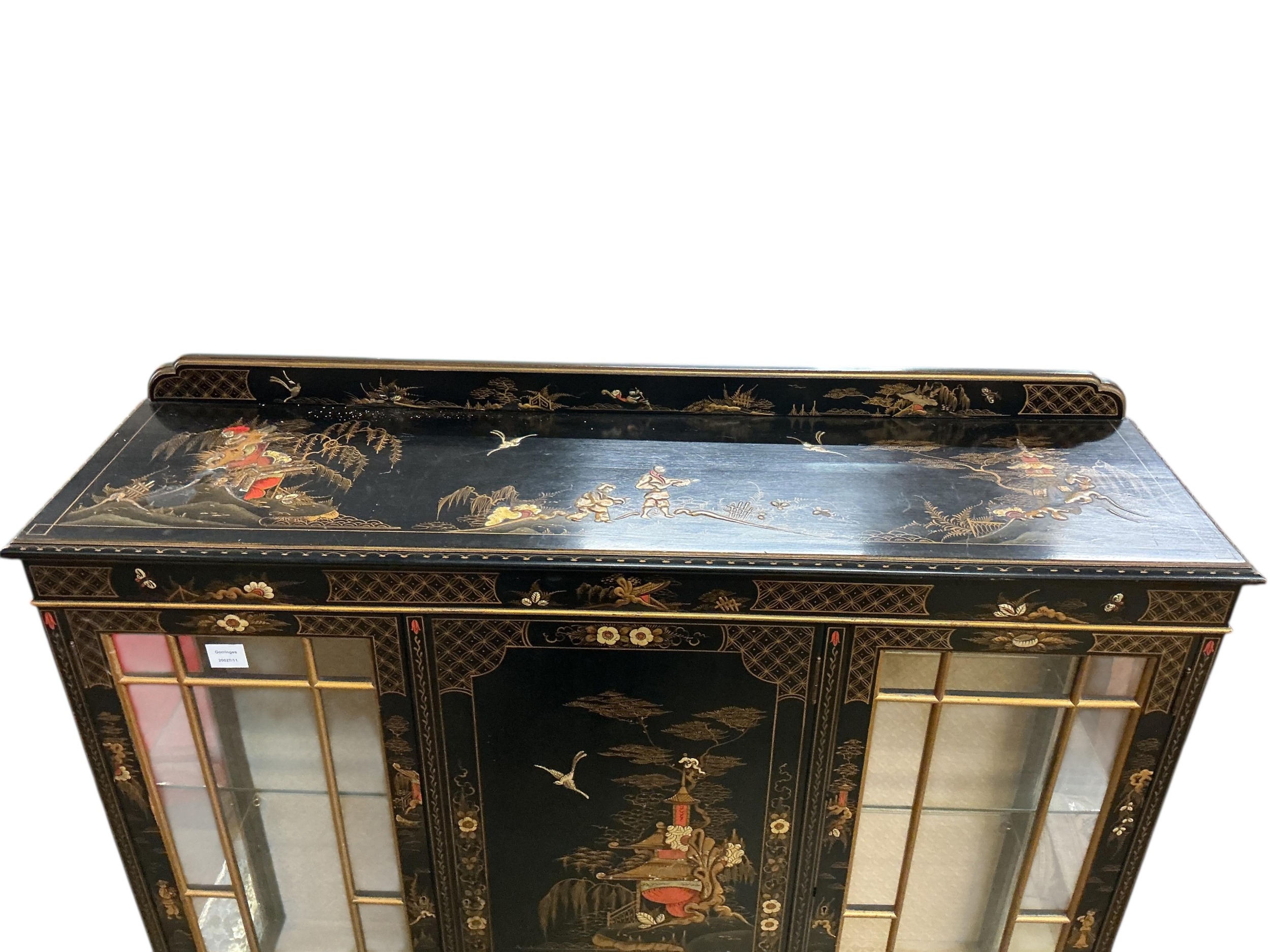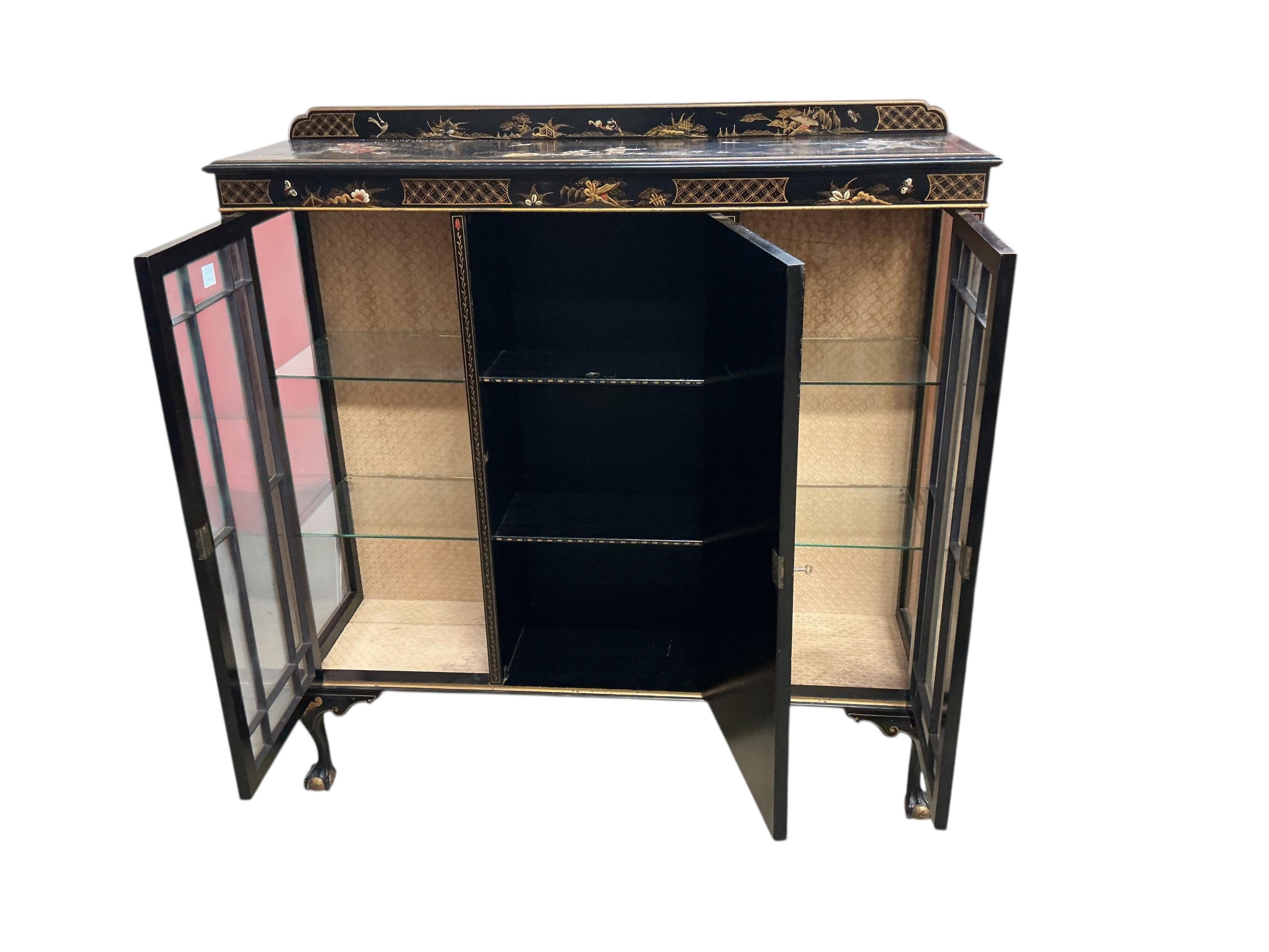 An early 20th century chinoiserie lacquer display cabinet, width 124cm, depth 34cm, height 130cm