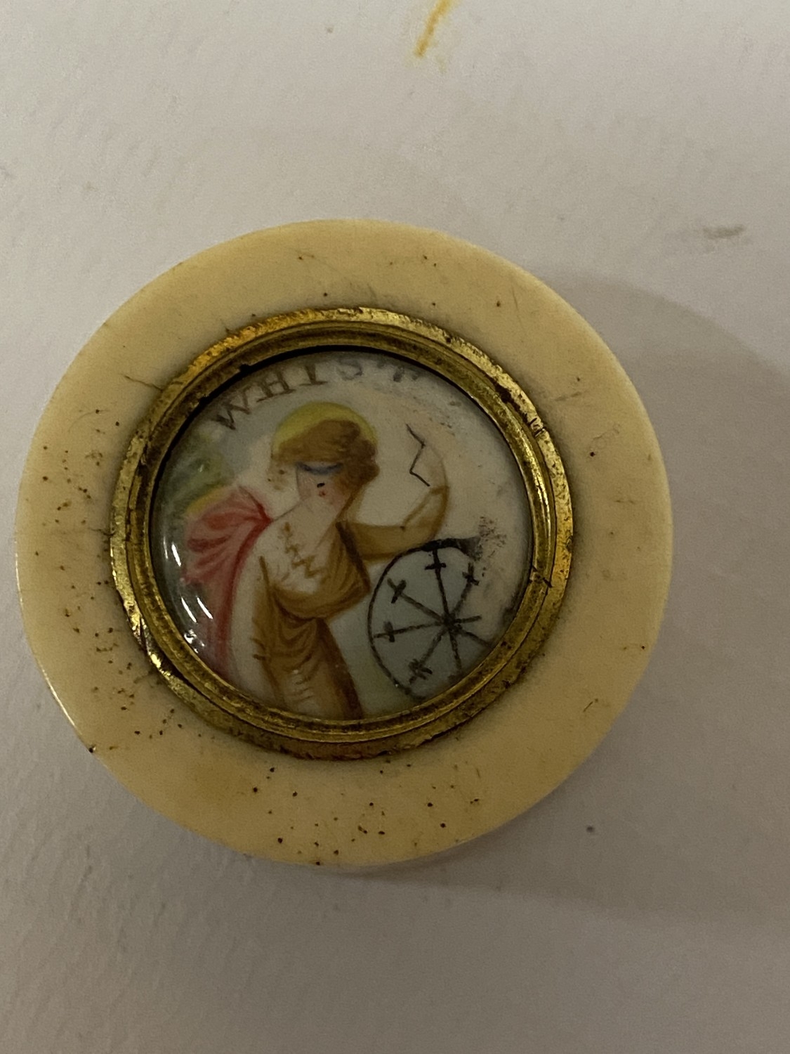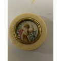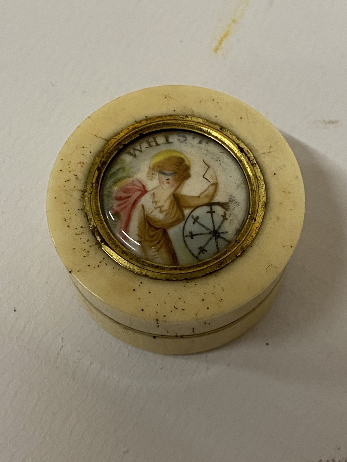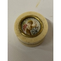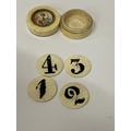 AN ANTIQUE MINIATURE BONE COUNTER HODER WITH PORTRAIT TO THE LID, CONTAINS COUNTERS