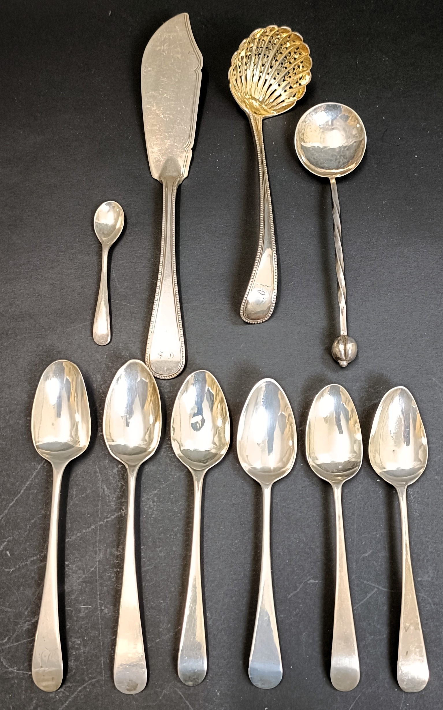 A silver Old English pattern sifter spoon, and assorted silver flatware, 5.8 ozt