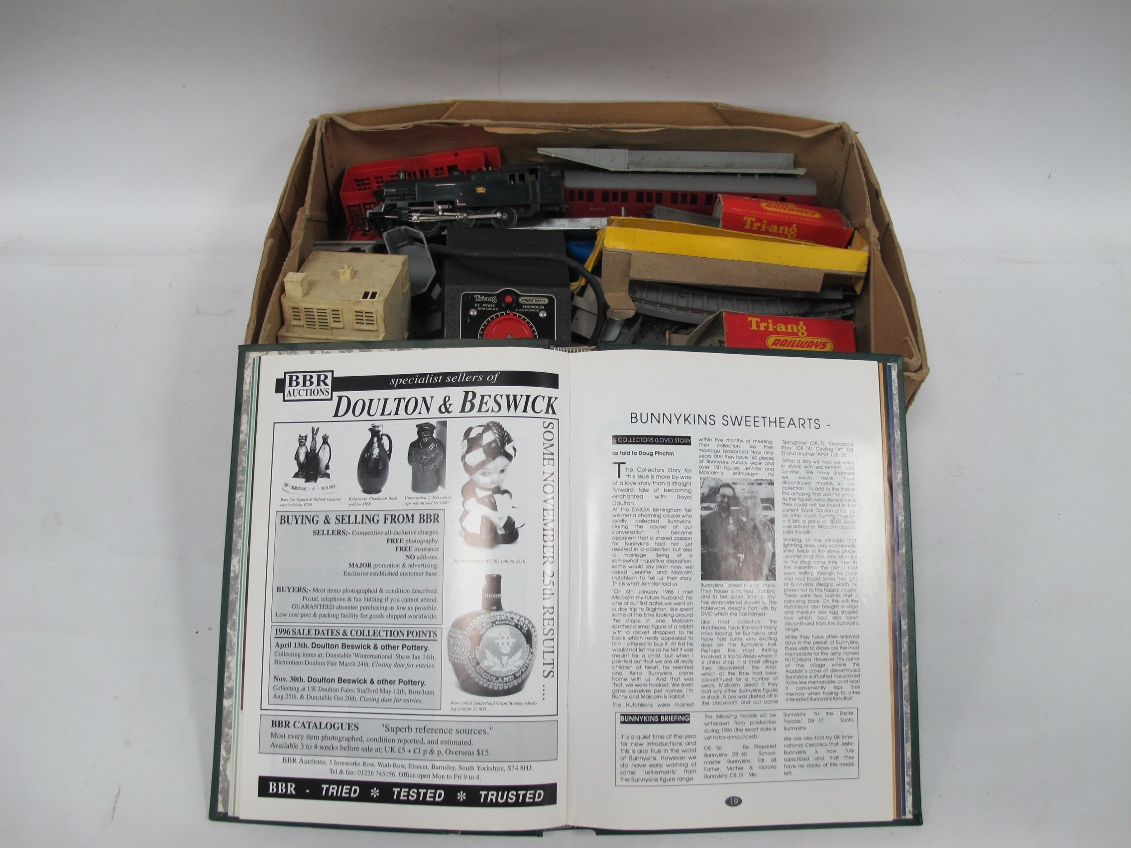 Triang Muar Railway Engine, Carriages, track, buildings, etc:- One Box Davis ploughing scene water-colour.
