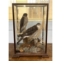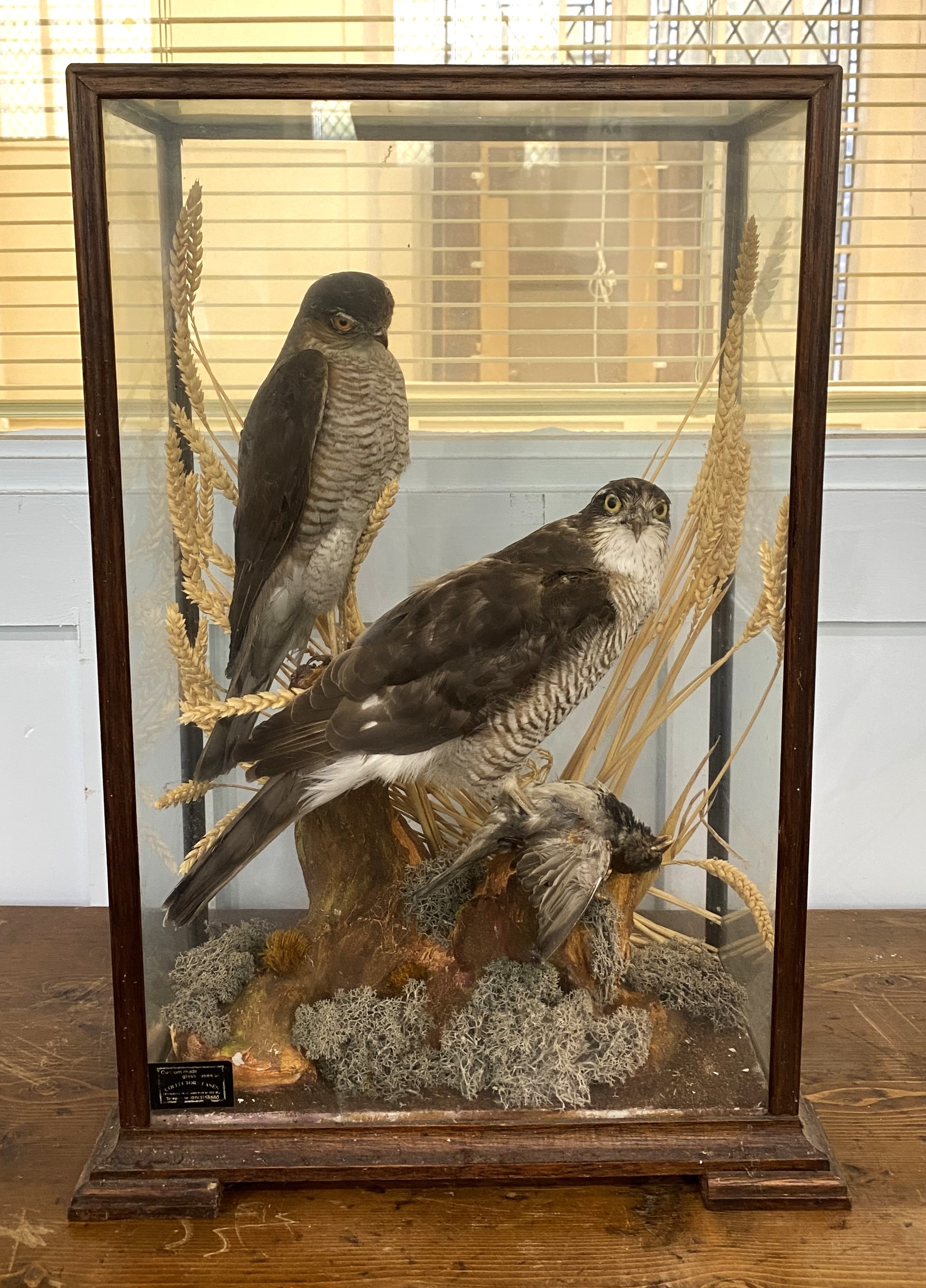 Taxidermy: a Sparrowhawk and a Goshawk, with prey and naturalistic habitat, displayed within a glazed wooden case, 55cm high, 38cm wide 23cm deep.