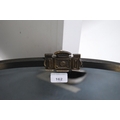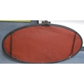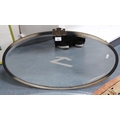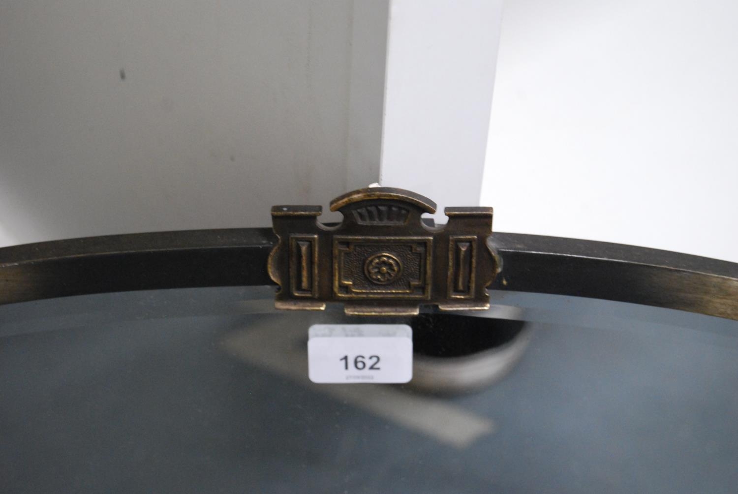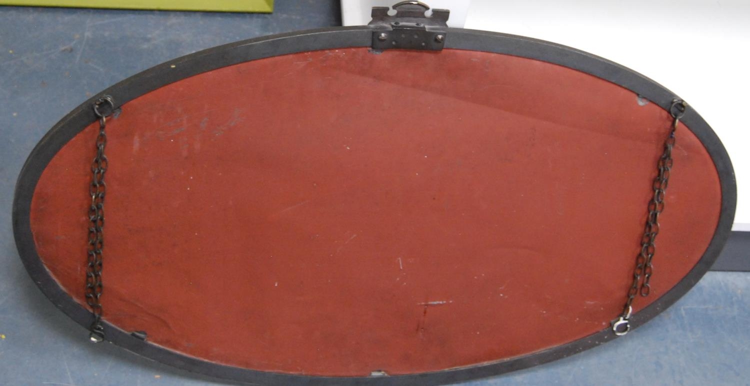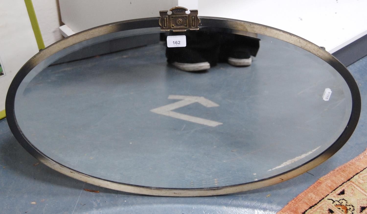 White metal-mounted oval wall mirror.