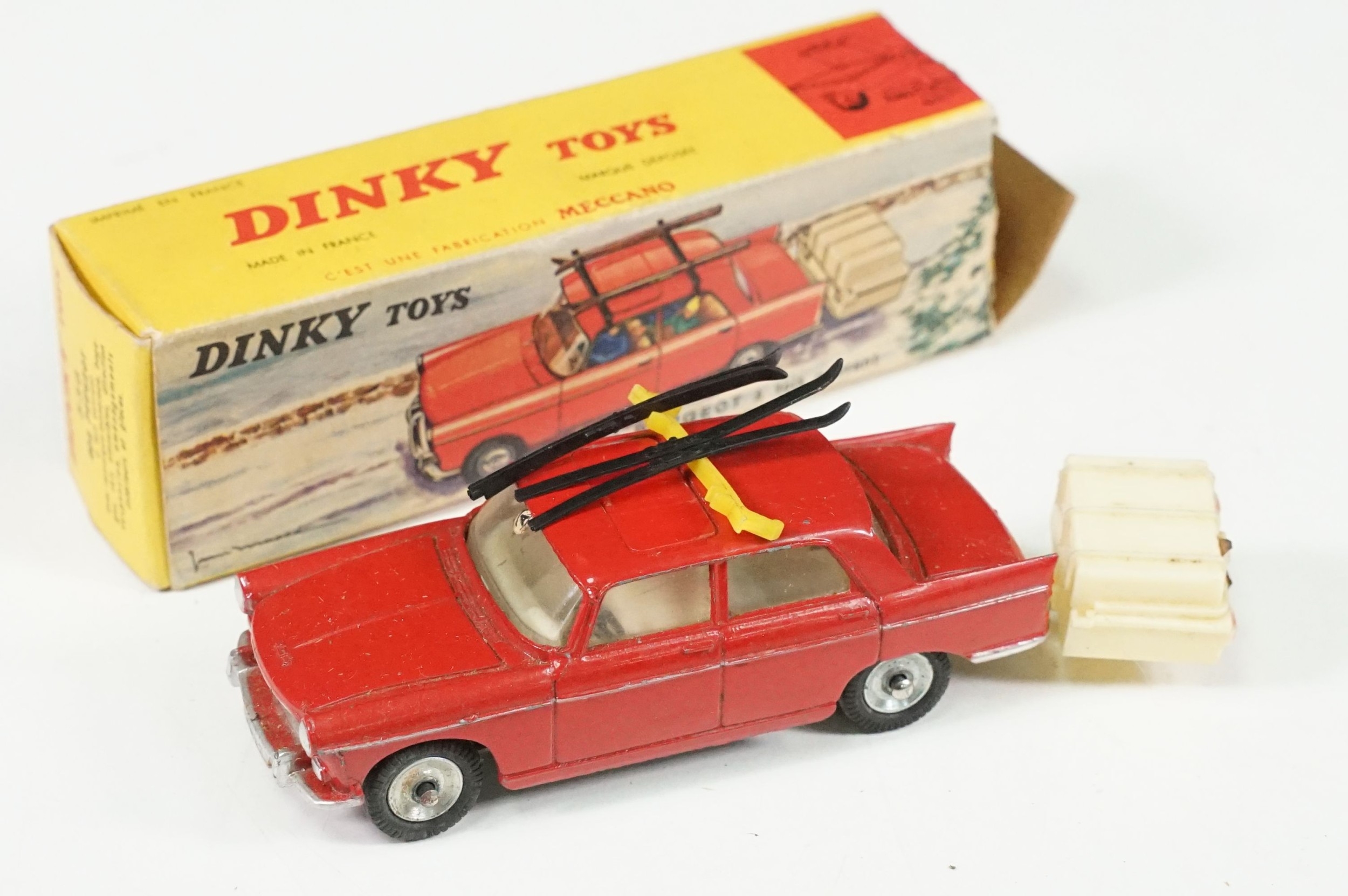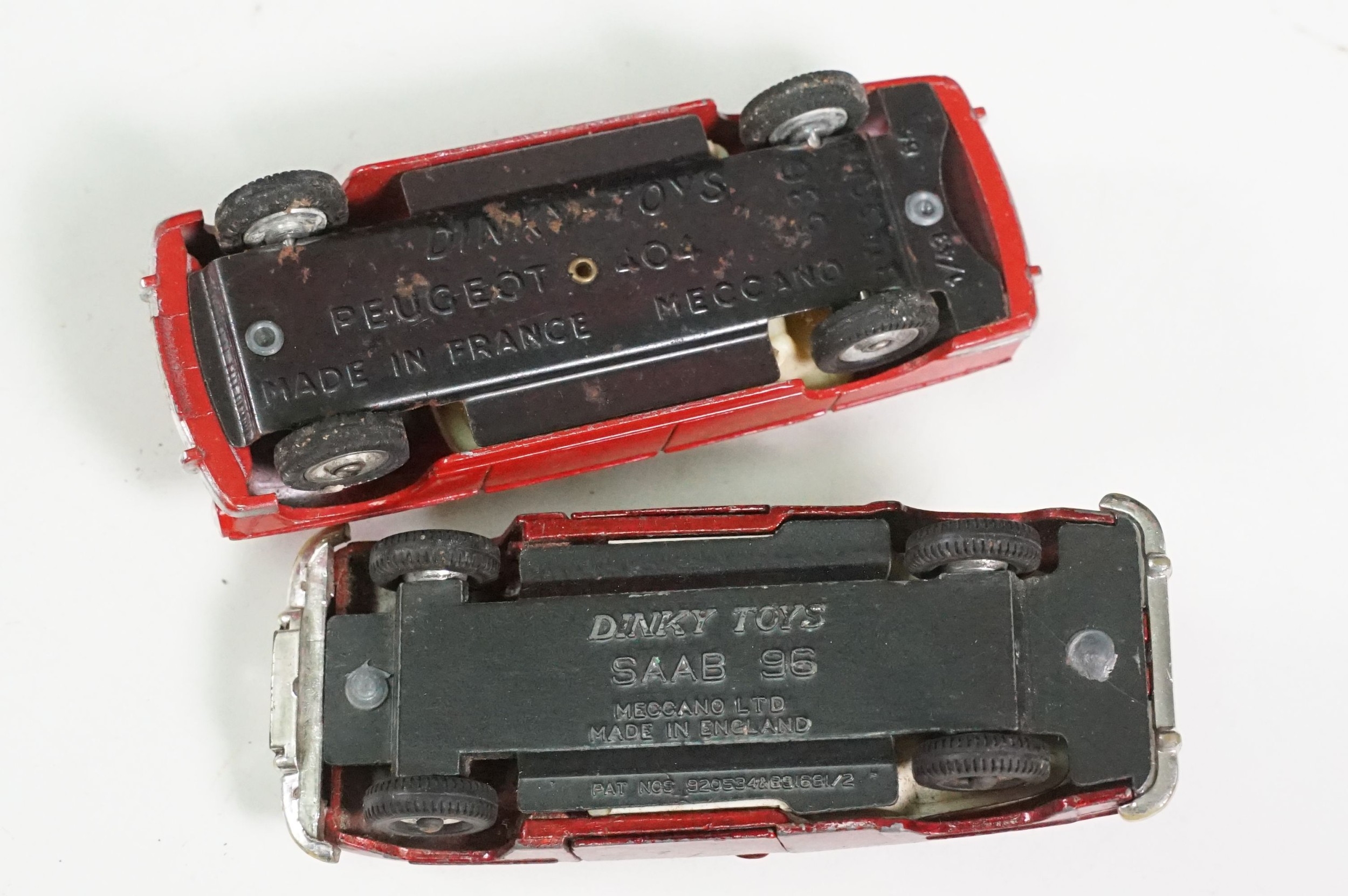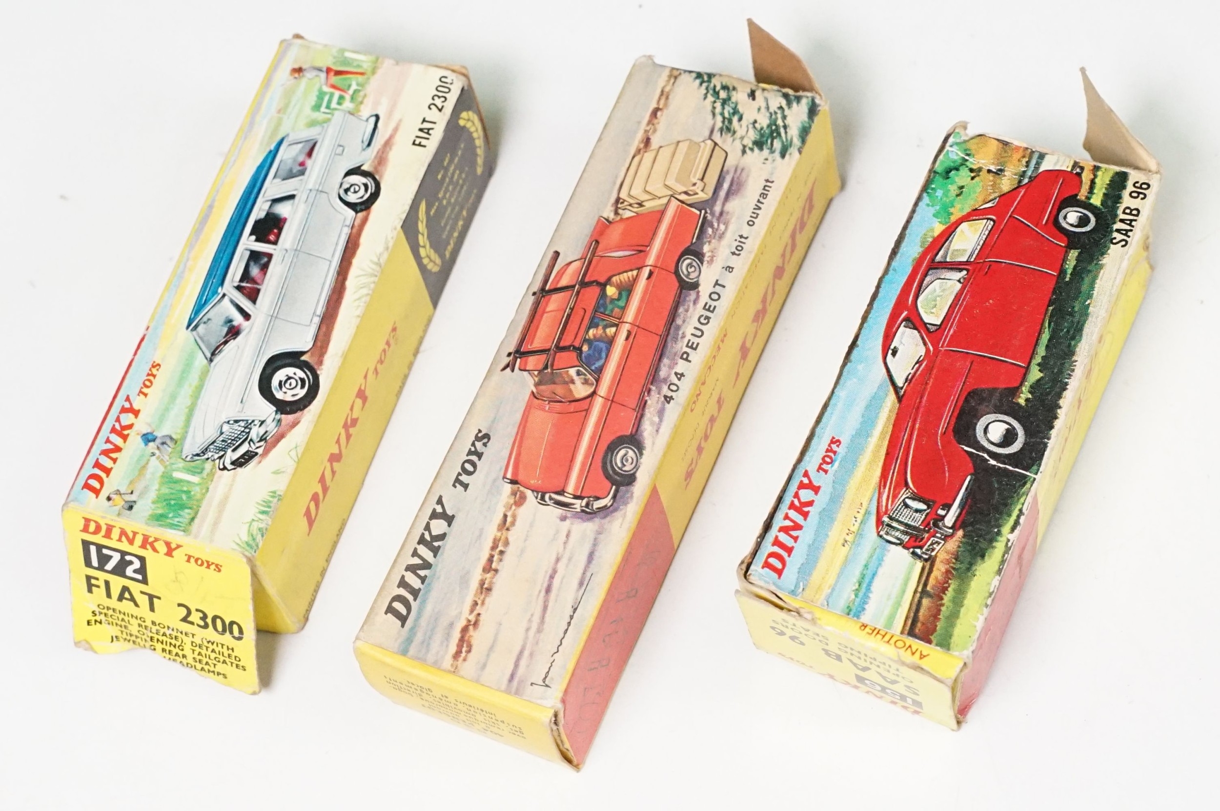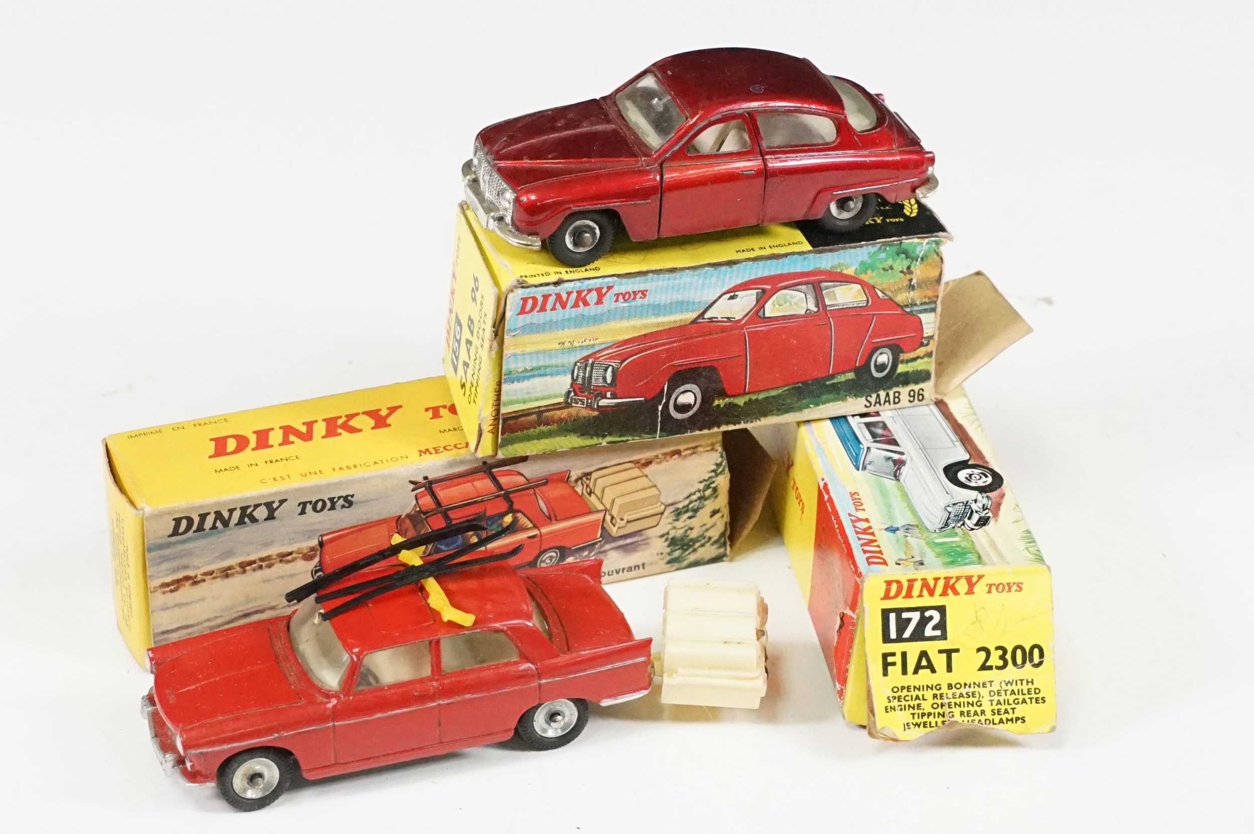 Two boxed Dinky diecast models to include French 536 404 Peugeot in red, with plastic trailer and part of roof rack (box missing end flap) and 156 Saab 96 in red (box missing end flap), and an empty Dinky 172 Fiat 2300 box in fair condition, diecast showing play wear (3)