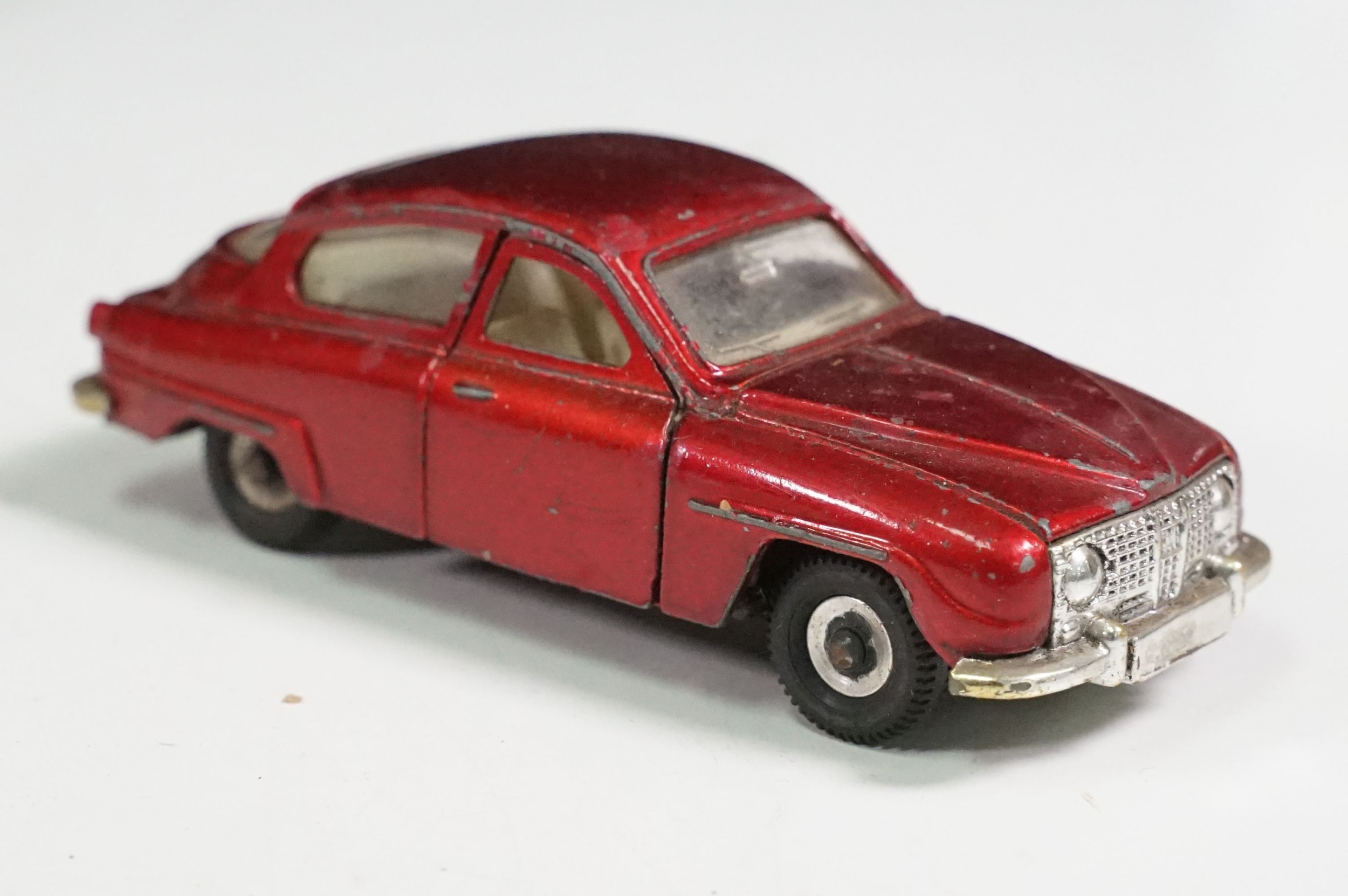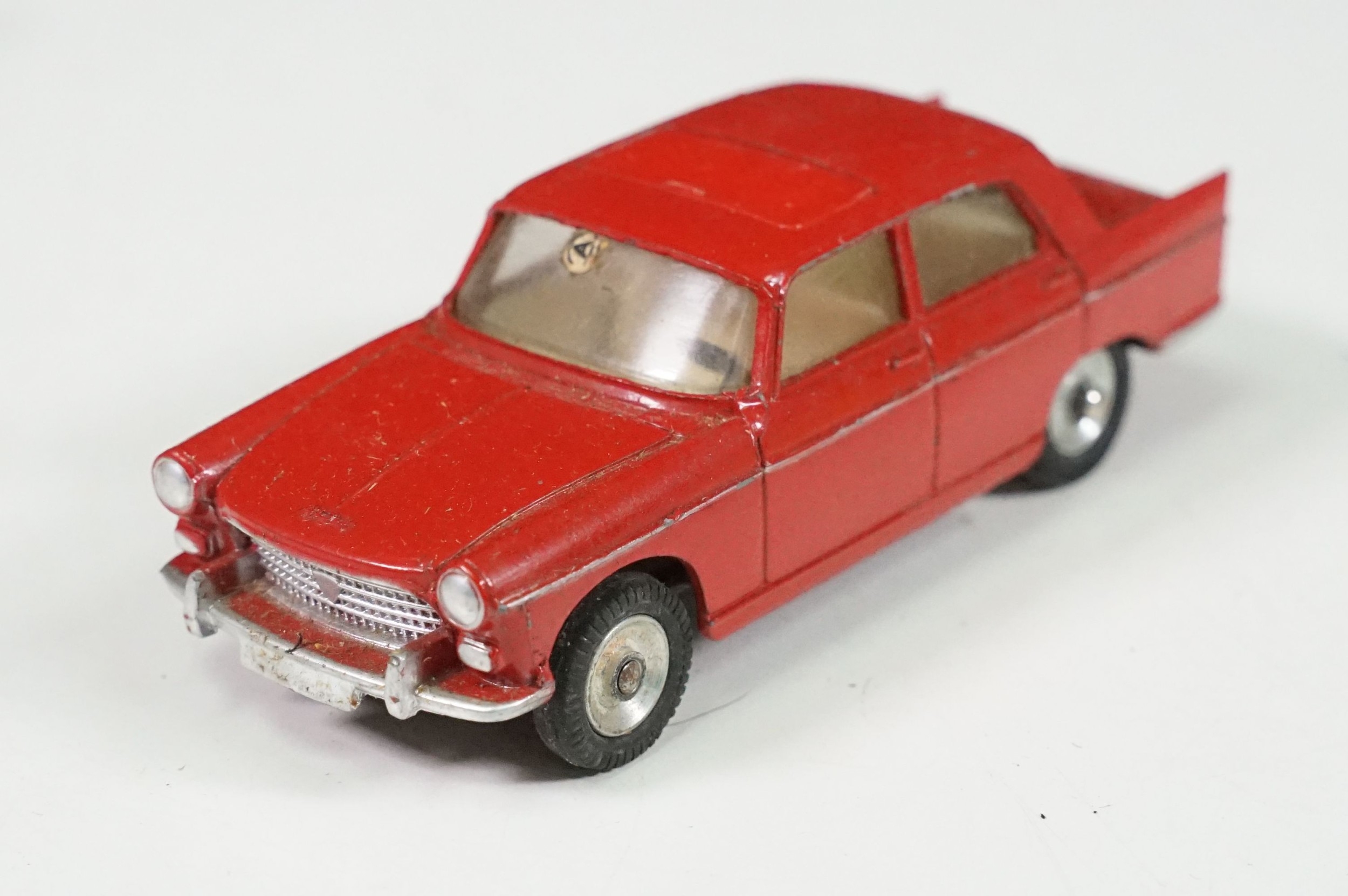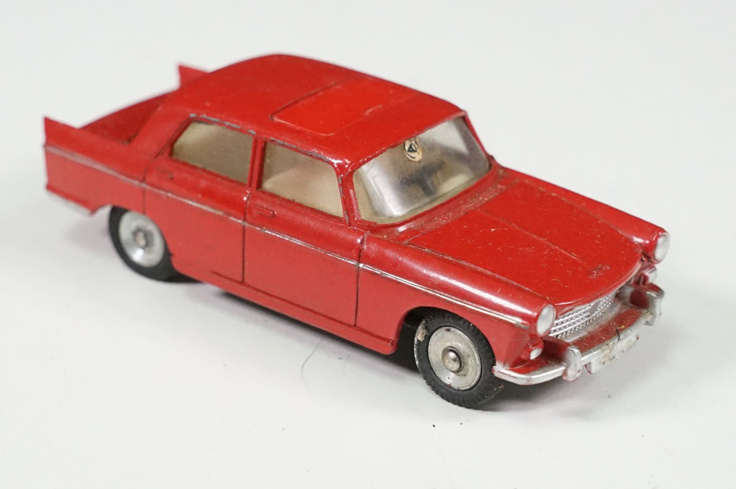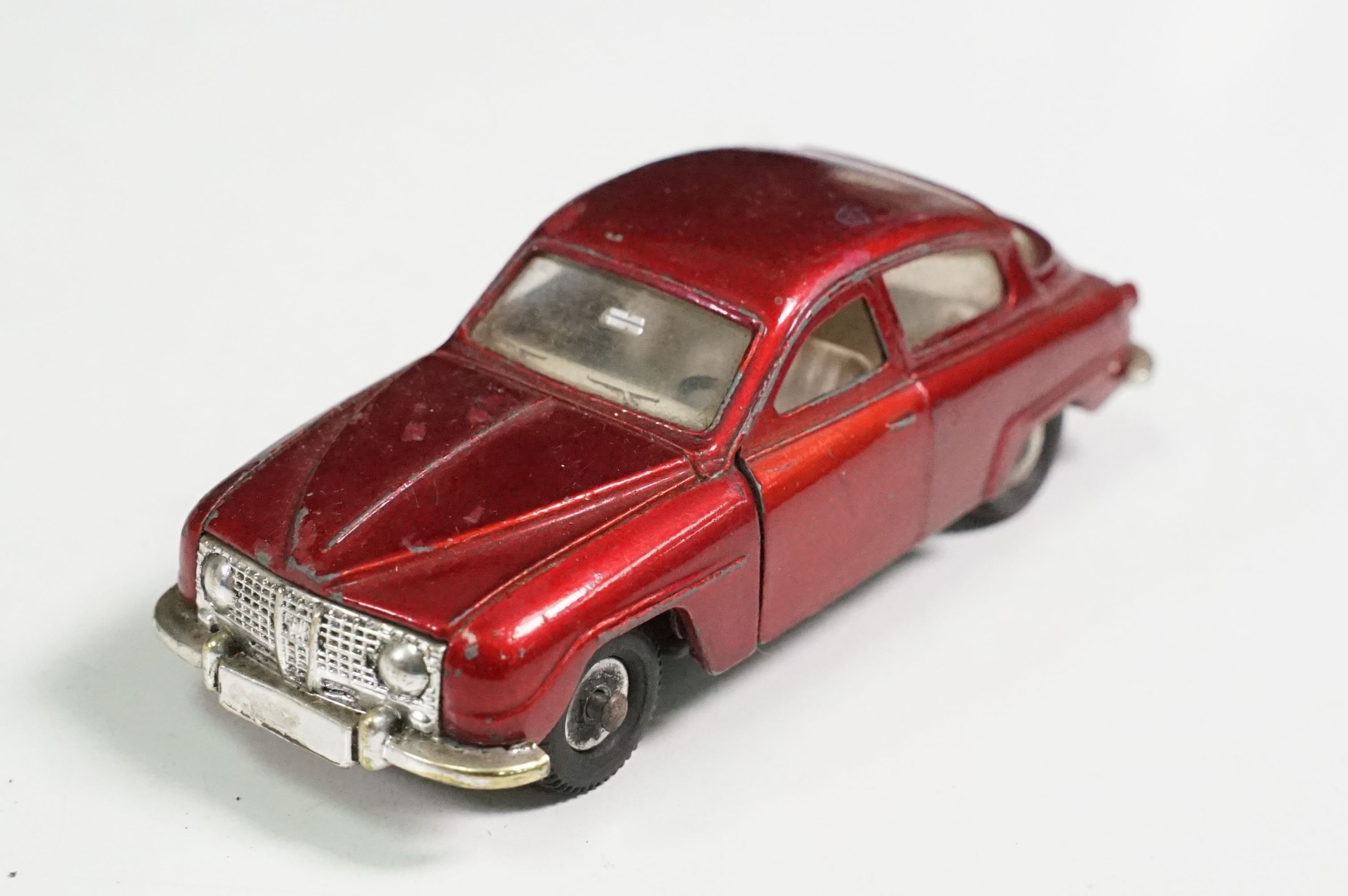 Two boxed Dinky diecast models to include French 536 404 Peugeot in red, with plastic trailer and part of roof rack (box missing end flap) and 156 Saab 96 in red (box missing end flap), and an empty Dinky 172 Fiat 2300 box in fair condition, diecast showing play wear (3)