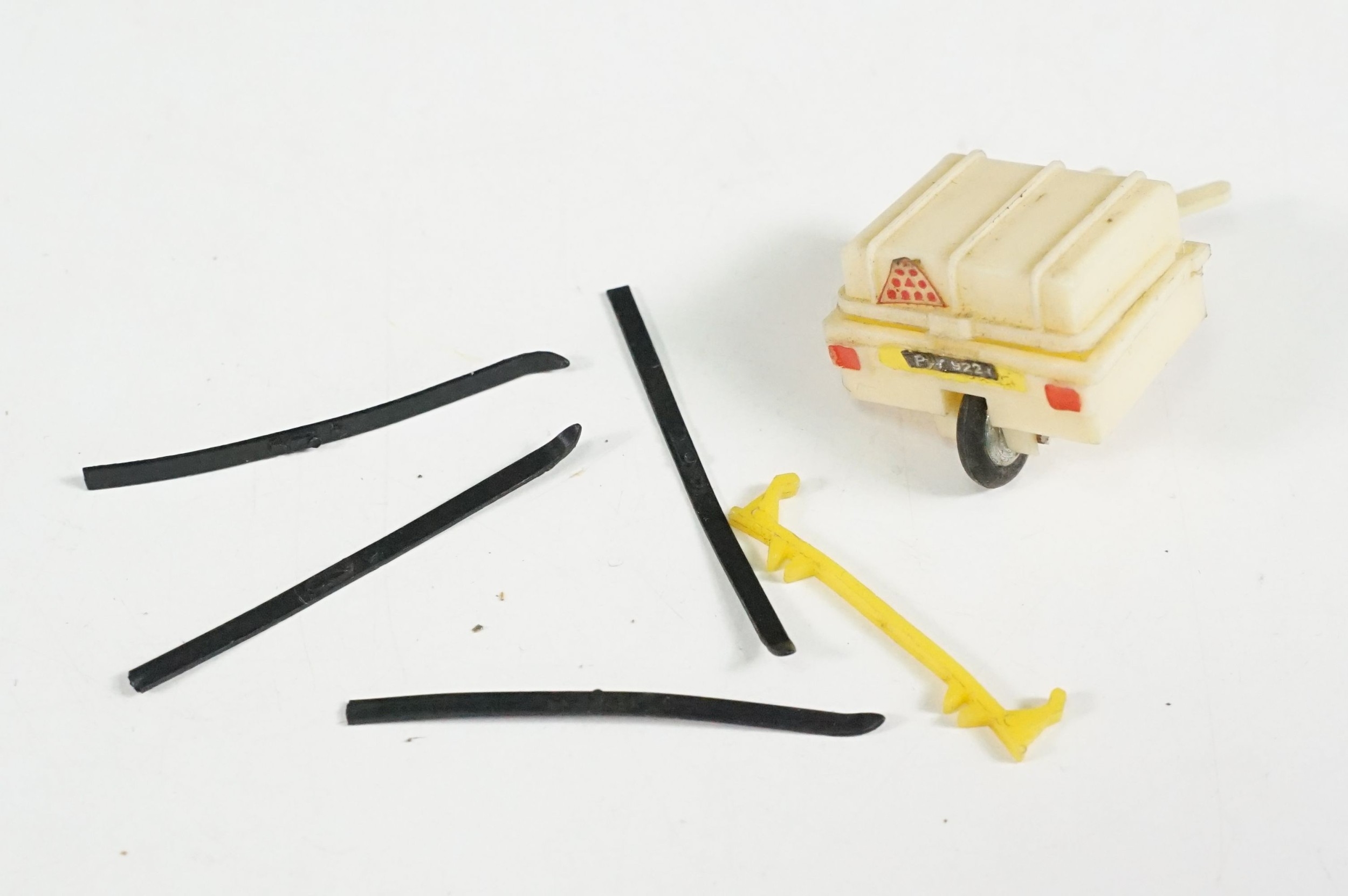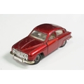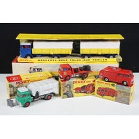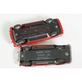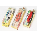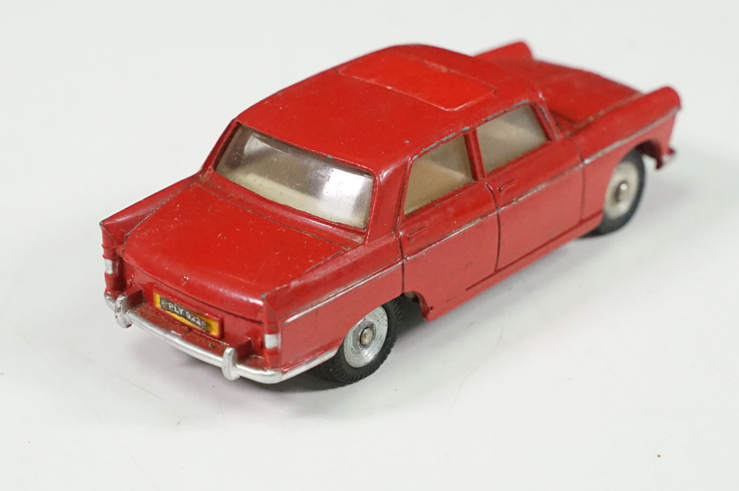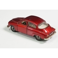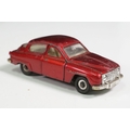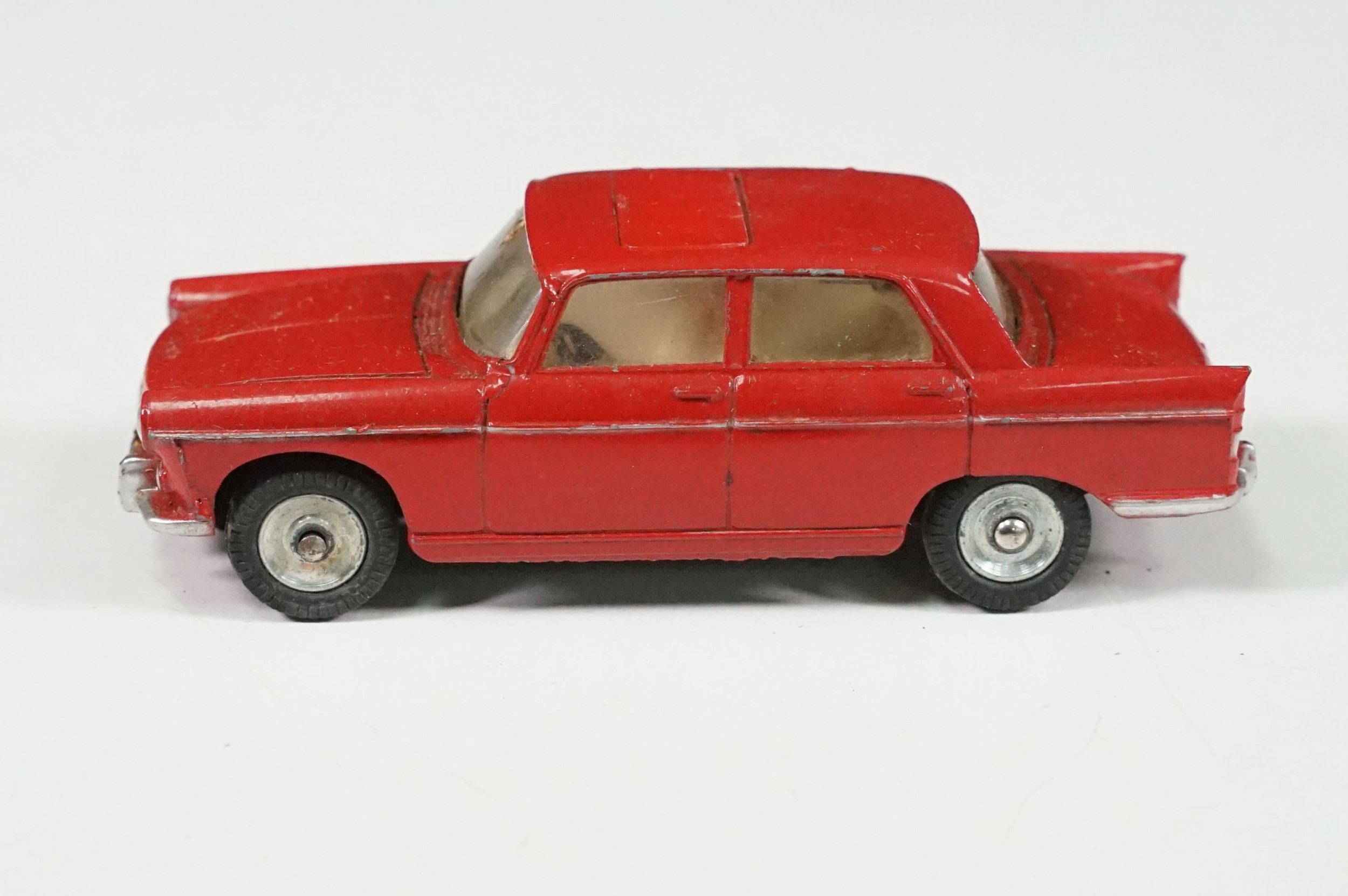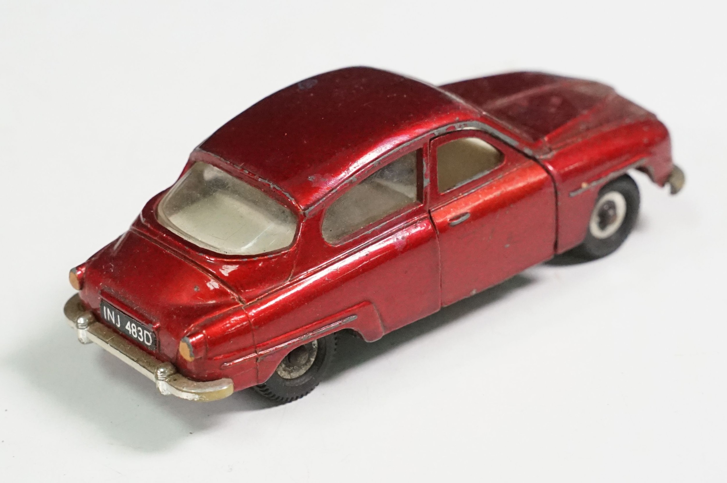 Two boxed Dinky diecast models to include French 536 404 Peugeot in red, with plastic trailer and part of roof rack (box missing end flap) and 156 Saab 96 in red (box missing end flap), and an empty Dinky 172 Fiat 2300 box in fair condition, diecast showing play wear (3)