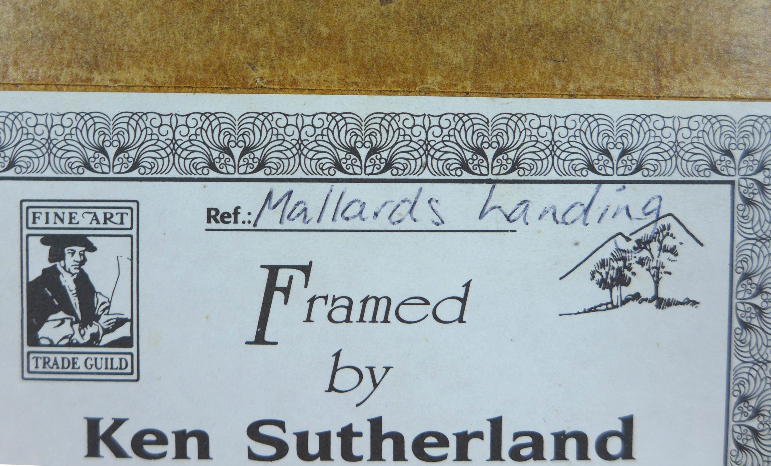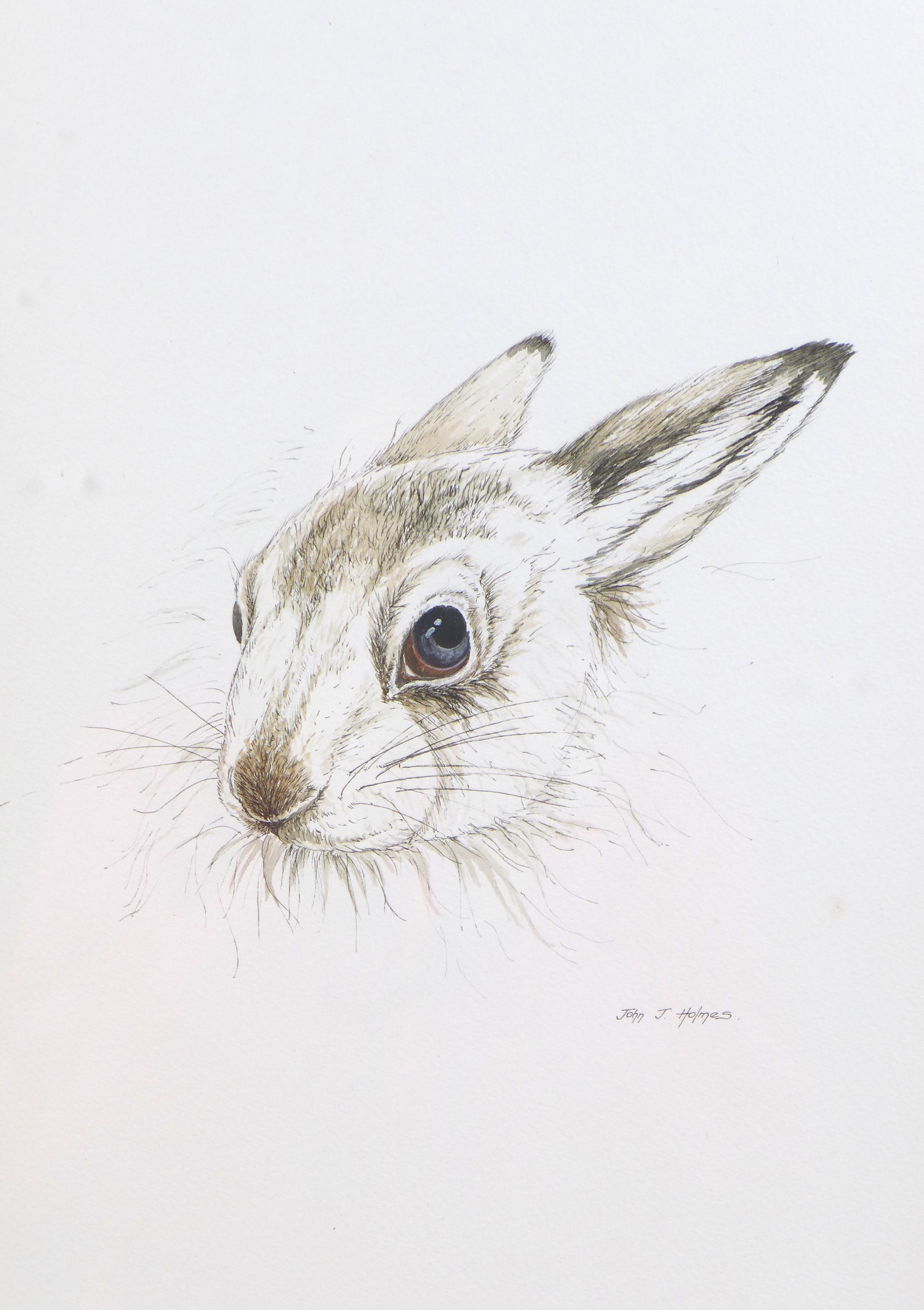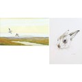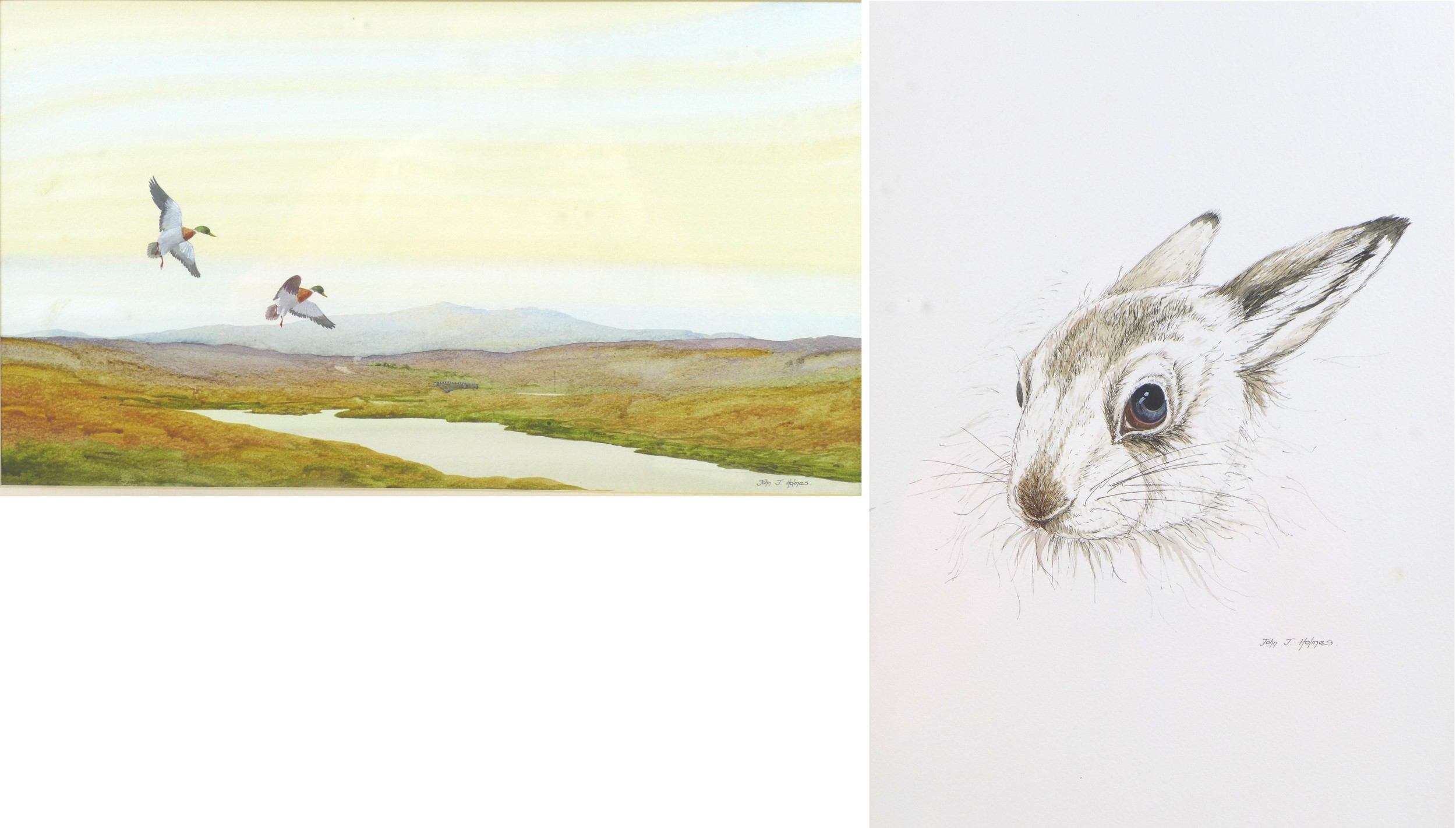 John T Holmes (British, b.1937): Two wildlife pictures, 'Mallards Landing', watercolour, signed lower right corner, together with a pen and ink drawing of a hare's face, signed lower right. (2)