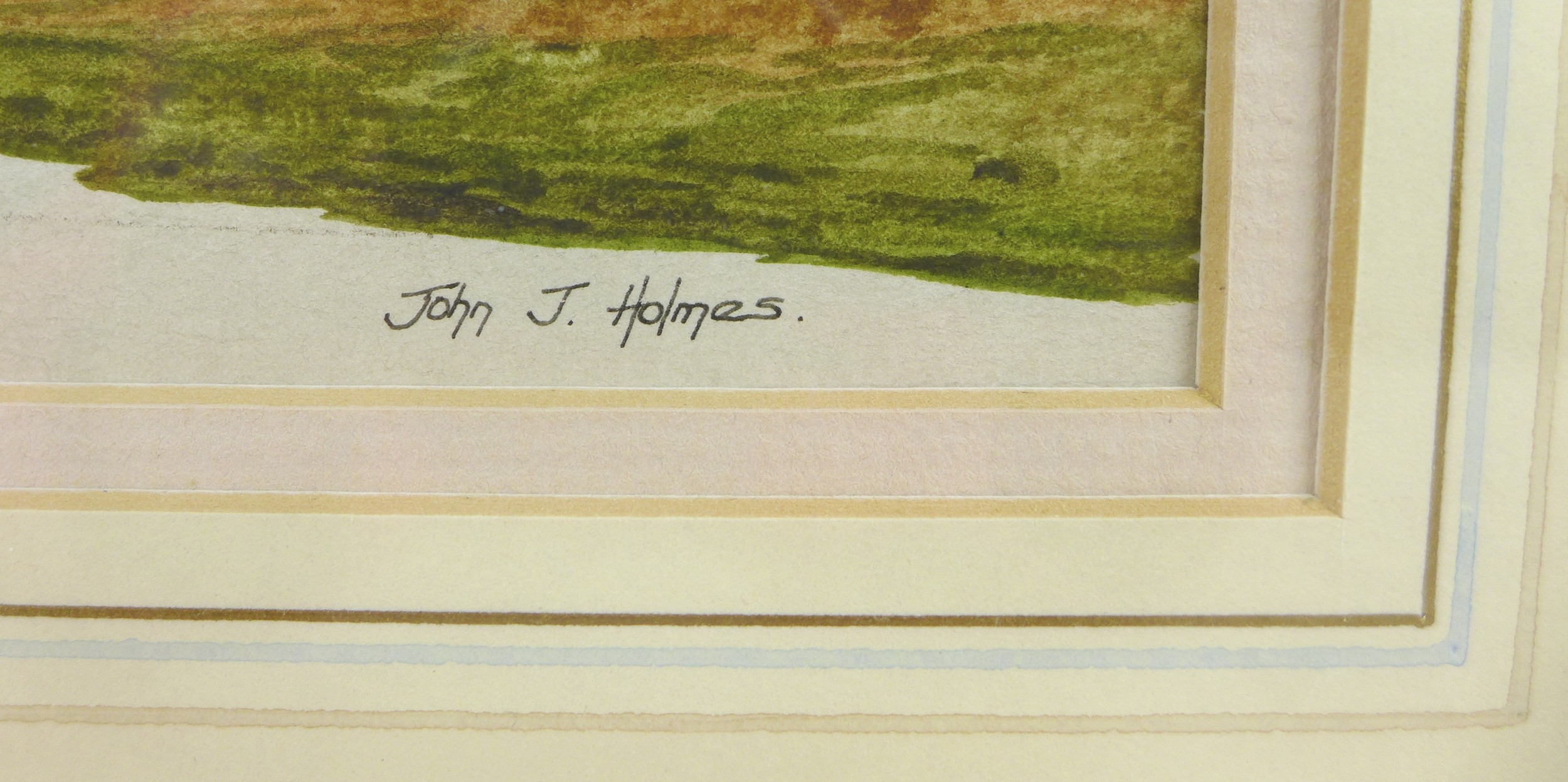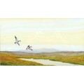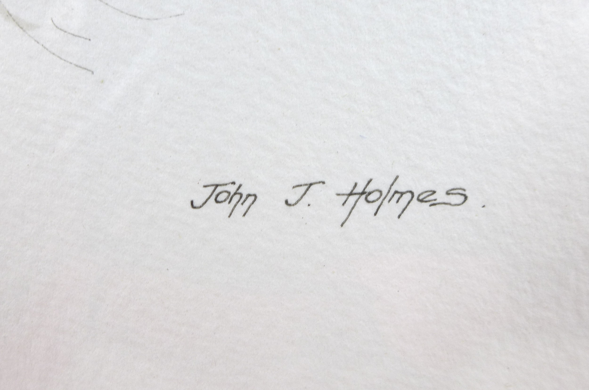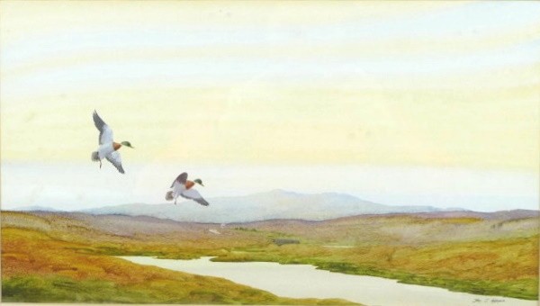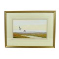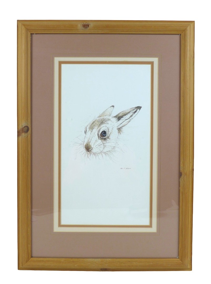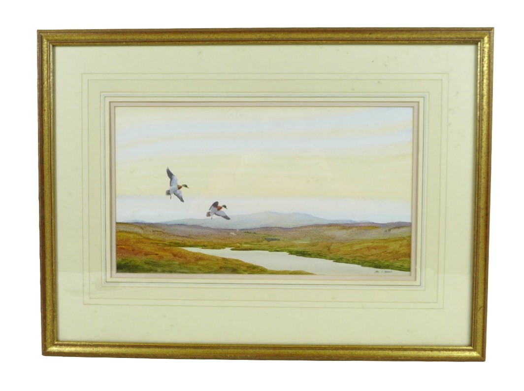 John T Holmes (British, b.1937): Two wildlife pictures, 'Mallards Landing', watercolour, signed lower right corner, together with a pen and ink drawing of a hare's face, signed lower right. (2)