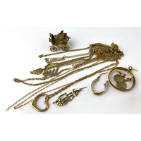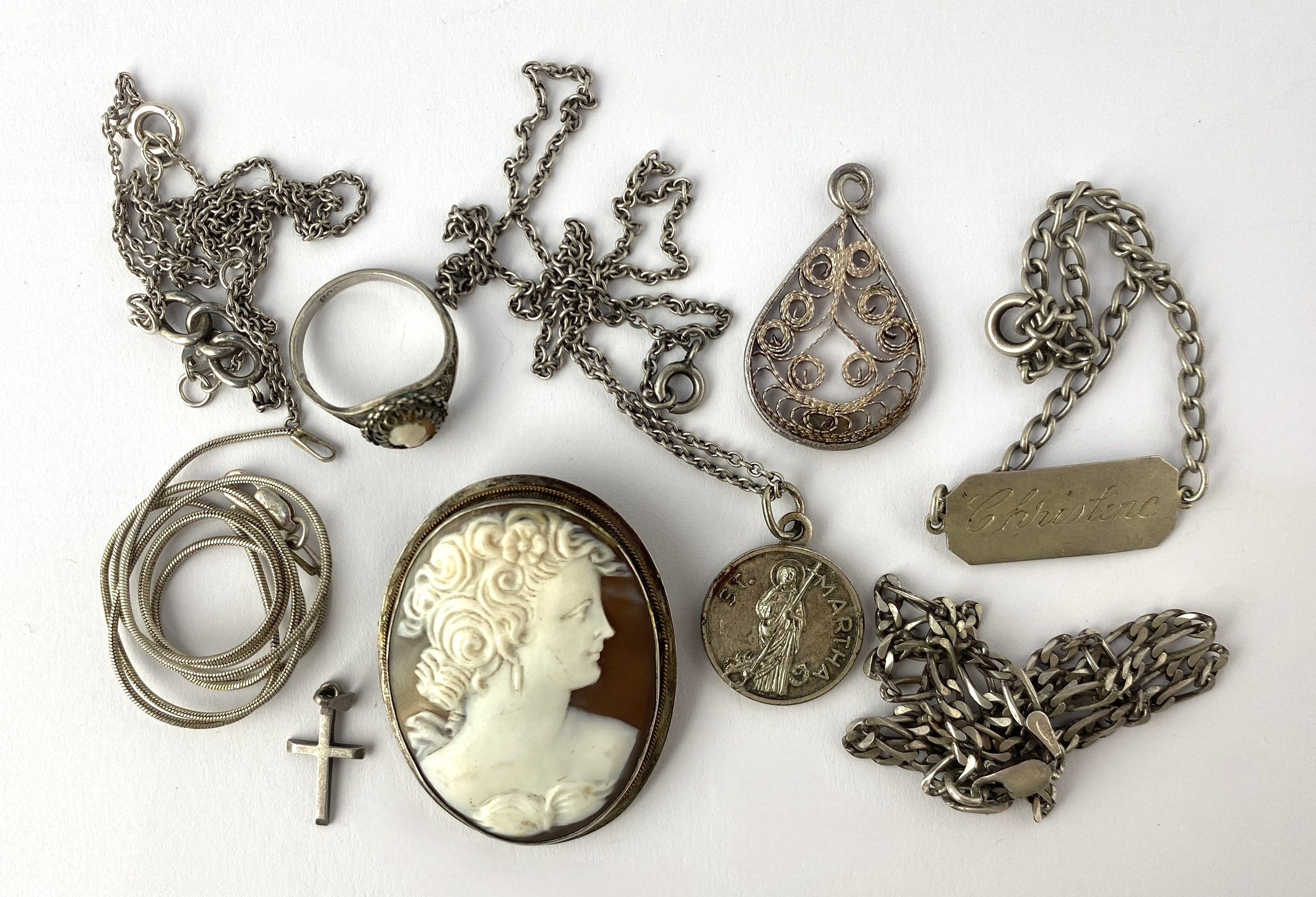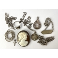 A small group of mostly silver jewellery to include a shell cameo pendant brooch, a ring, a bracelet, and four neckchains