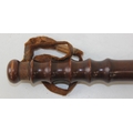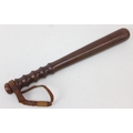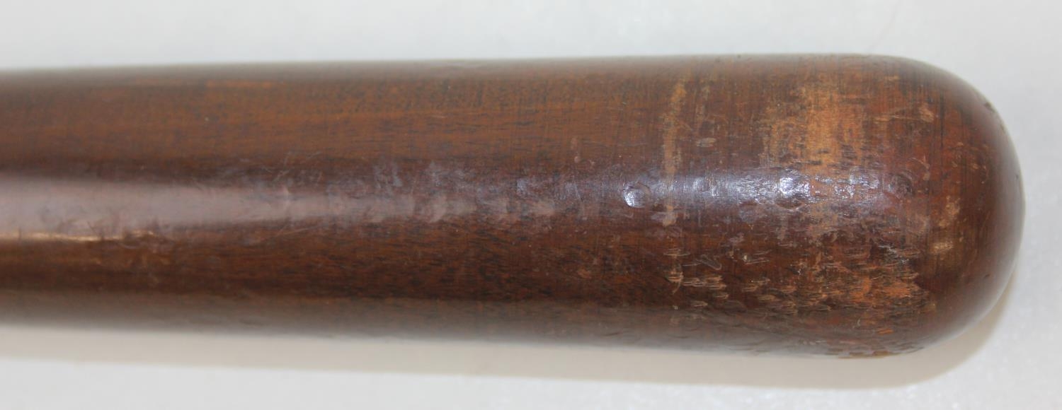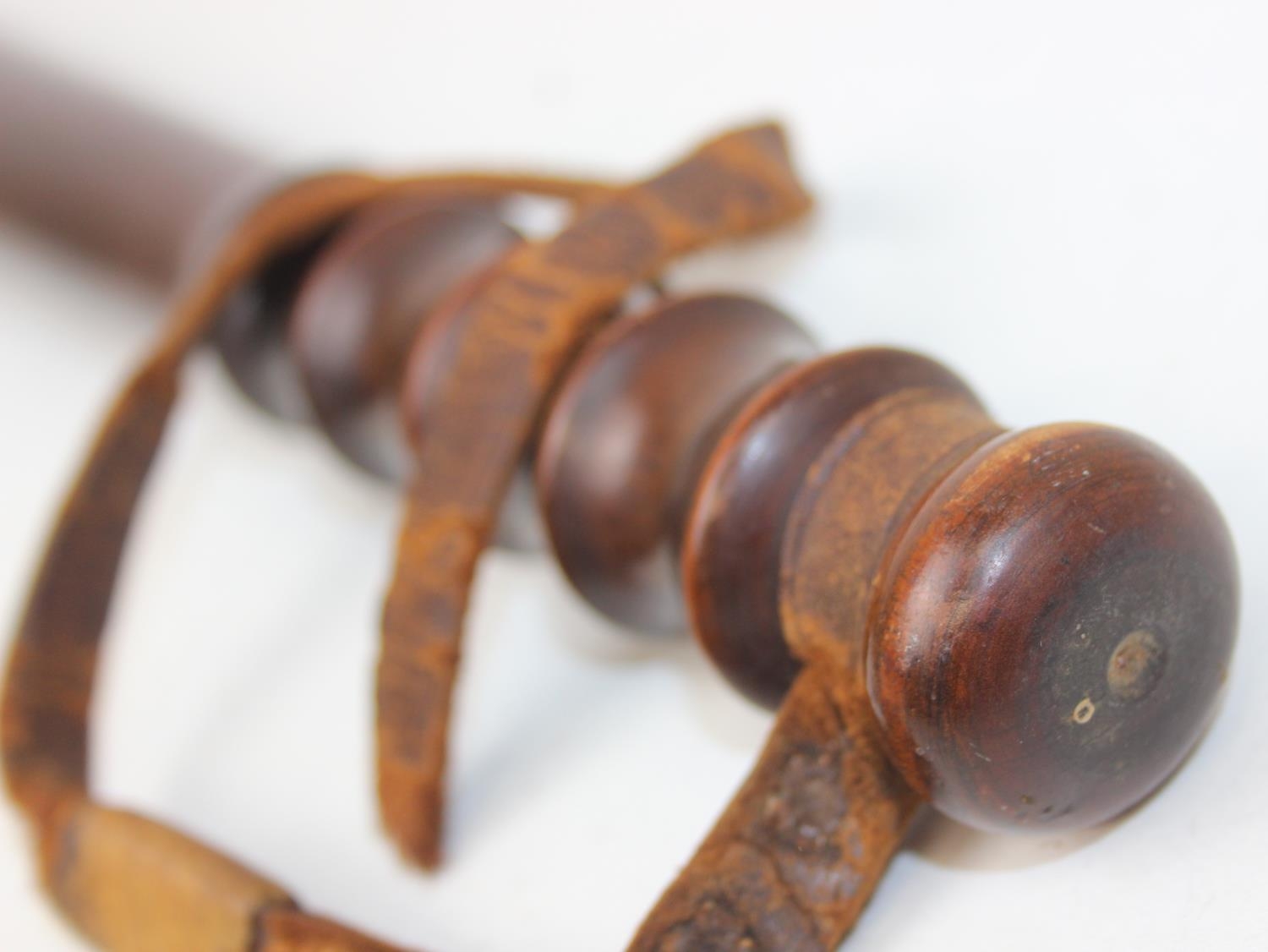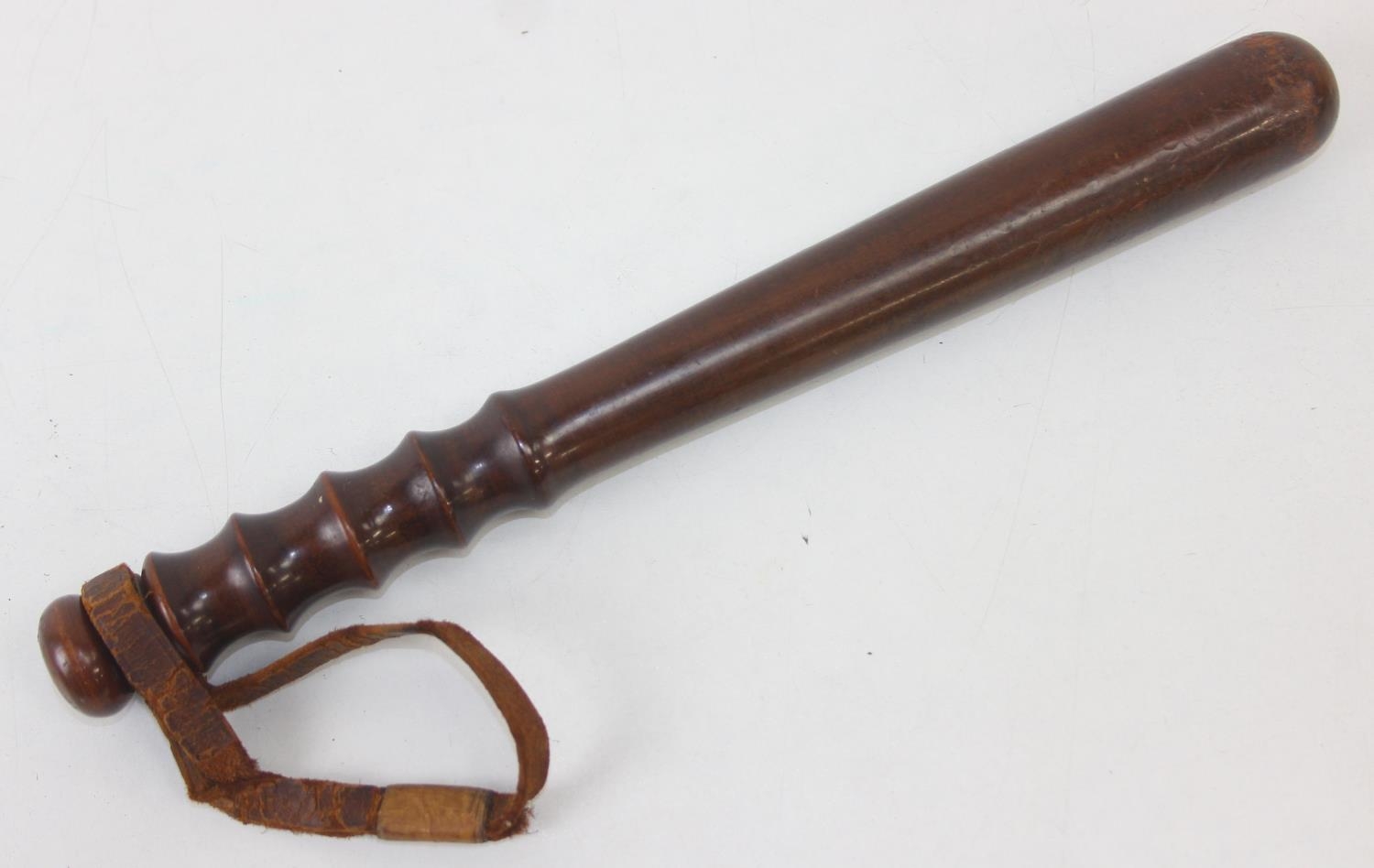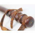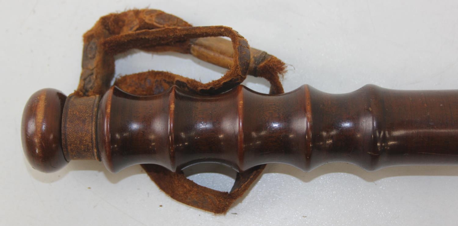 An early 20th century turned wooden Military Police truncheon with partial leather strap, marked MP, 39cm long