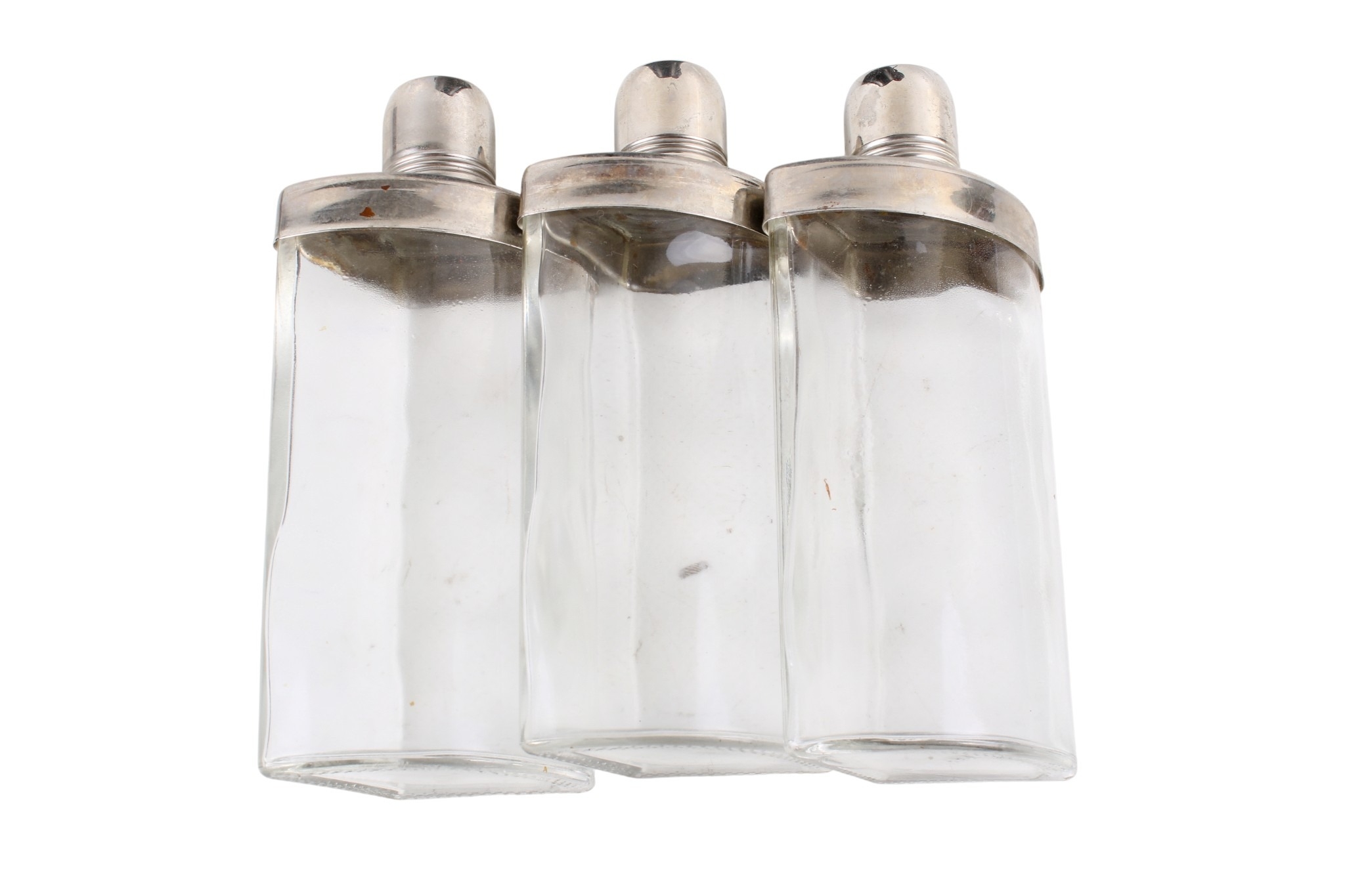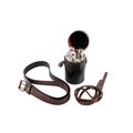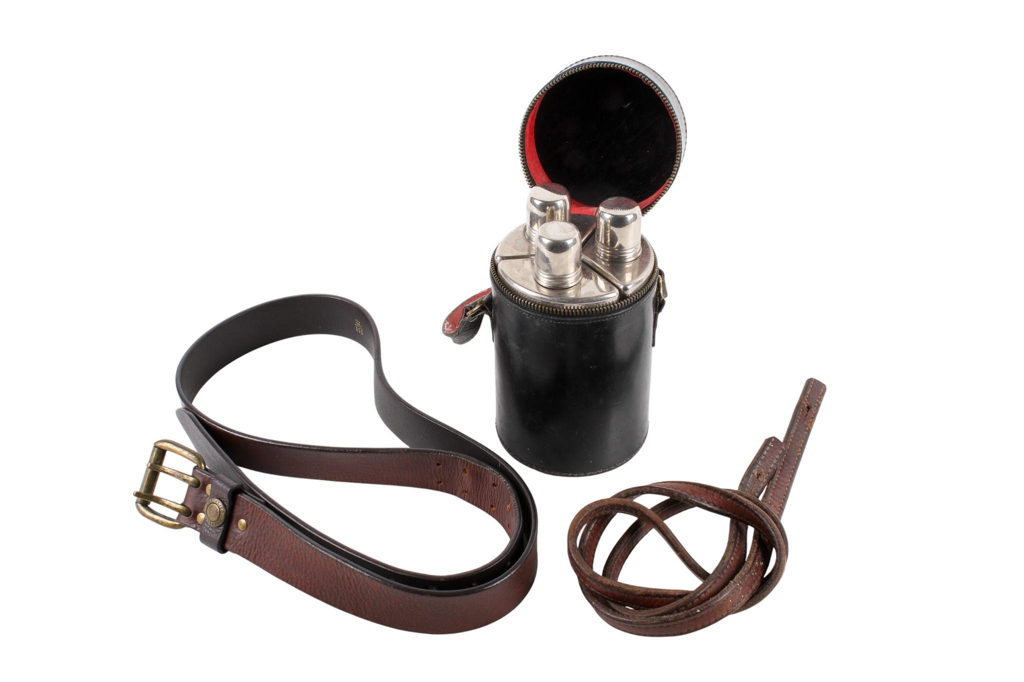 An assortment of hunting equipment. Comprising a set of three glass flasks contained within a leather carry case and a man's Chevalier brown leather belt 135cm long. Max. H18cm