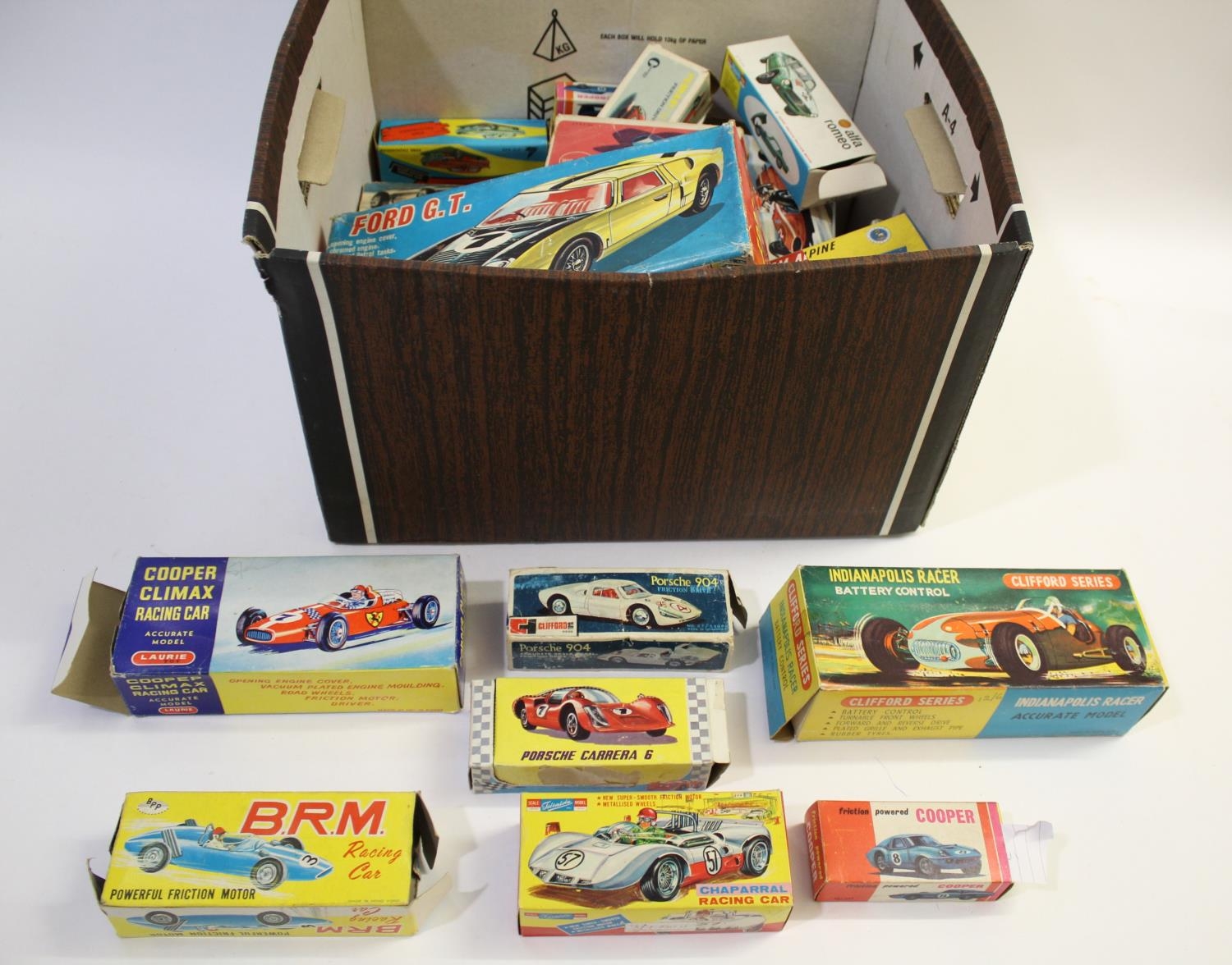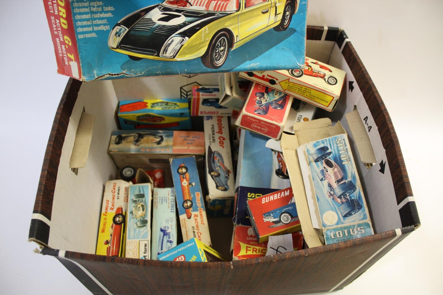 HONG KONG PLASTIC RACING CARS 15 boxed Hong Kong made racing cars, including approx 1/18 scale Ford GT, friction drive MAKS Vanwall, and Lucky Lotus Grand Prix Racer. Together with 7 models in incorrect boxes, and a selection of empty boxes.