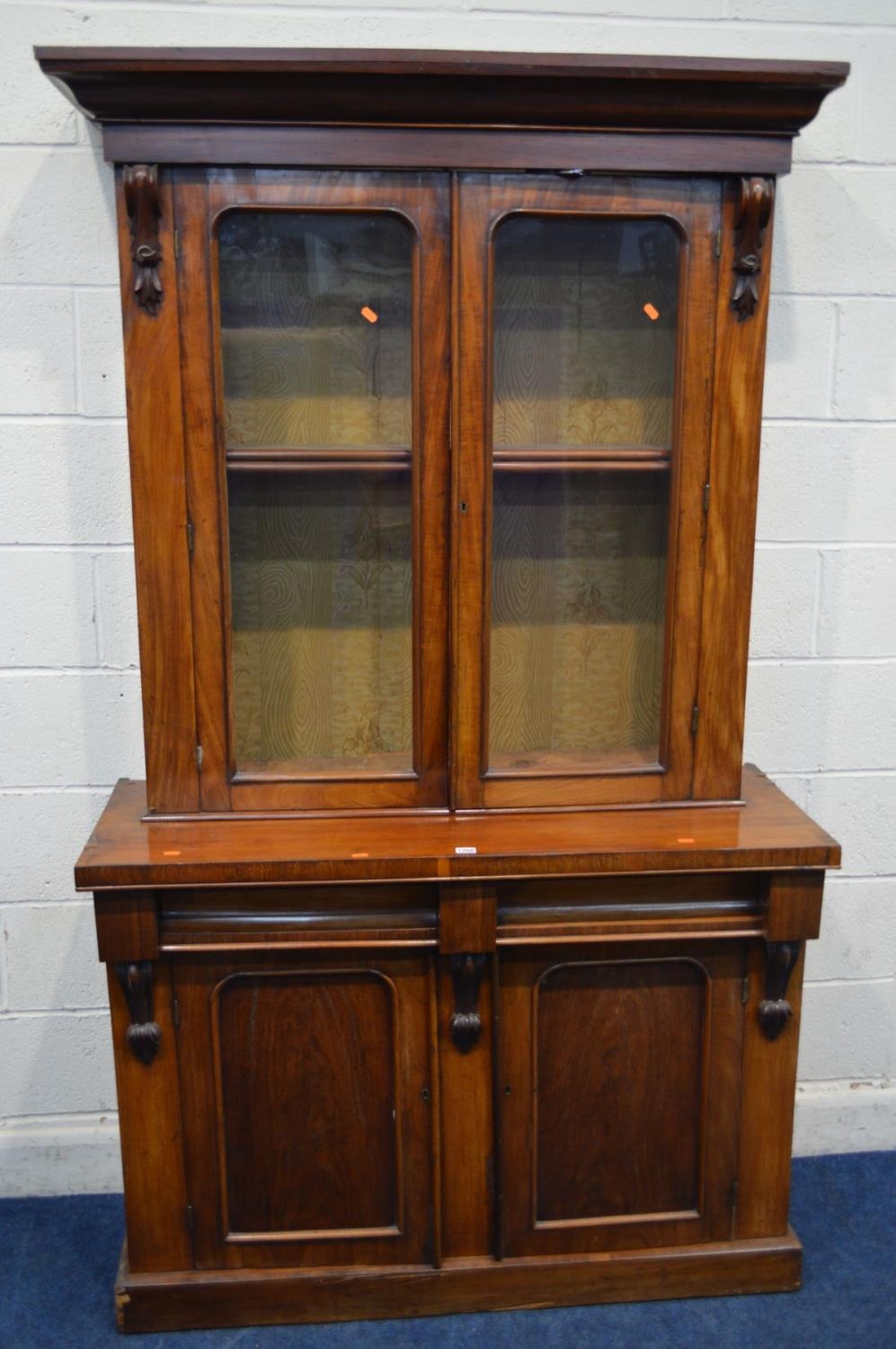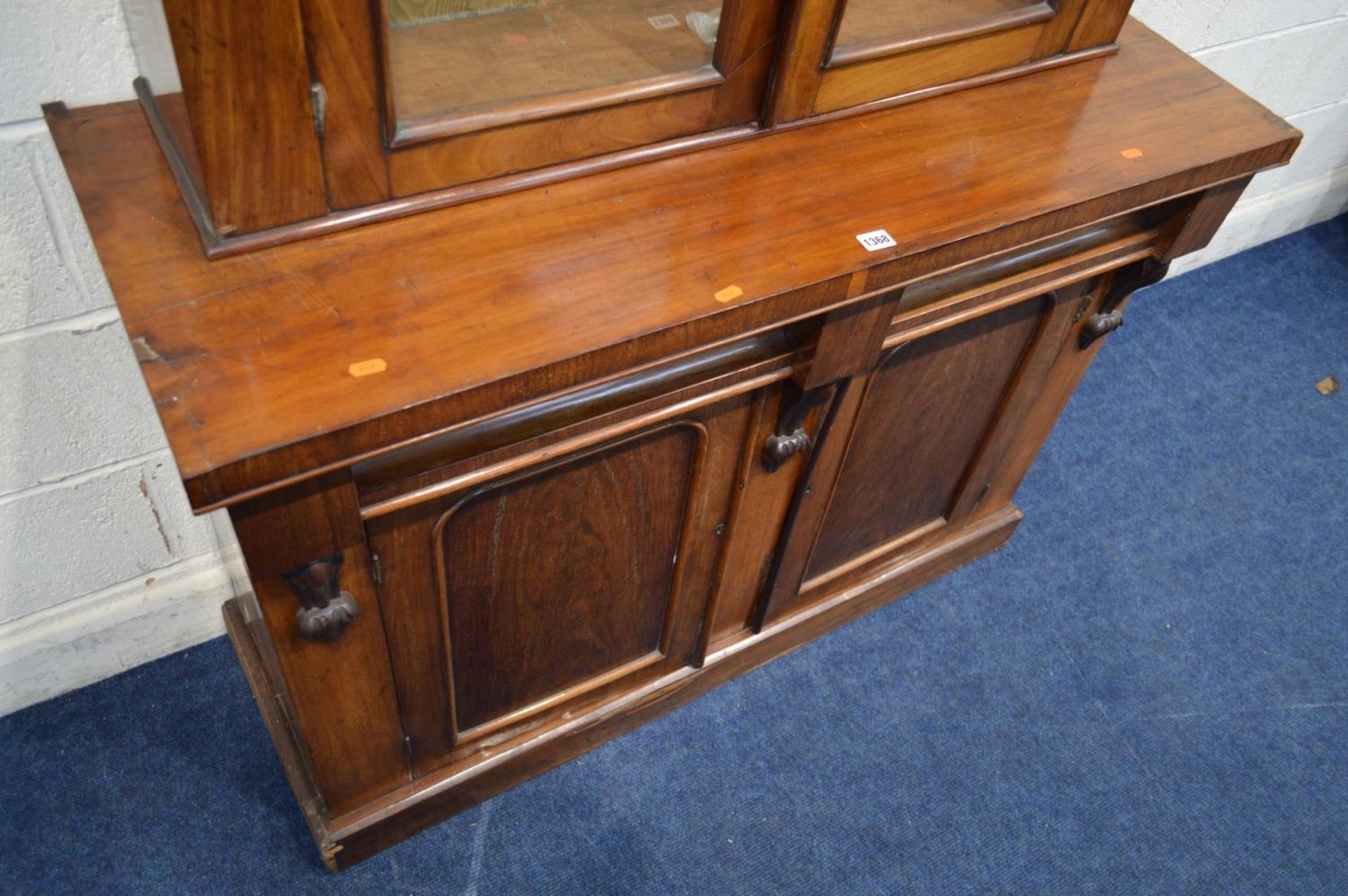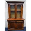 A VICTORIAN WALNUT GLAZED DOUBLE BOOKCASE, on a married base with two drawers, width 121cm x depth 46cm x height 207cm (sd and veneer loss)