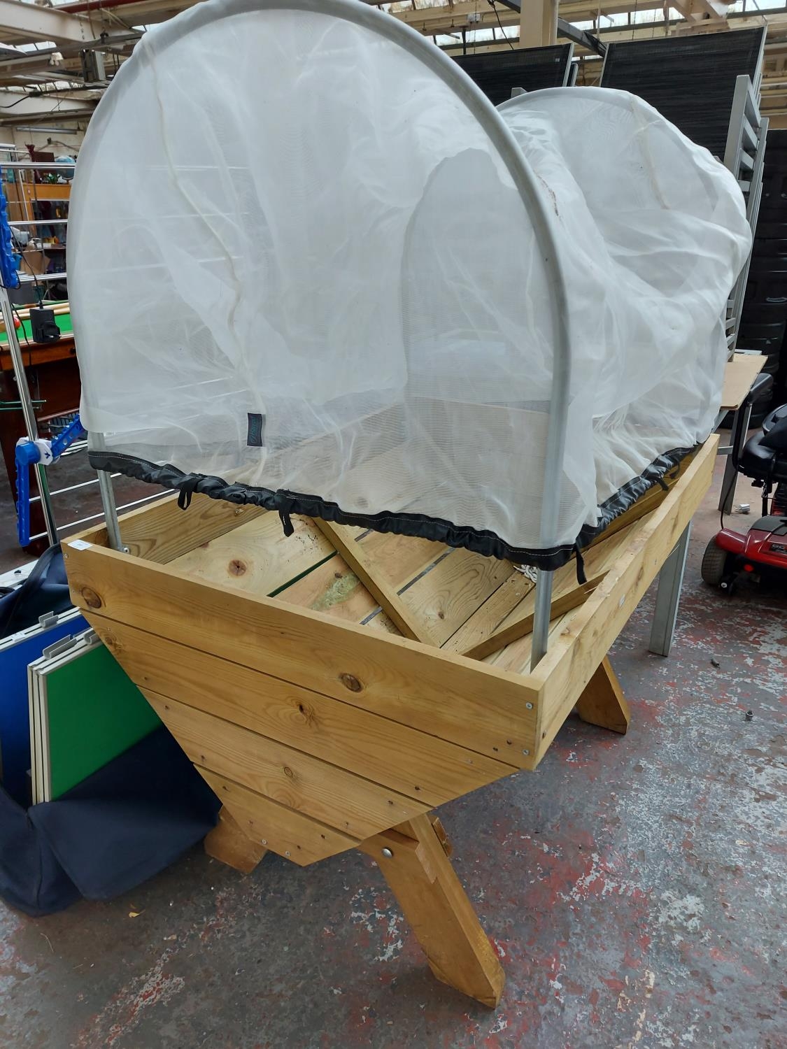 A large tanalised wooden garden planter with meshed cover - measuring approx. 4' x 2'8" x 60" high