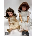 An early 20th Century French SFBJ bisque socket head doll, with sleeping eyes, open mouth with teeth and painted features, with jointed composition body, head impressed SFBJ 301 Paris 8, height 52cm, and a German Max Handwerck bisque socket head doll with sleeping blue eyes with eyelashes, open mouth with teeth and composition and wood ball jointed body, height 66cm. Both faces have been repainted. (2)
