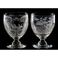 Two large rummers, one engraved with a panel depicting a steeple- chasing scene with fruiting vine and hops verso, the companion engraved with a fox hunting scene, late 19th/early 20th century, 21cm high.
