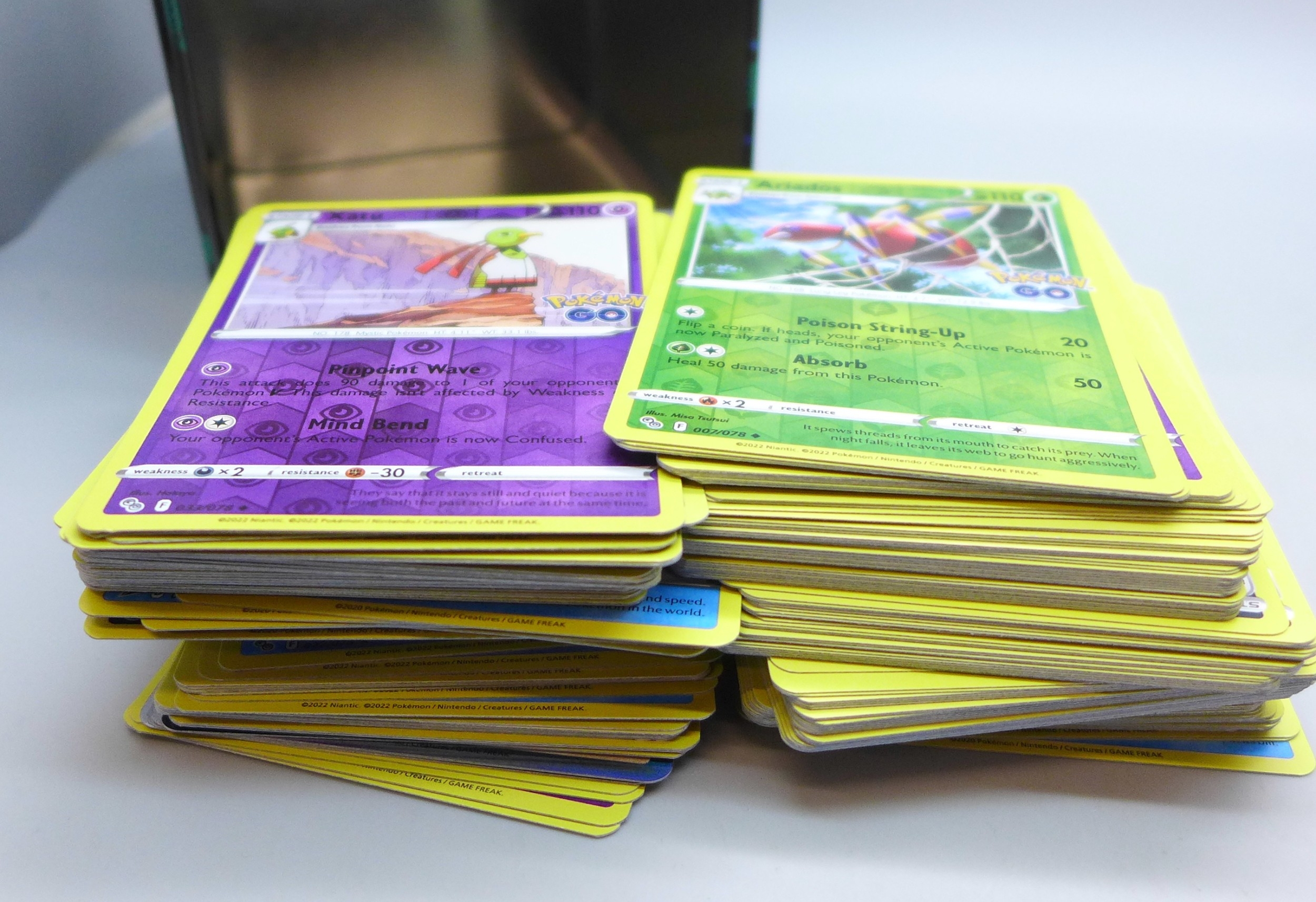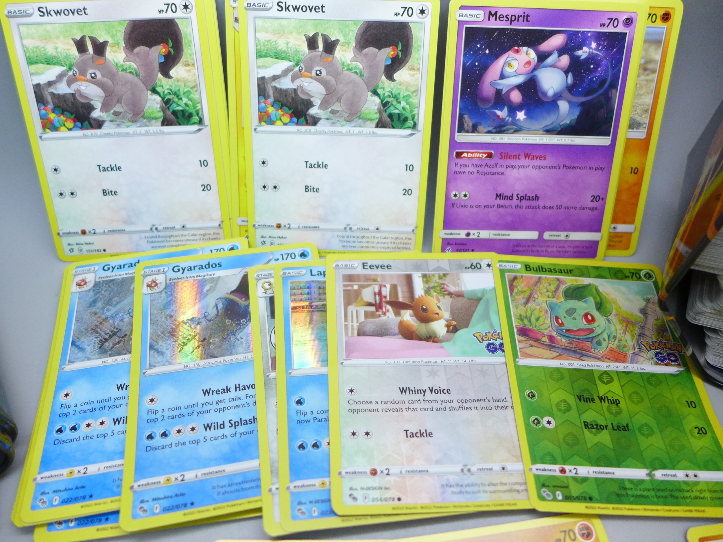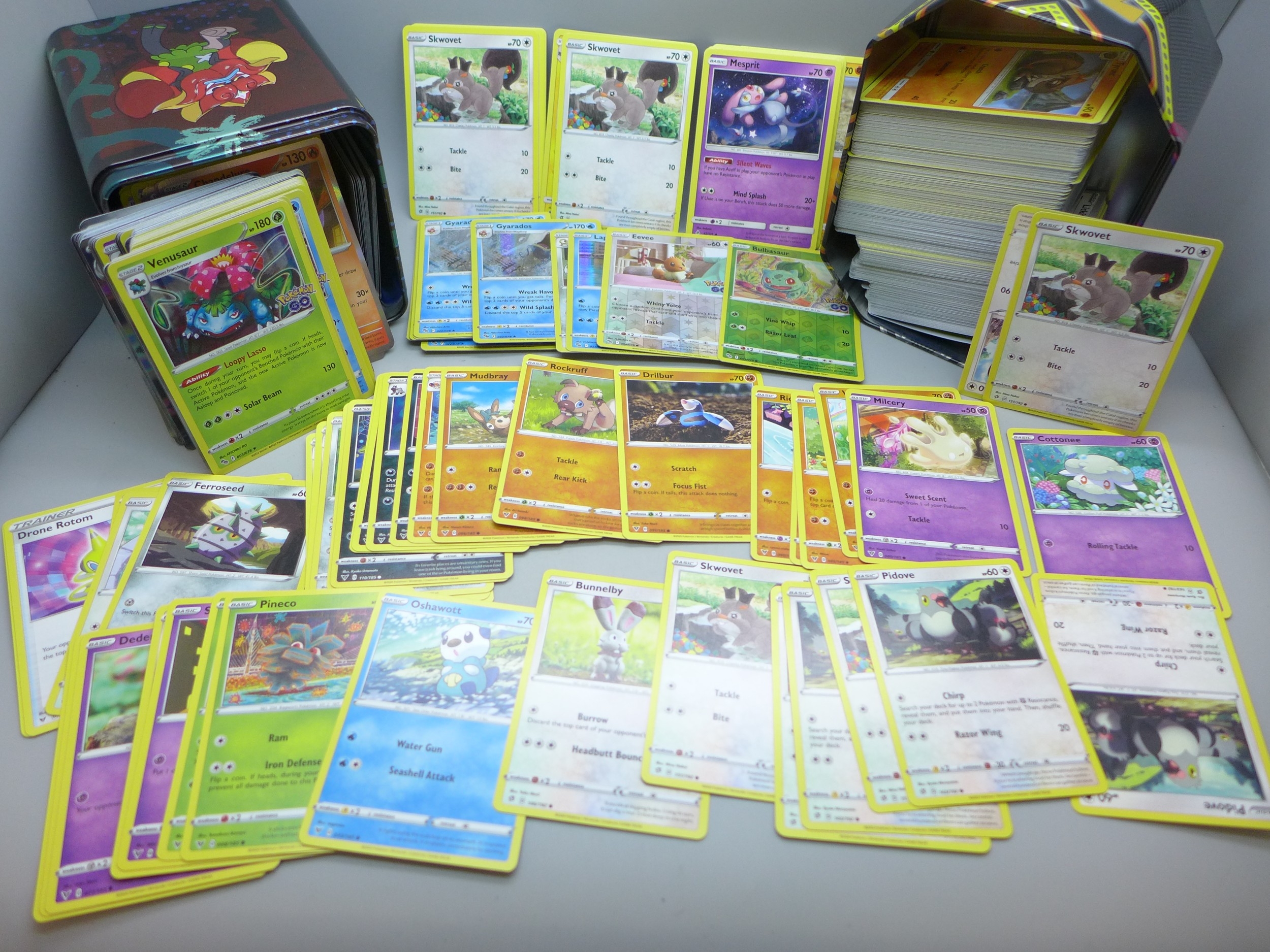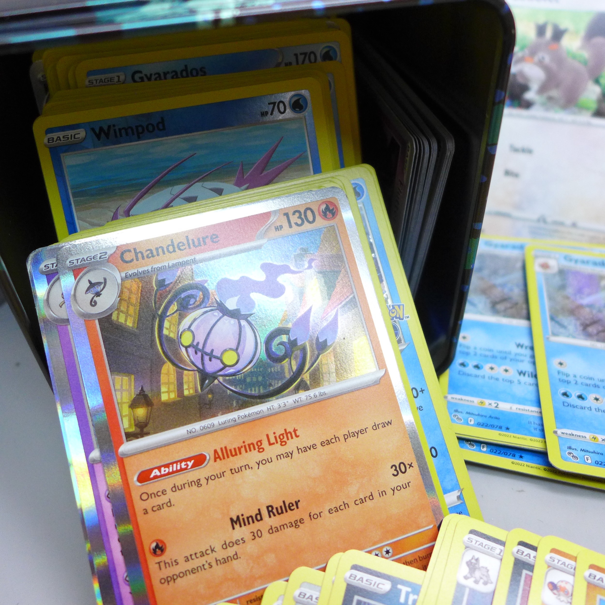 A collection of 650+ Pokémon cards with over 170 Holographic cards including Rares and Reverse Holos in two collector tins