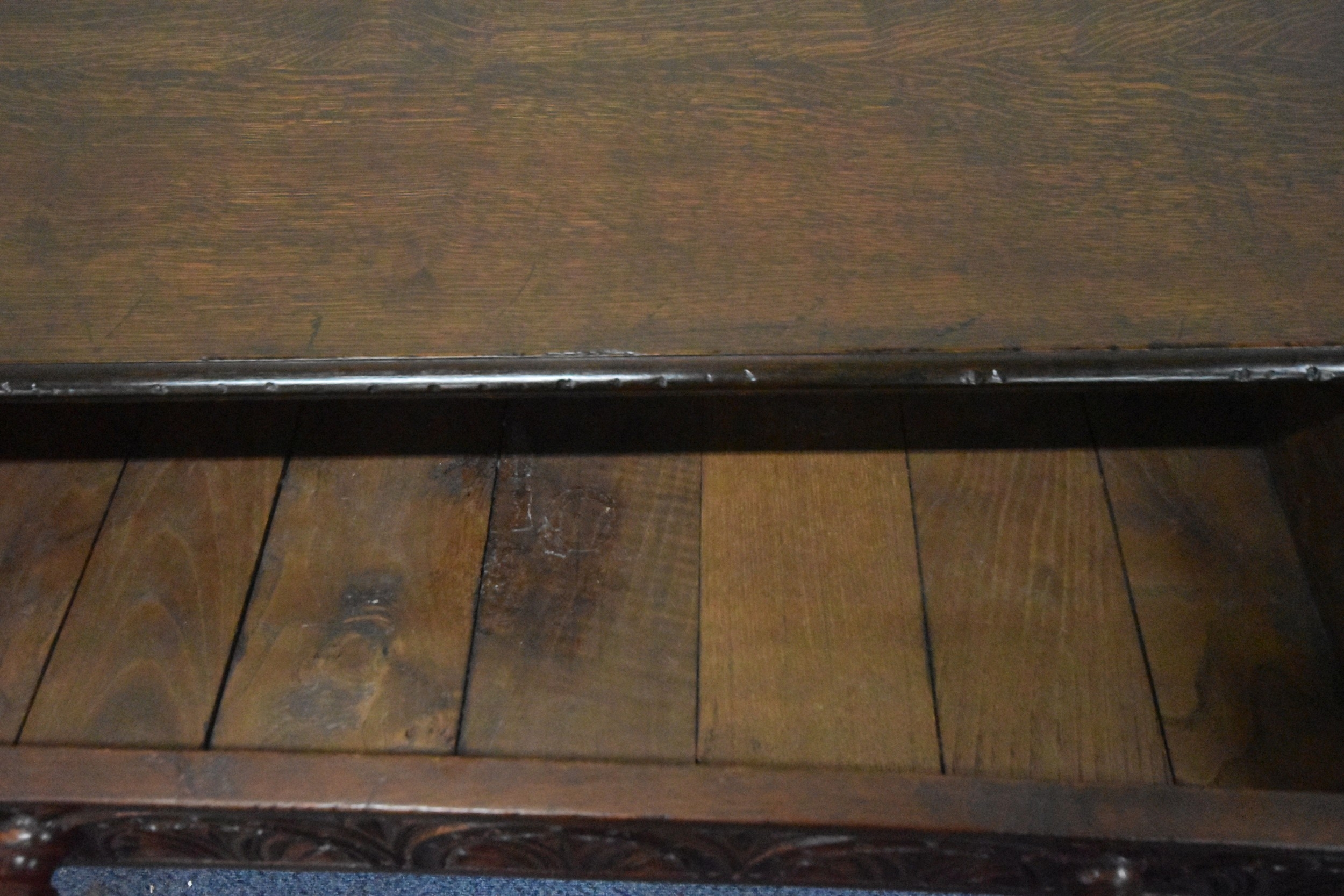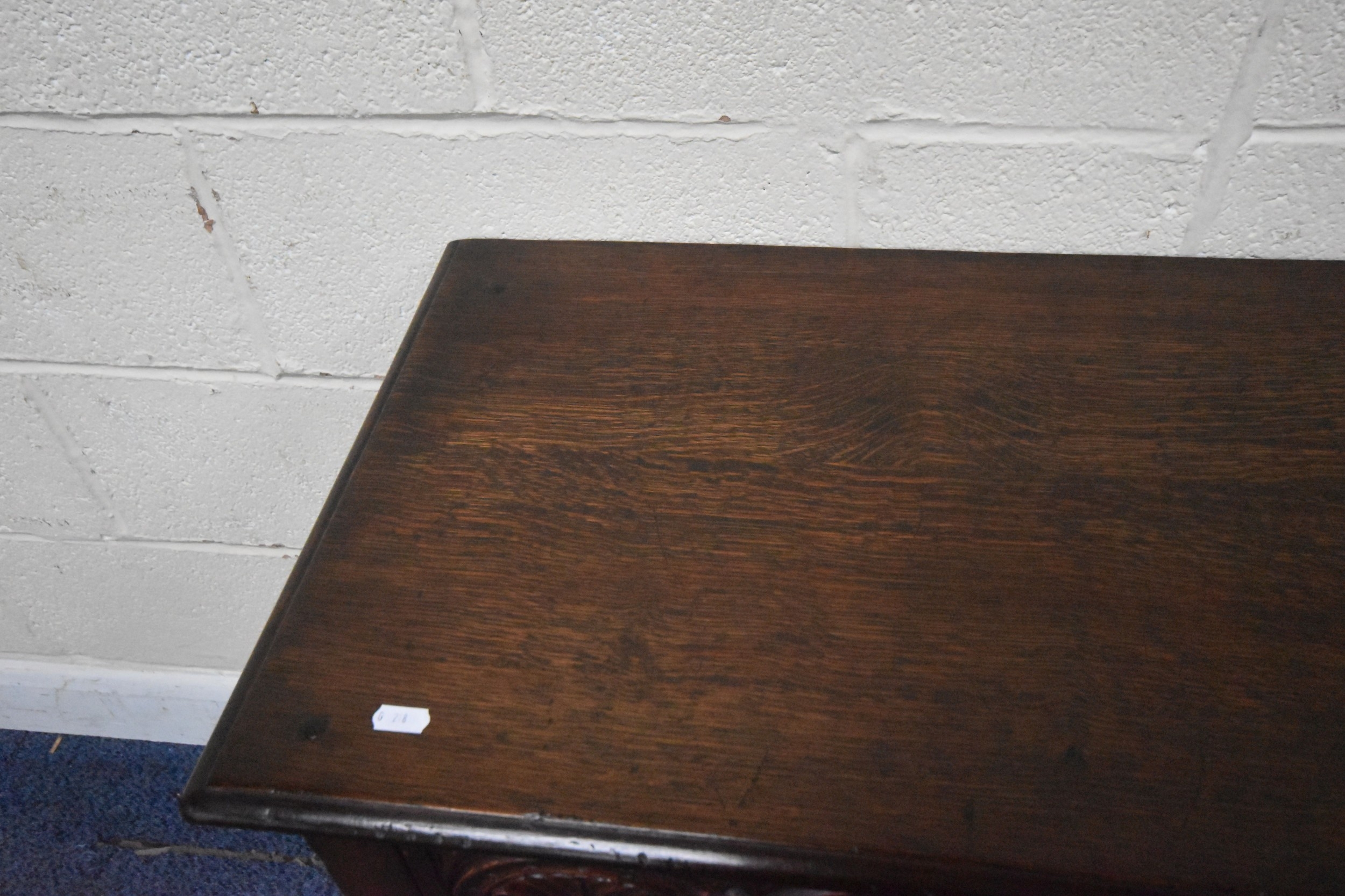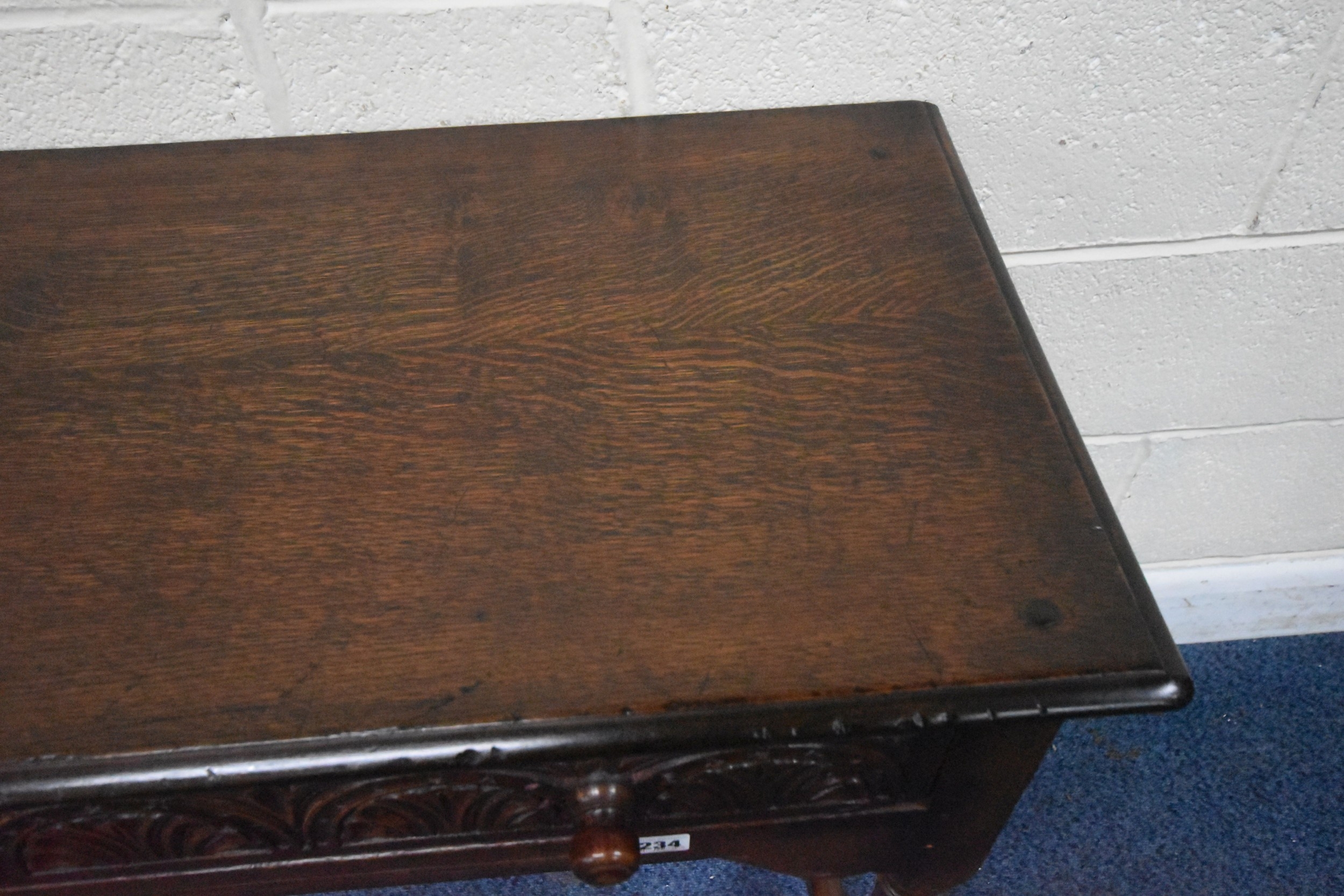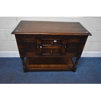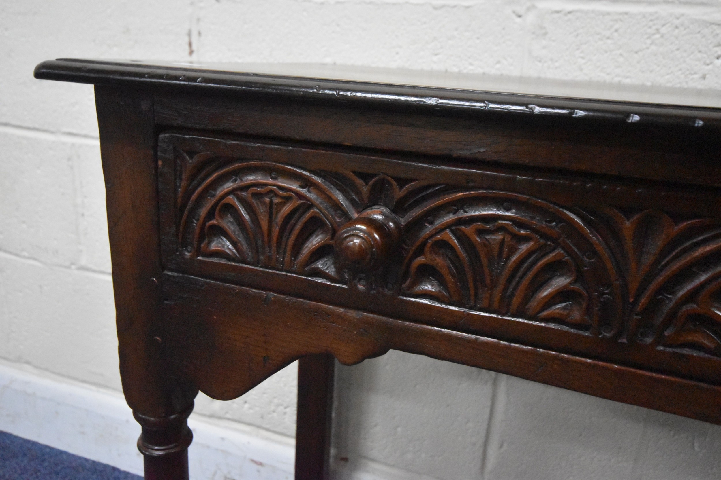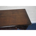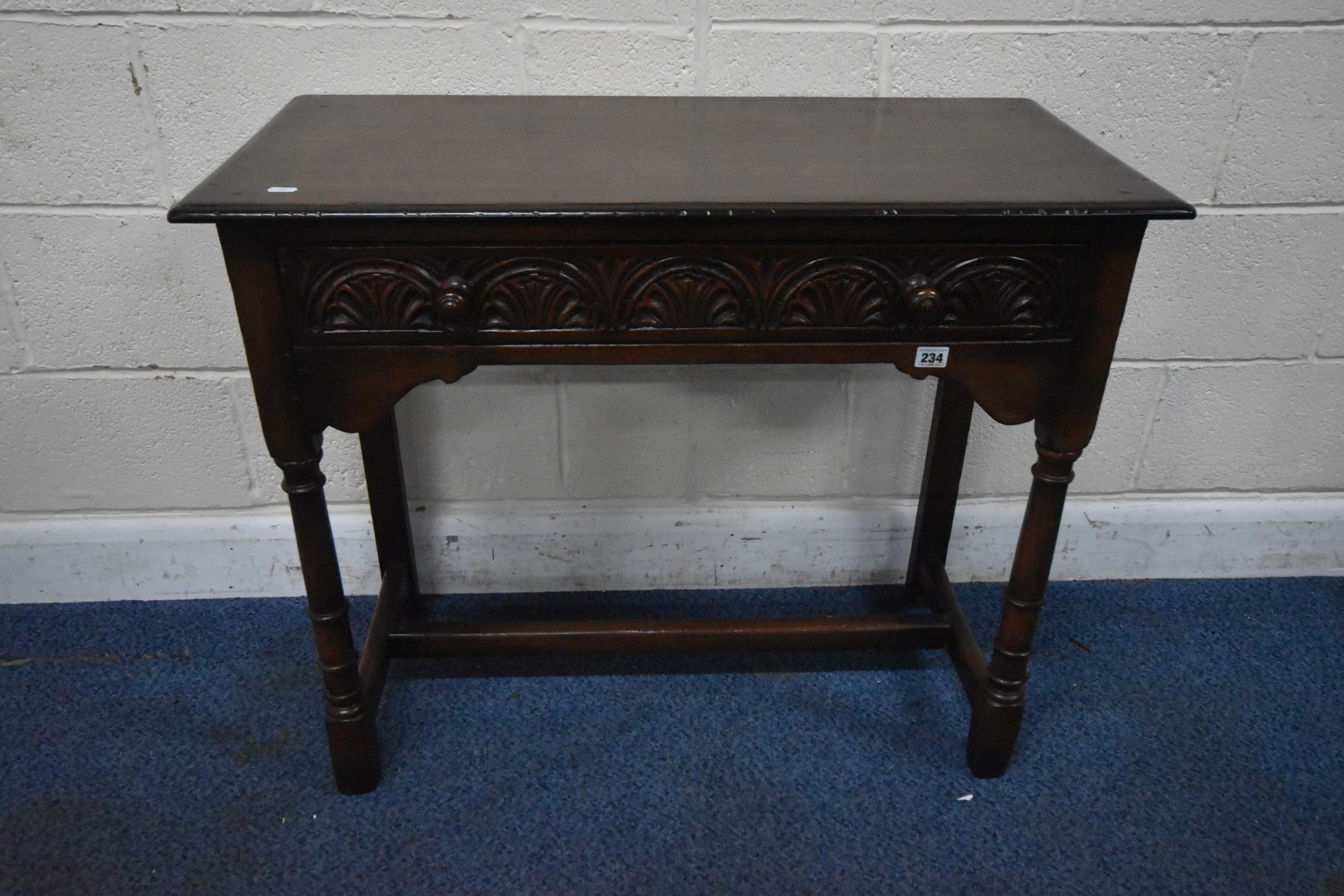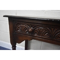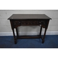 IN THE MANNER OF TITCHMARSH AND GOODWIN, A GOOD QUALITY OAK SIDE TABLE, the single frieze drawers with repeating carved details, raised on block and turned legs, united by stretchers, width 92cm x depth 46cm x height 77cm, condition report: overall good condition