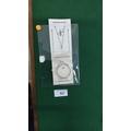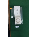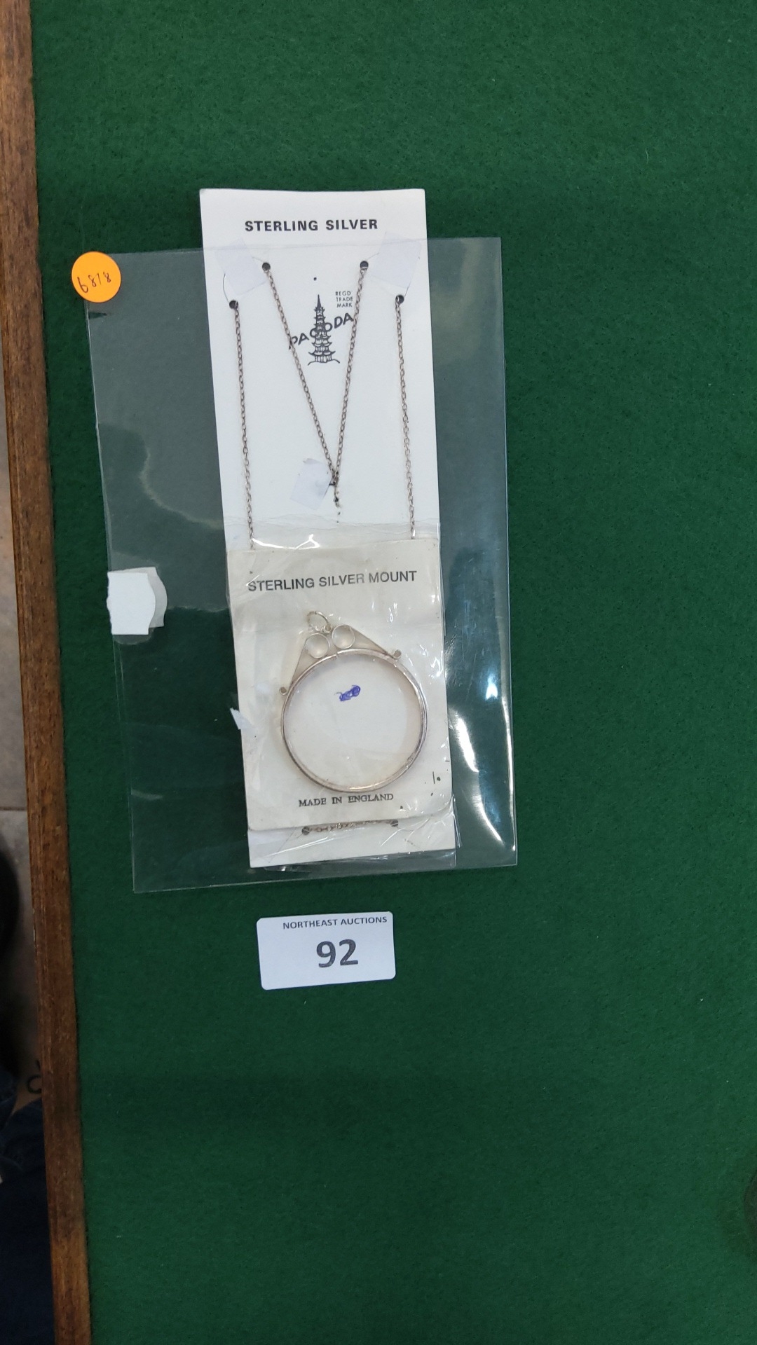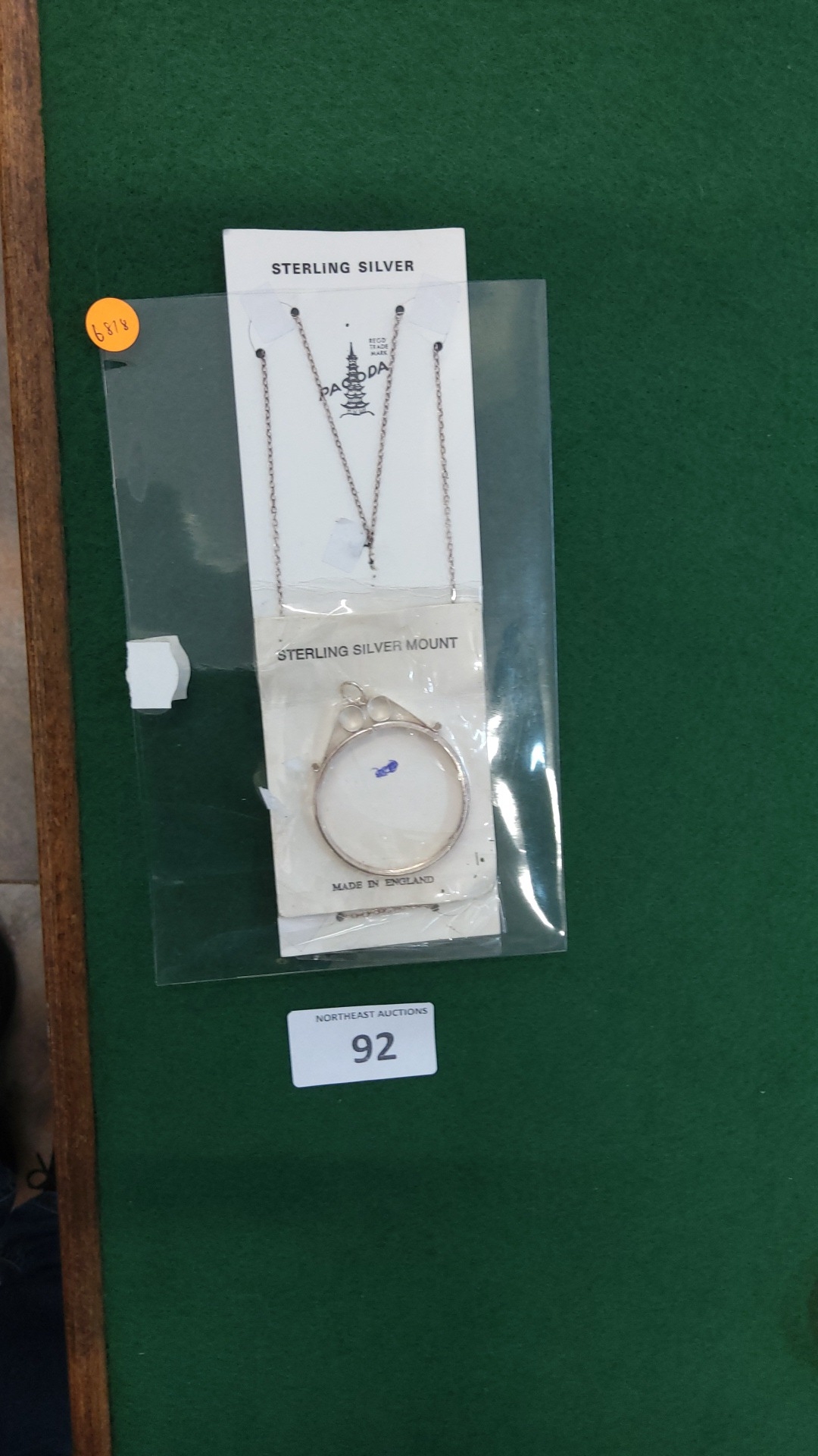 Factory-sealed set comprising a sterling silver trace-link necklace and English-made sterling silver pendant coin mount with bails, late 20th century.