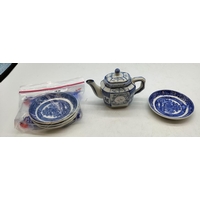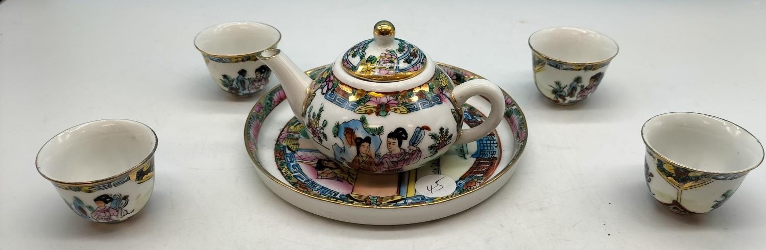 Miniature Chinese 6 Piece Tea Set. Teapot 7cm High. Dish 14cm Diameter.