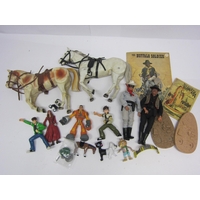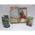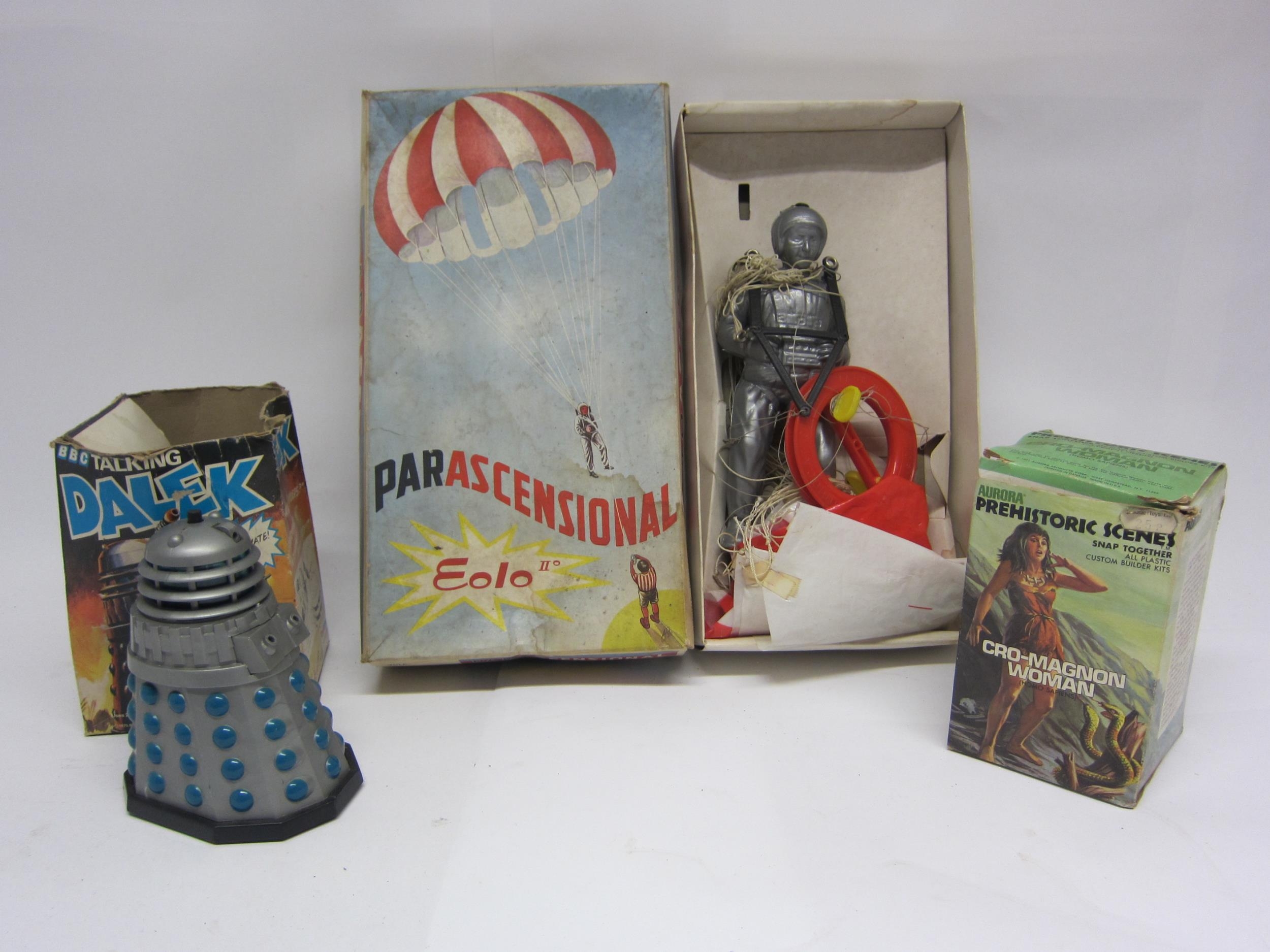 Three boxed 1970s plastic toys to include Palitoy BBC Doctor Who Talking Dalek (missing accessories, box missing some flaps), Aurora Prehistoric Scenes 'Cro-Magnon Woman' snap-together plastic kit (contents unchecked) and Eolo Parascensional parachutist (3)