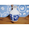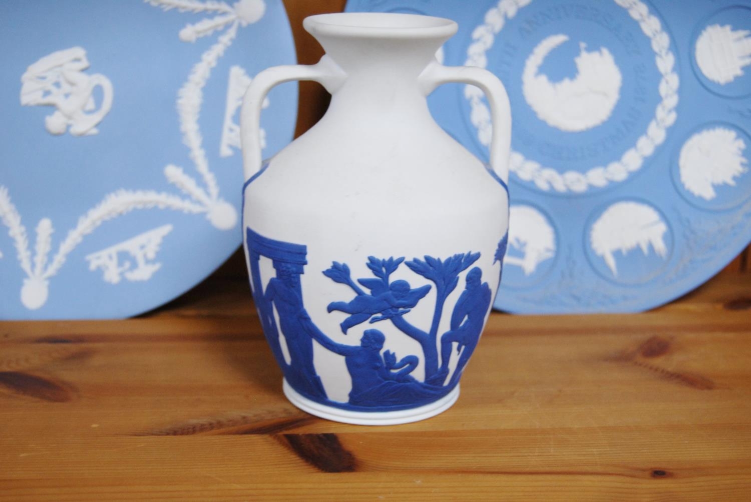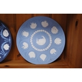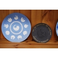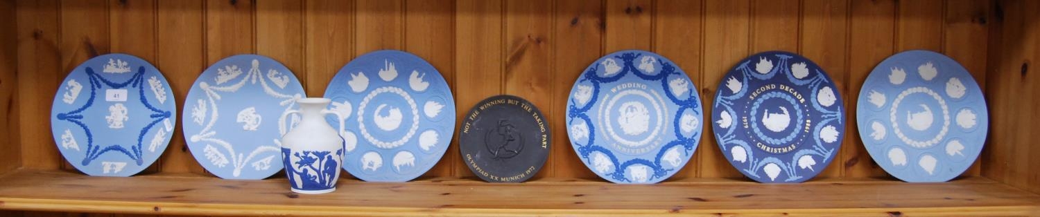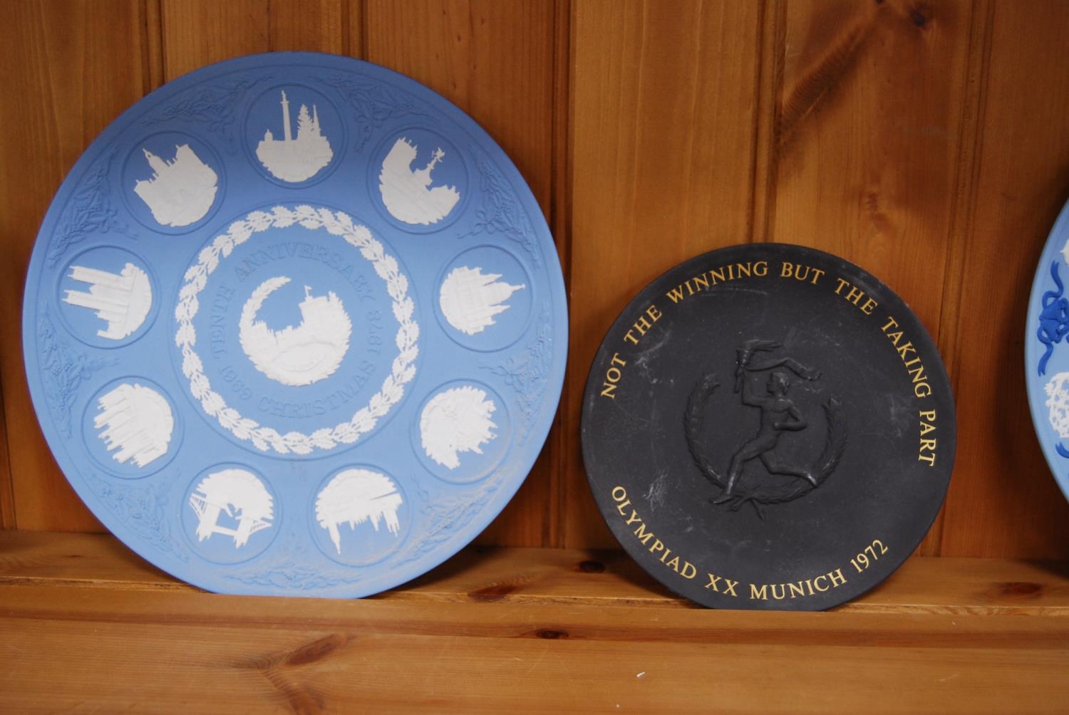 Group of six Wedgwood blue Jasper ware plates, a Wedgwood Greek-style Jasper ware urn-shaped vase and a Wedgwood basalt plate commemorating the Munich Olympics 1972. (8)