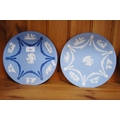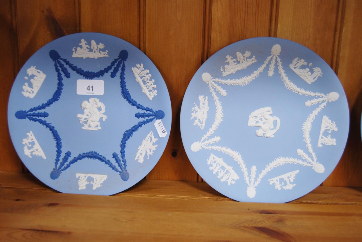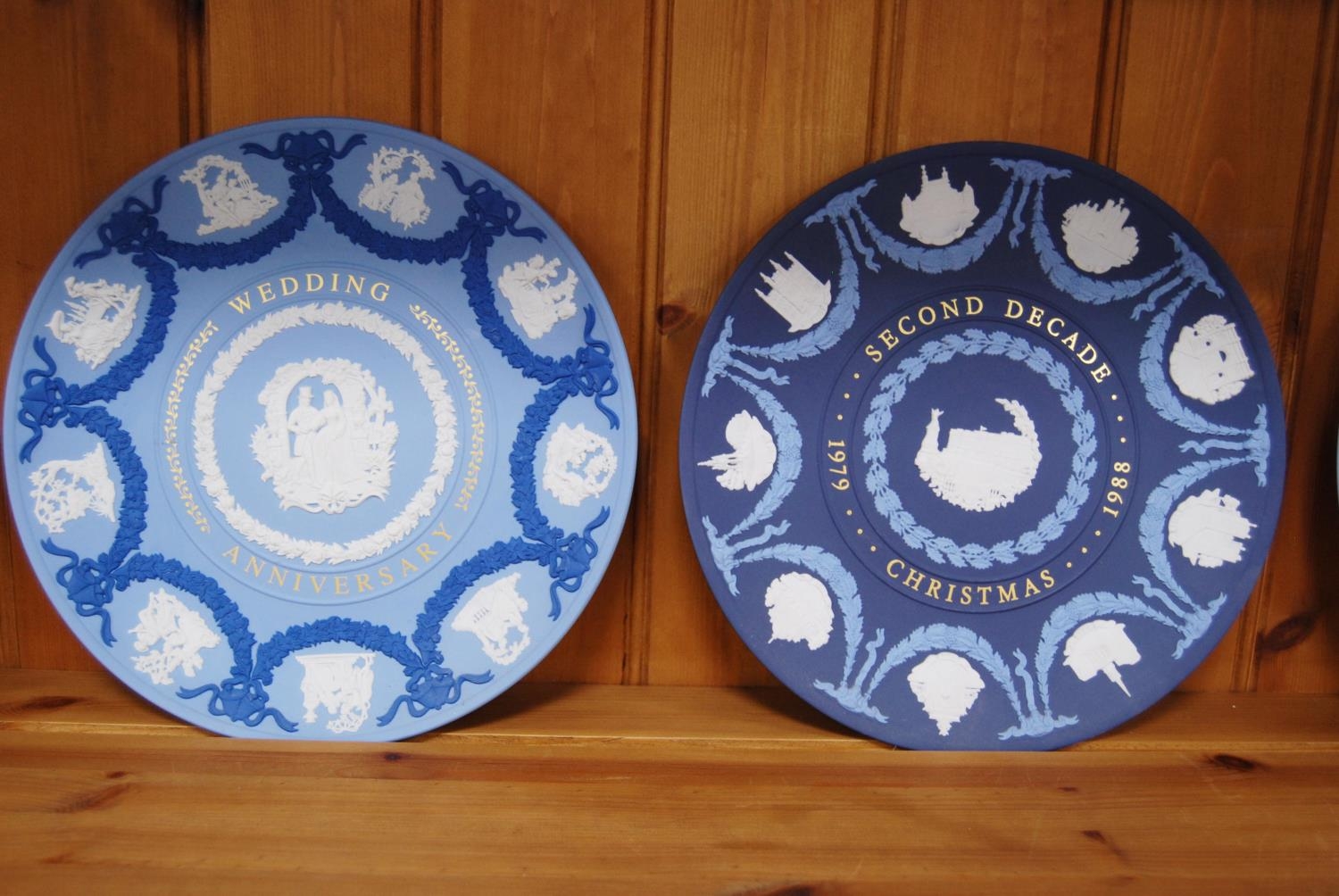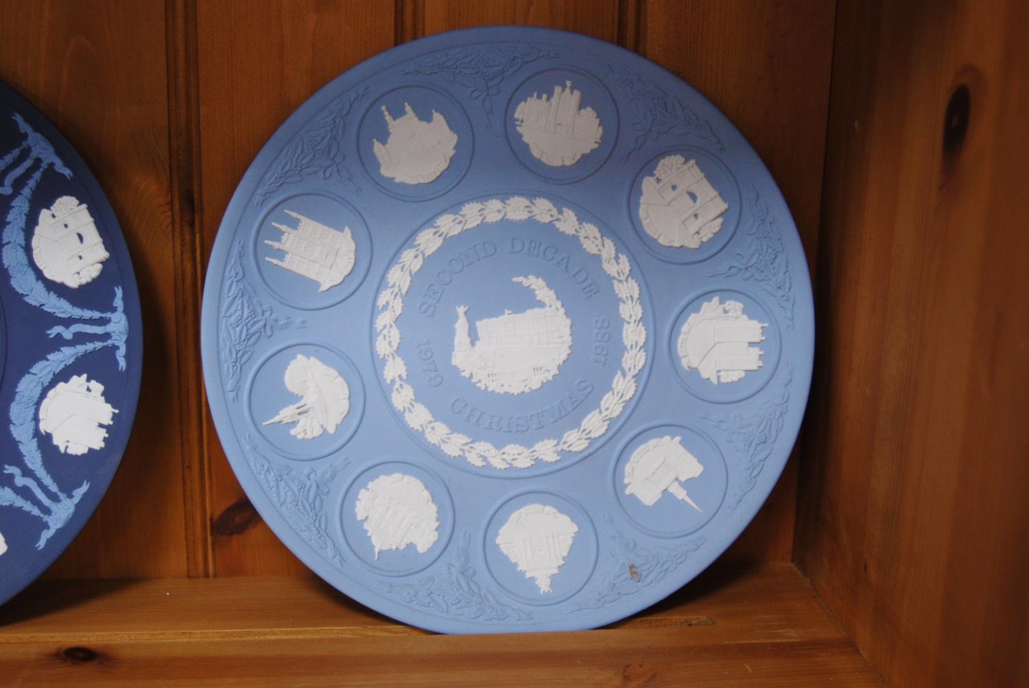Group of six Wedgwood blue Jasper ware plates, a Wedgwood Greek-style Jasper ware urn-shaped vase and a Wedgwood basalt plate commemorating the Munich Olympics 1972. (8)