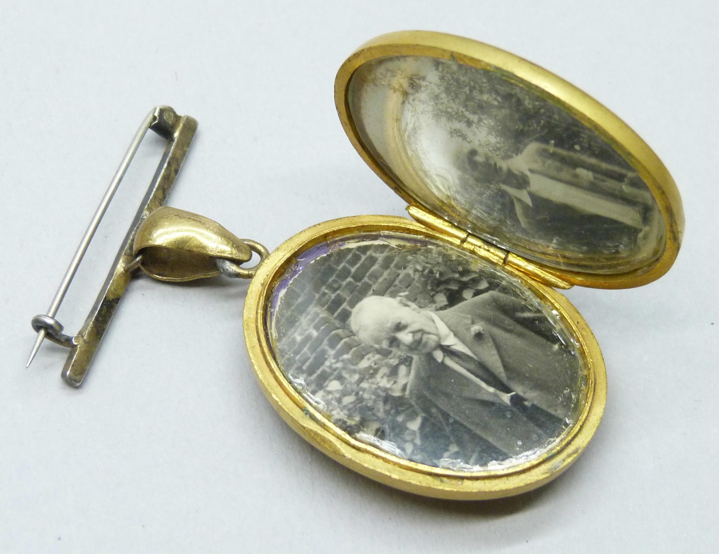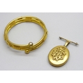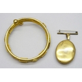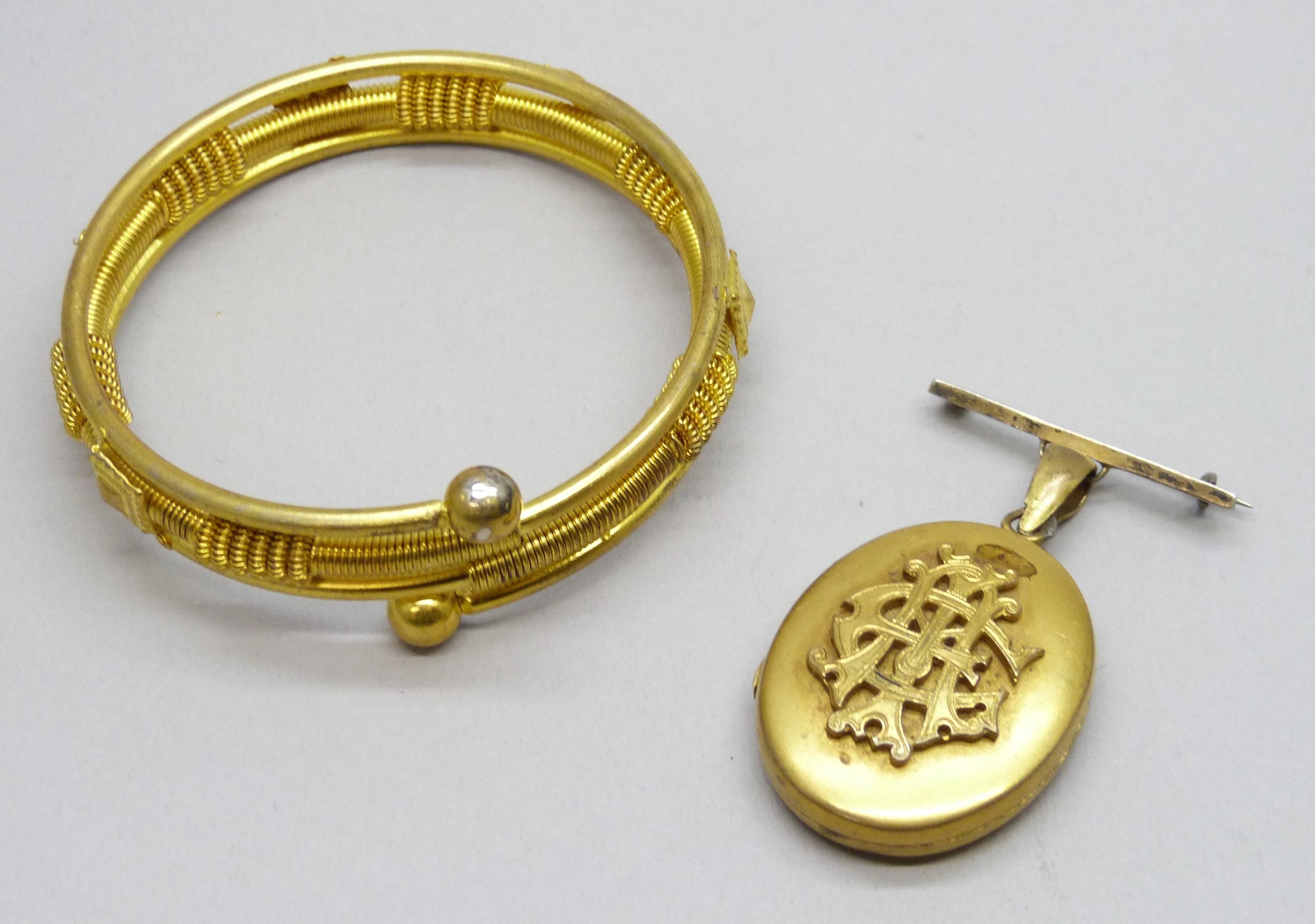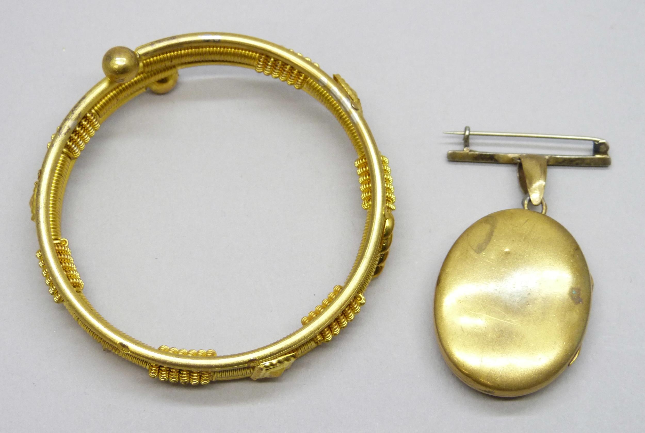 A gilt Etruscan Revival bangle and a gilt locket with an AEI locket, 5.5cm including bail