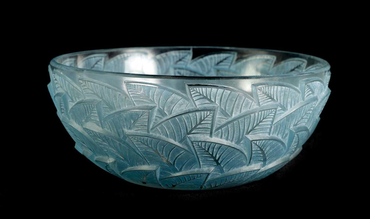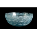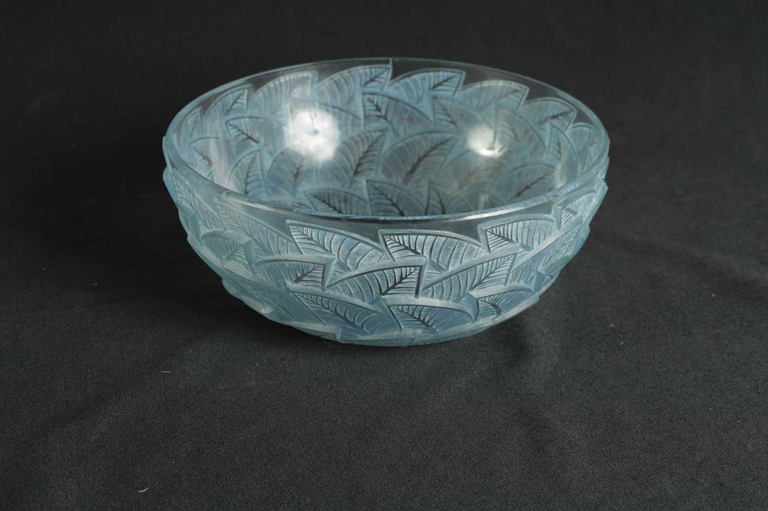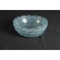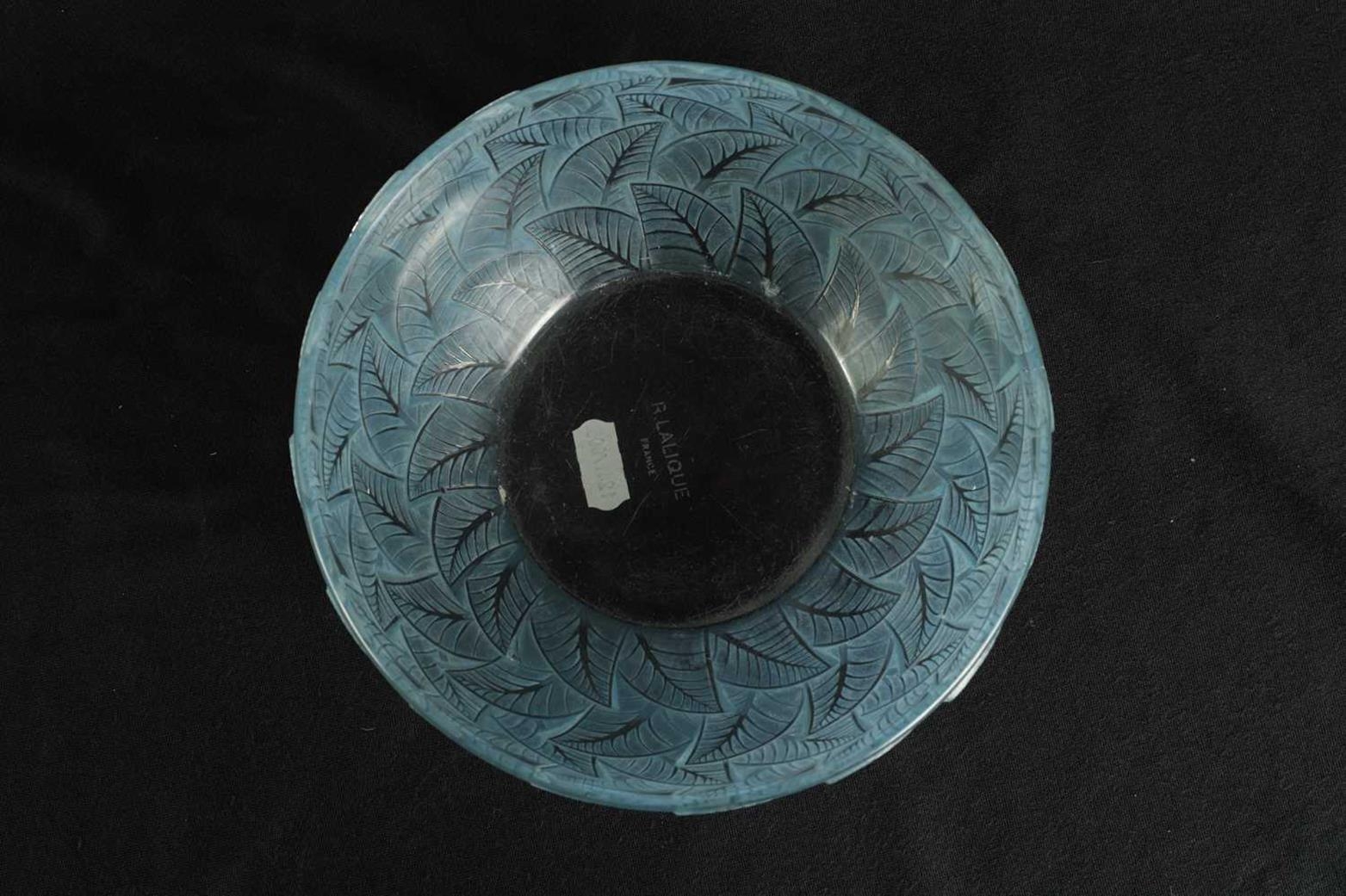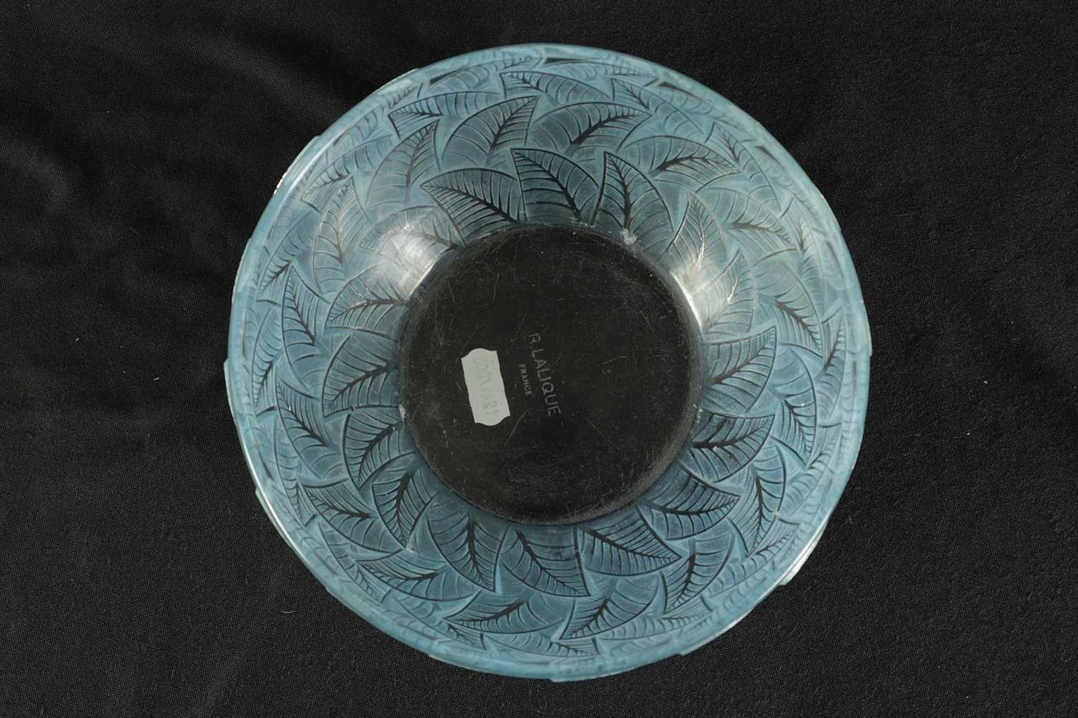R. LALIQUE, AN OPALESCENT AND BLUE STAINED ‘ORMEAUX’ GLASS BOWL wheel engraved signiature to centre (18.5cm diameter )