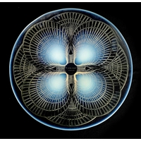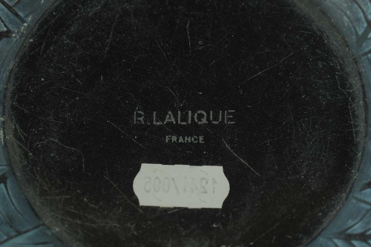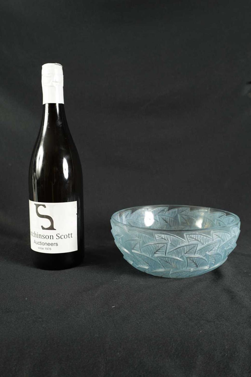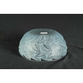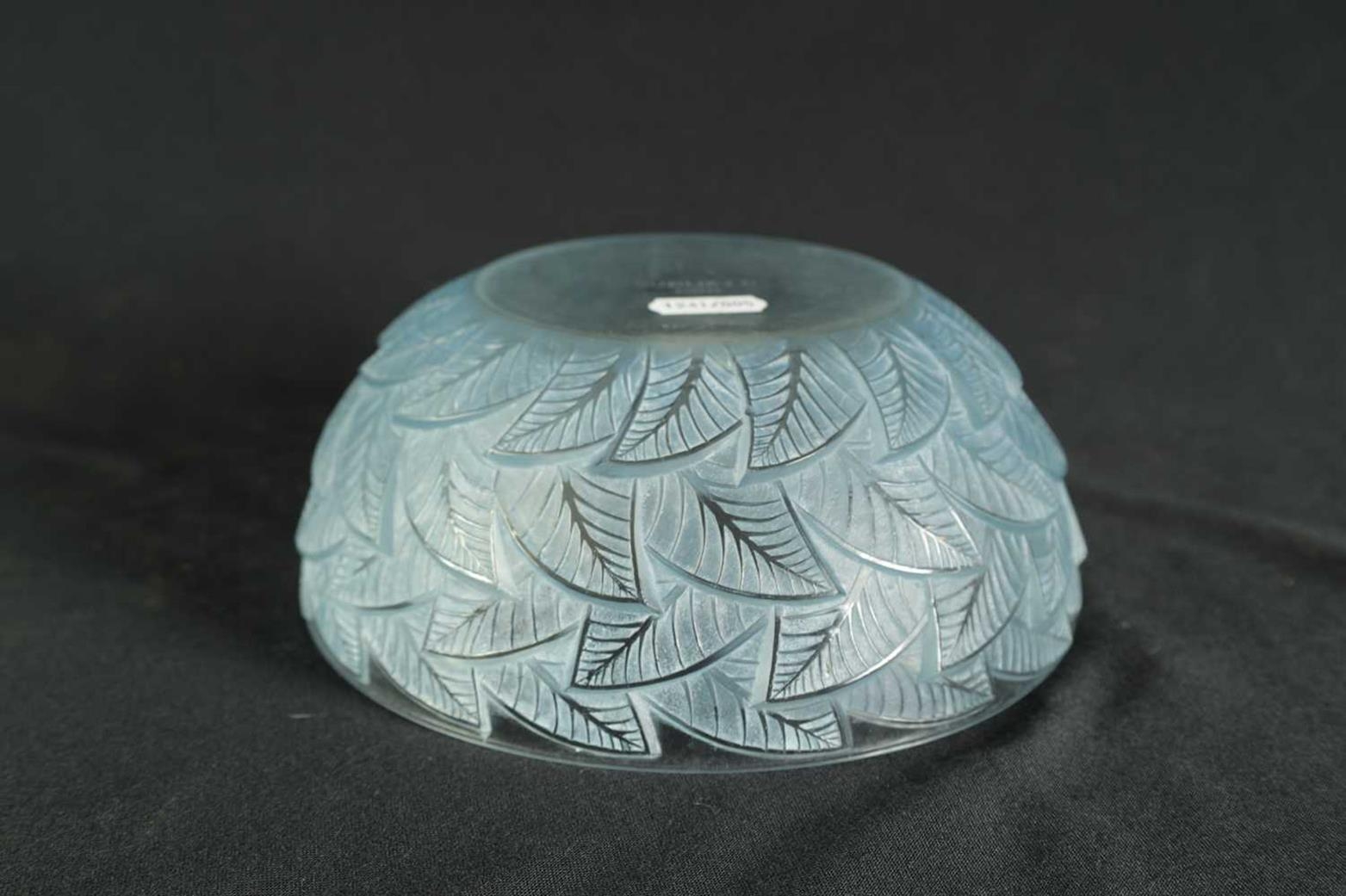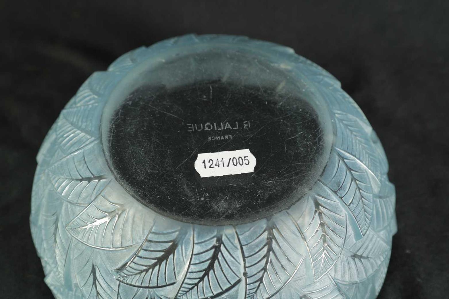 R. LALIQUE, AN OPALESCENT AND BLUE STAINED ‘ORMEAUX’ GLASS BOWL wheel engraved signiature to centre (18.5cm diameter )