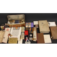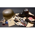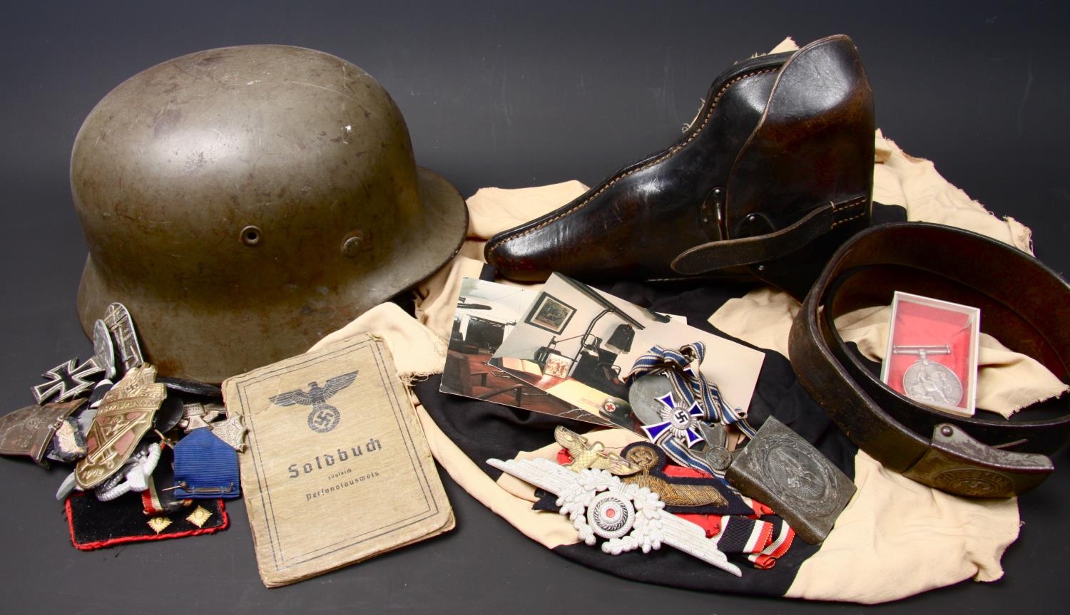 Militaria, World War One, Germany, Iron Cross; Third Reich good collection of medals, shields, badges, flag etc, Iron Cross, Mother's Cross, West Wall Medal, War Merit Cross, Wound badge; Helmet marked D214; Luftwaffe Belt Buckle; Army belt and buckle; shields; badges including Reichpartei Tag 1936, 1 Mai 1937, section from flag; P38 leather holster; tinnies; Pay book; World War One, British War Medal 55097 PTE H. BROSTER LAN FUS