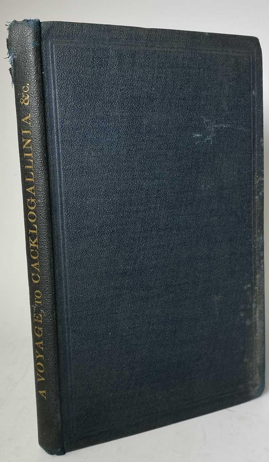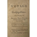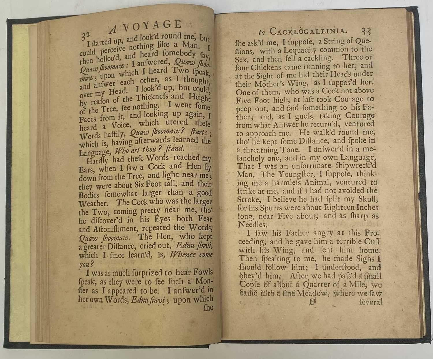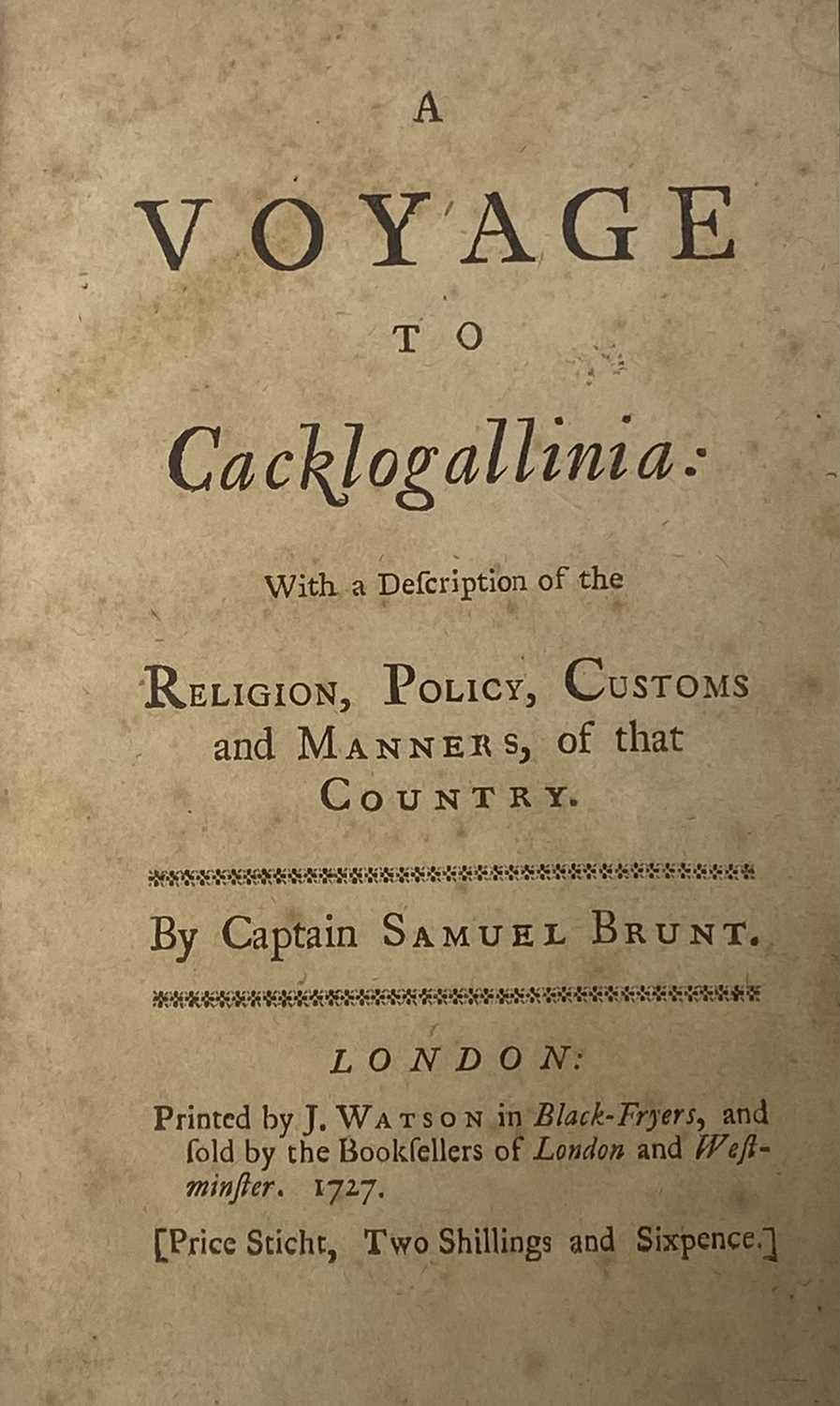 Capt SAMUEL BRUNT. 'A Voyage to Cacklogallinia: With a Description of the Religion, Policy, Customs and Manners, of that Country,' rebound with pebbled cloth boards, lacking frontispiece, J. Watson, London, 1727. Written under the pseudonym of Samuel Brunt-and in the past laid at Daniel Defoe's door- the book is a satire, inspired by the South Sea Bubble fiasco, in which, during a visit to a country inhabited by fowl, the narrator becomes involved in a scheme to prospect for gold on the moon.