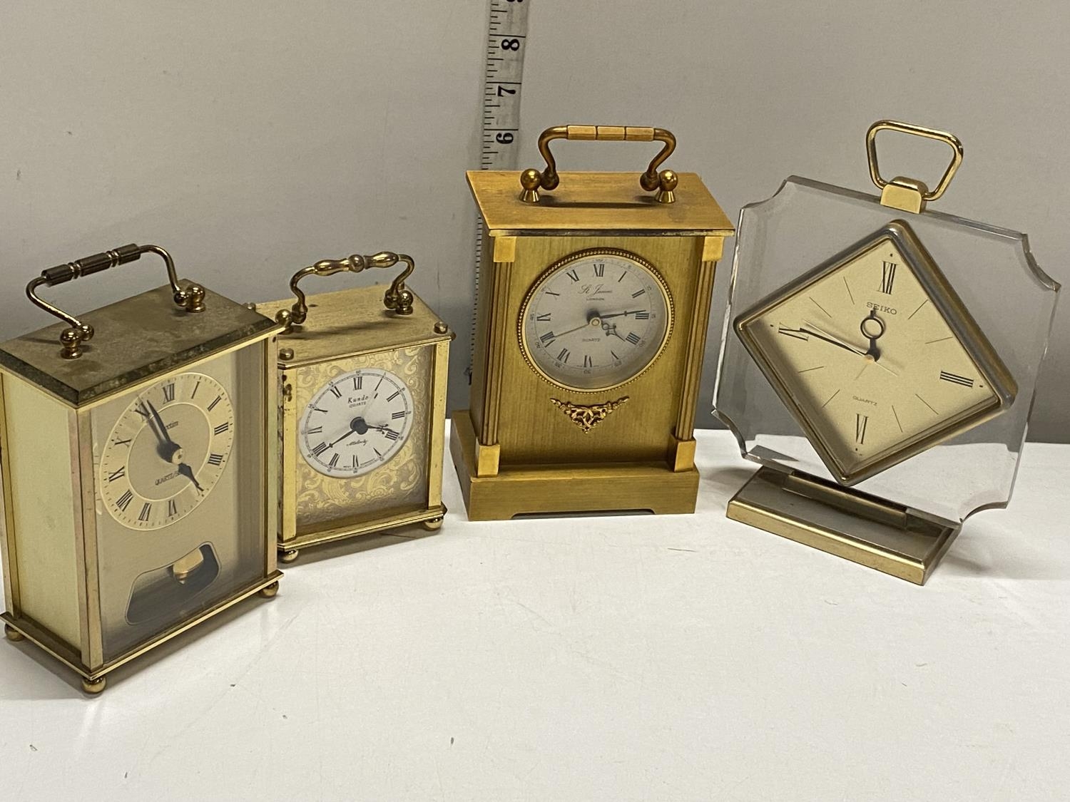 Four assorted brass cased mantle clocks including Seiko & Kundo, shipping unavailable