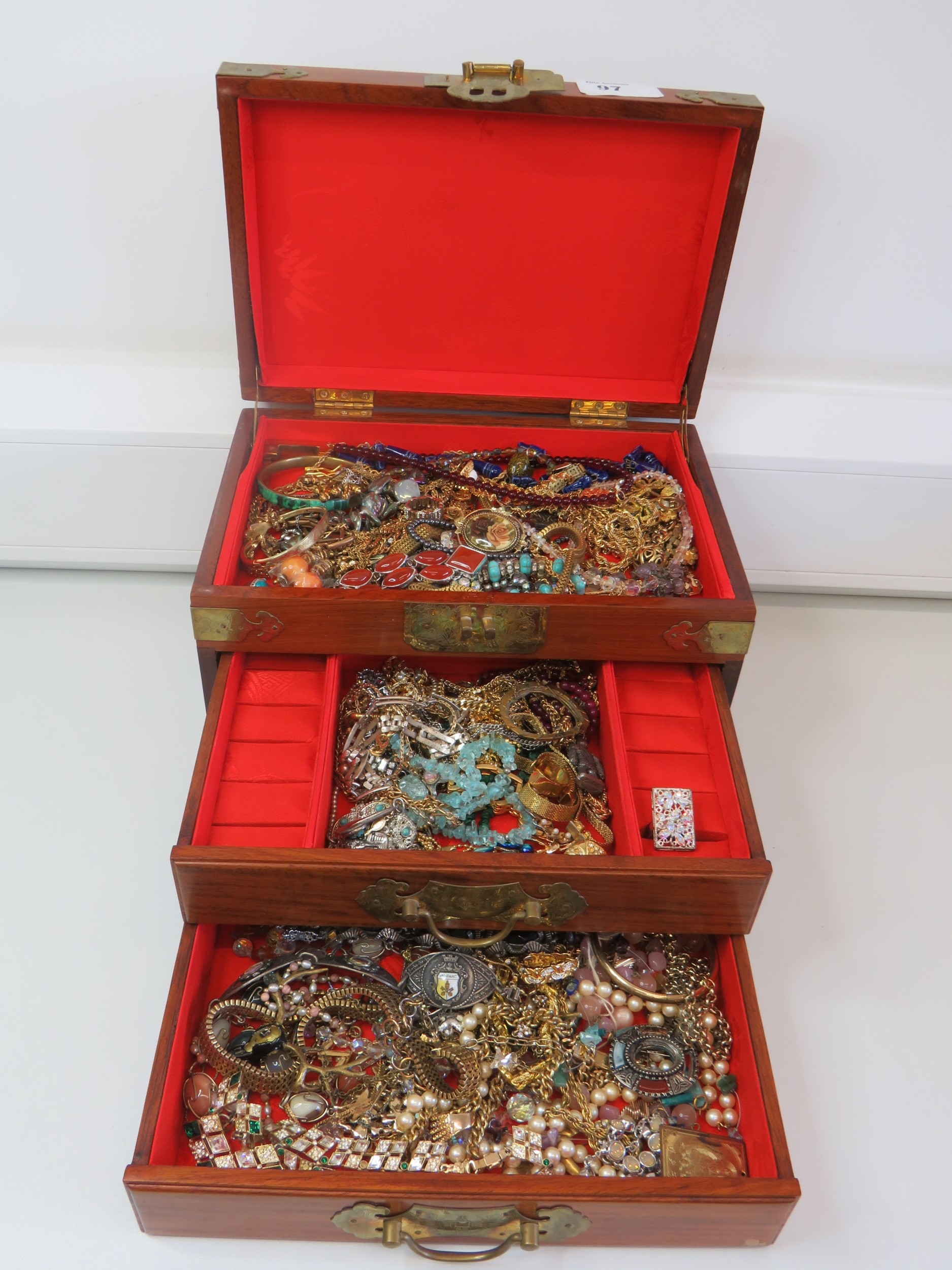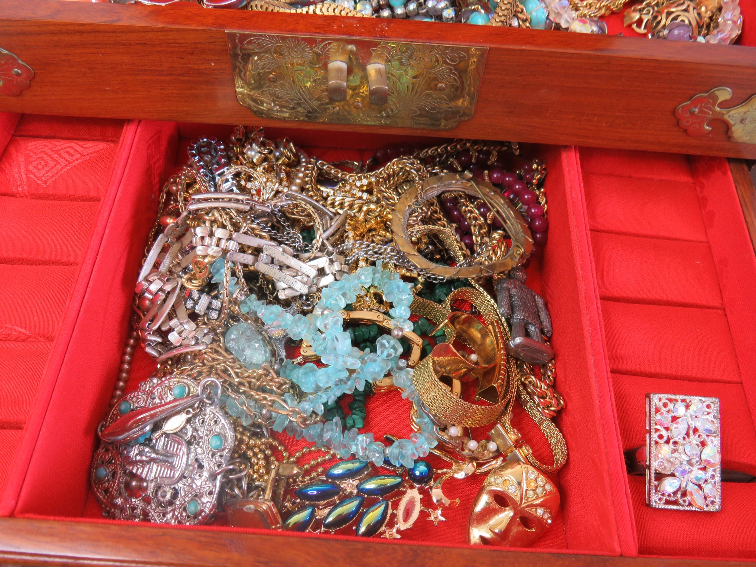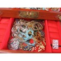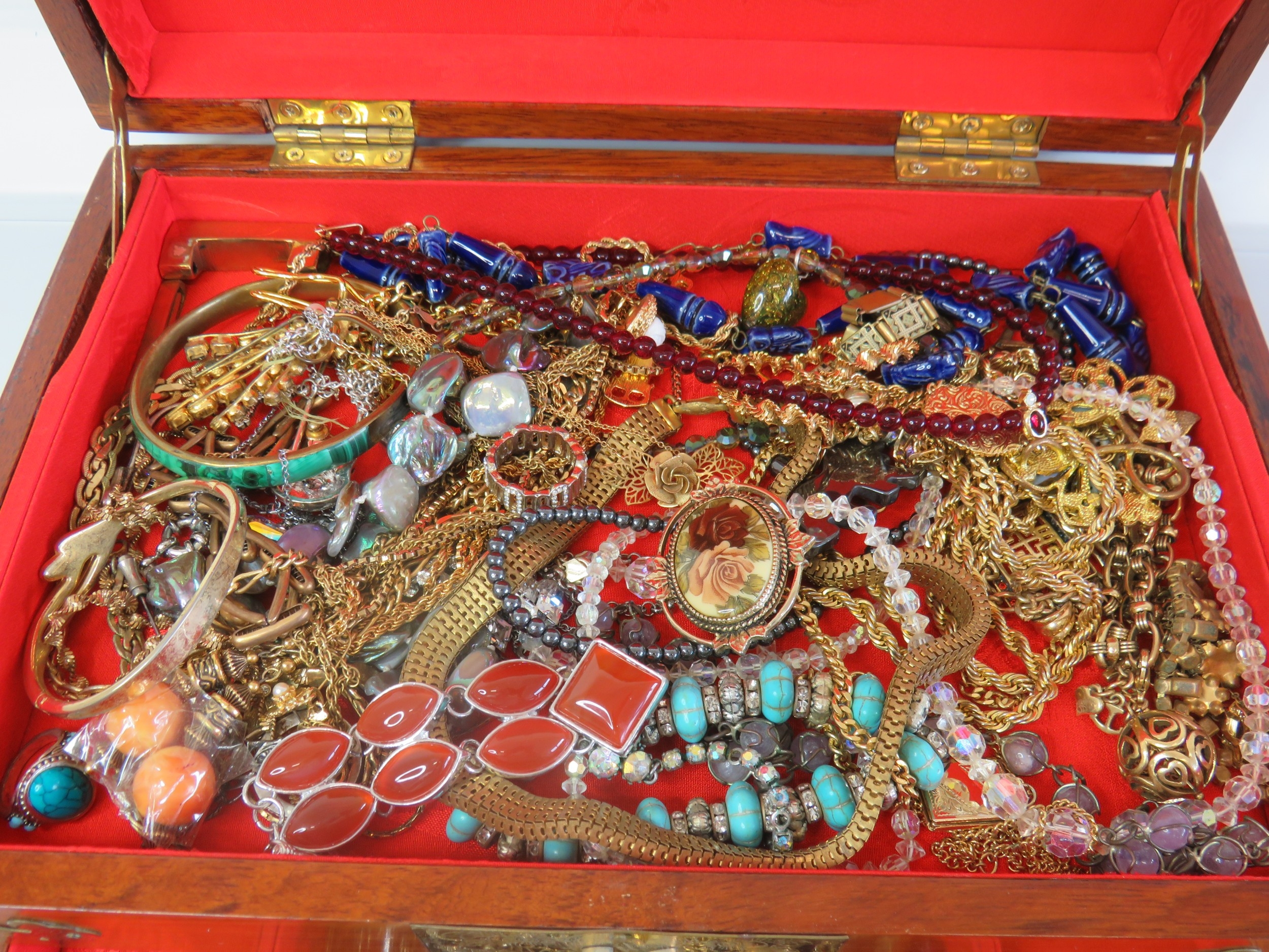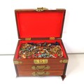 Large wooden jewellery box full of jewellery.