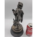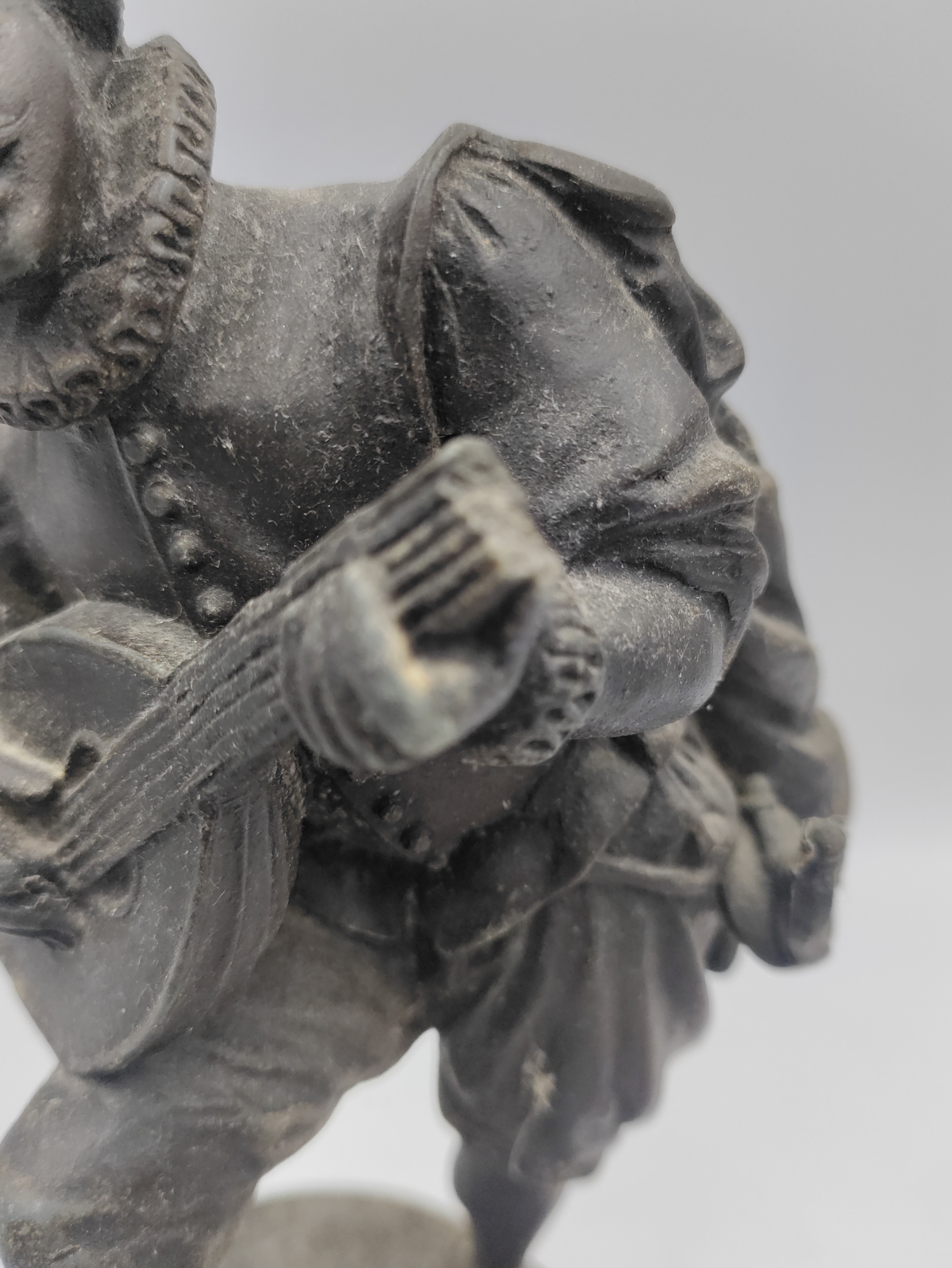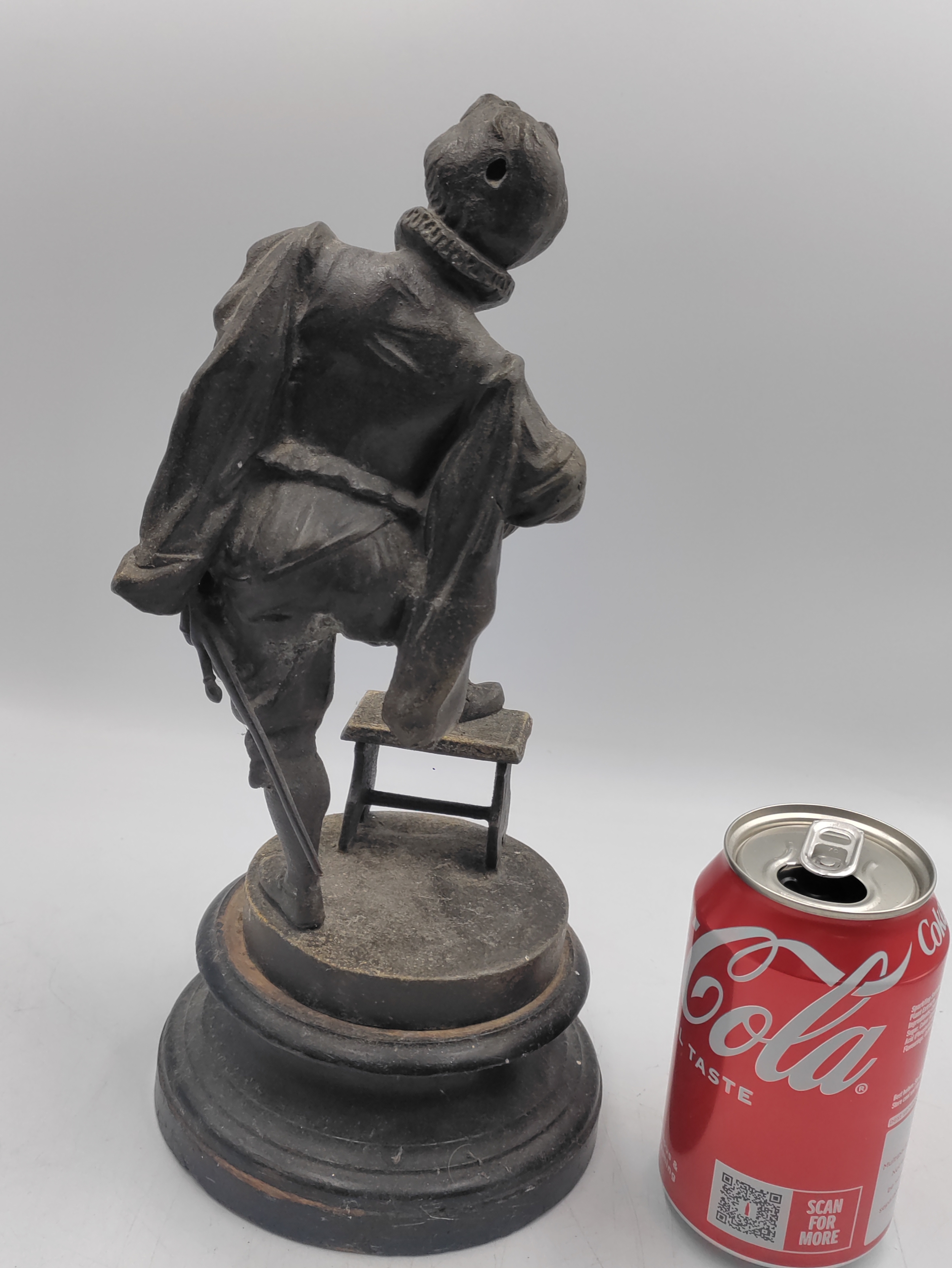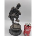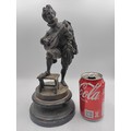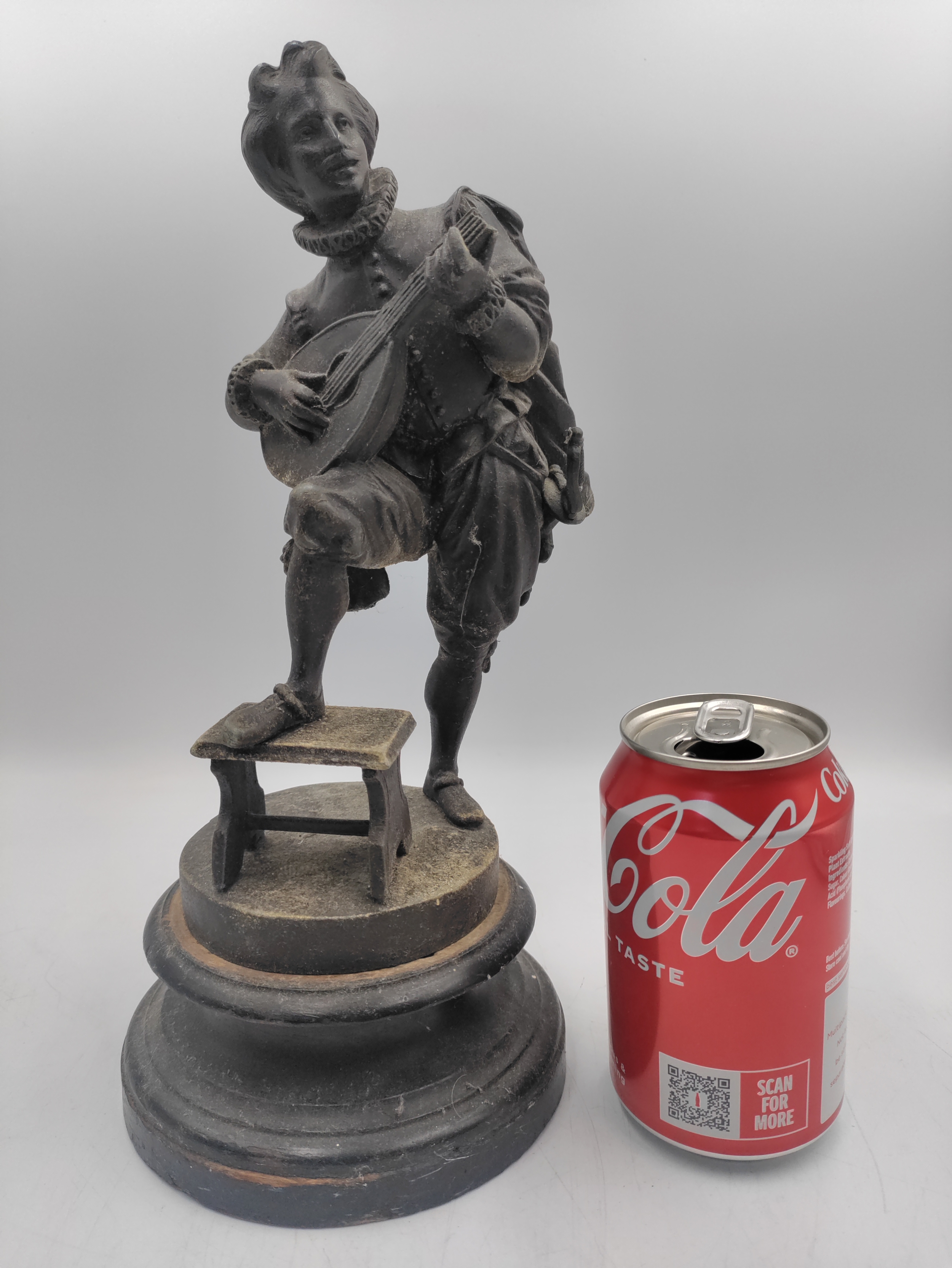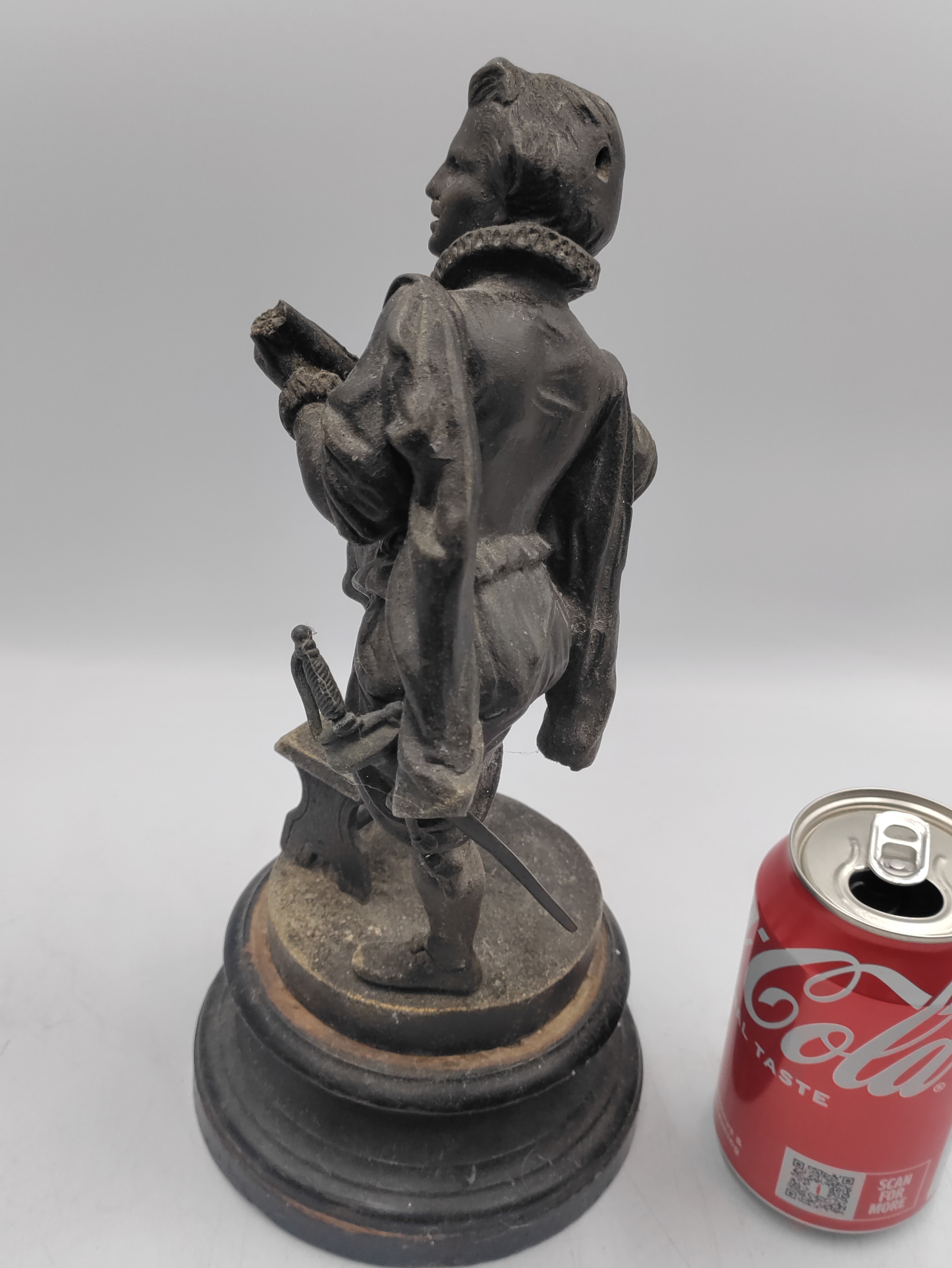 A spelter figurine of a man with a sword playing a lute. Damage as shown.