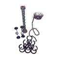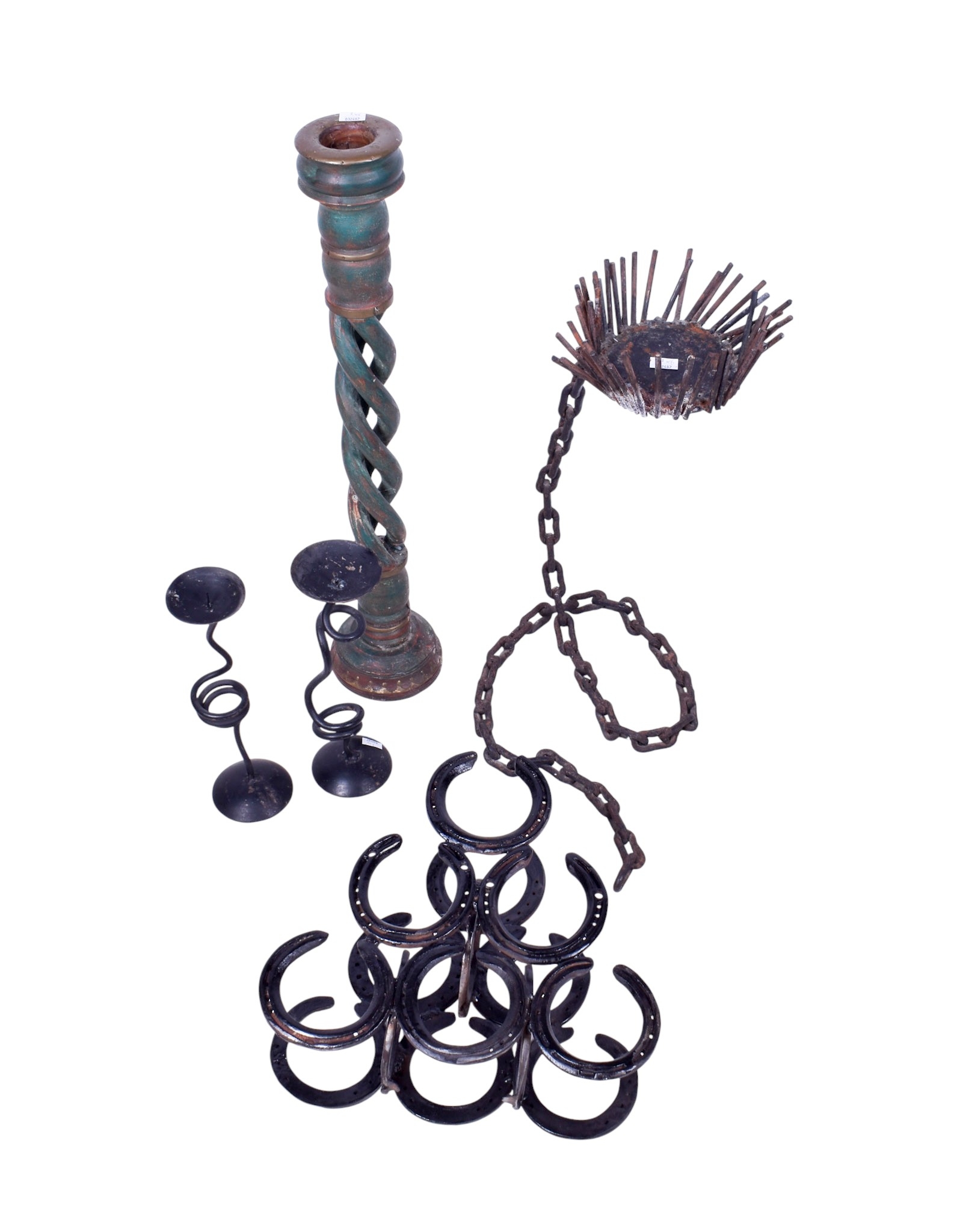 An assortment of collectables. Including a large wooden candlestick, a bottle rack modelled from horseshoes, a wicker hamper, a pair of candlesticks with twisted stems, etc.