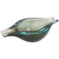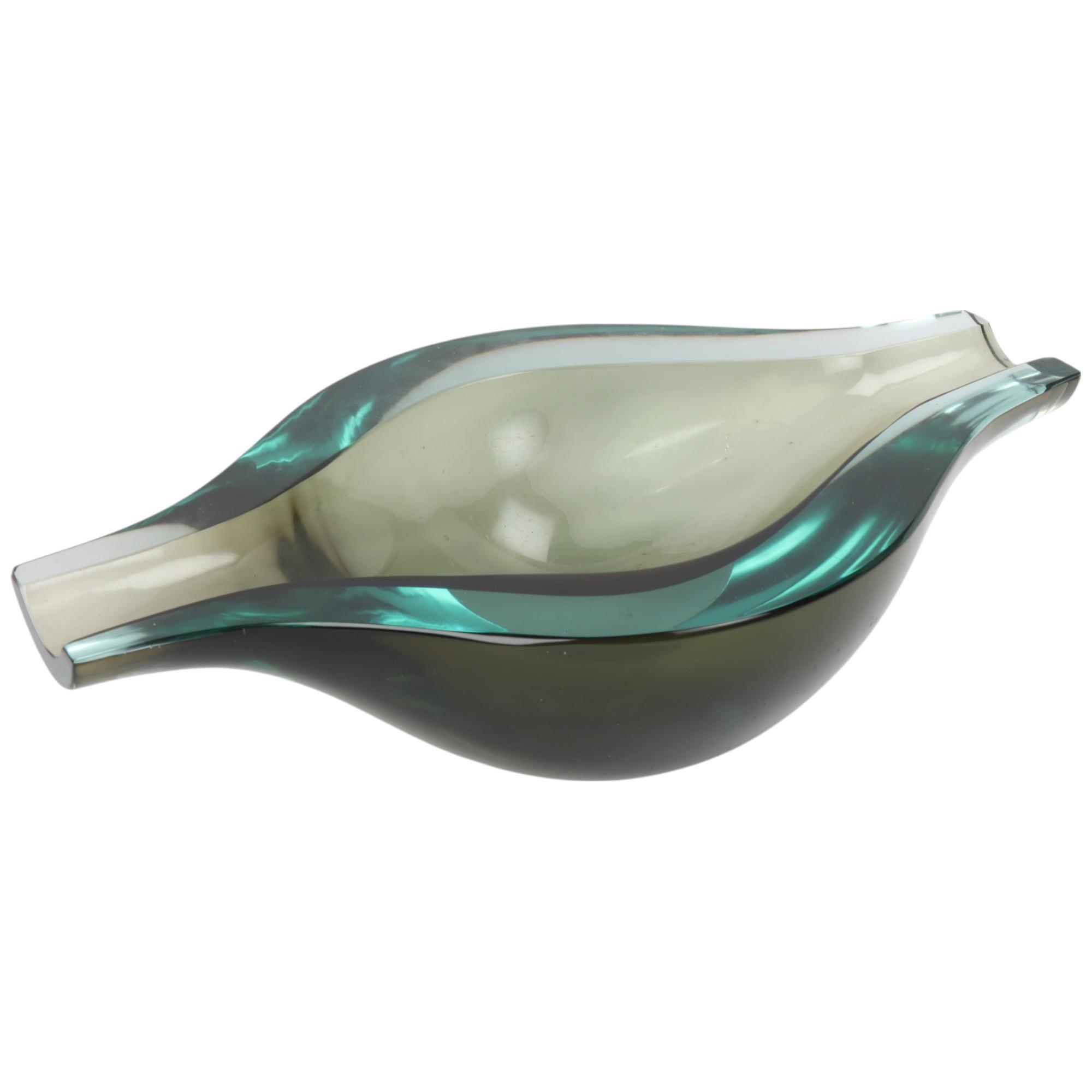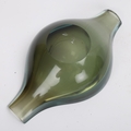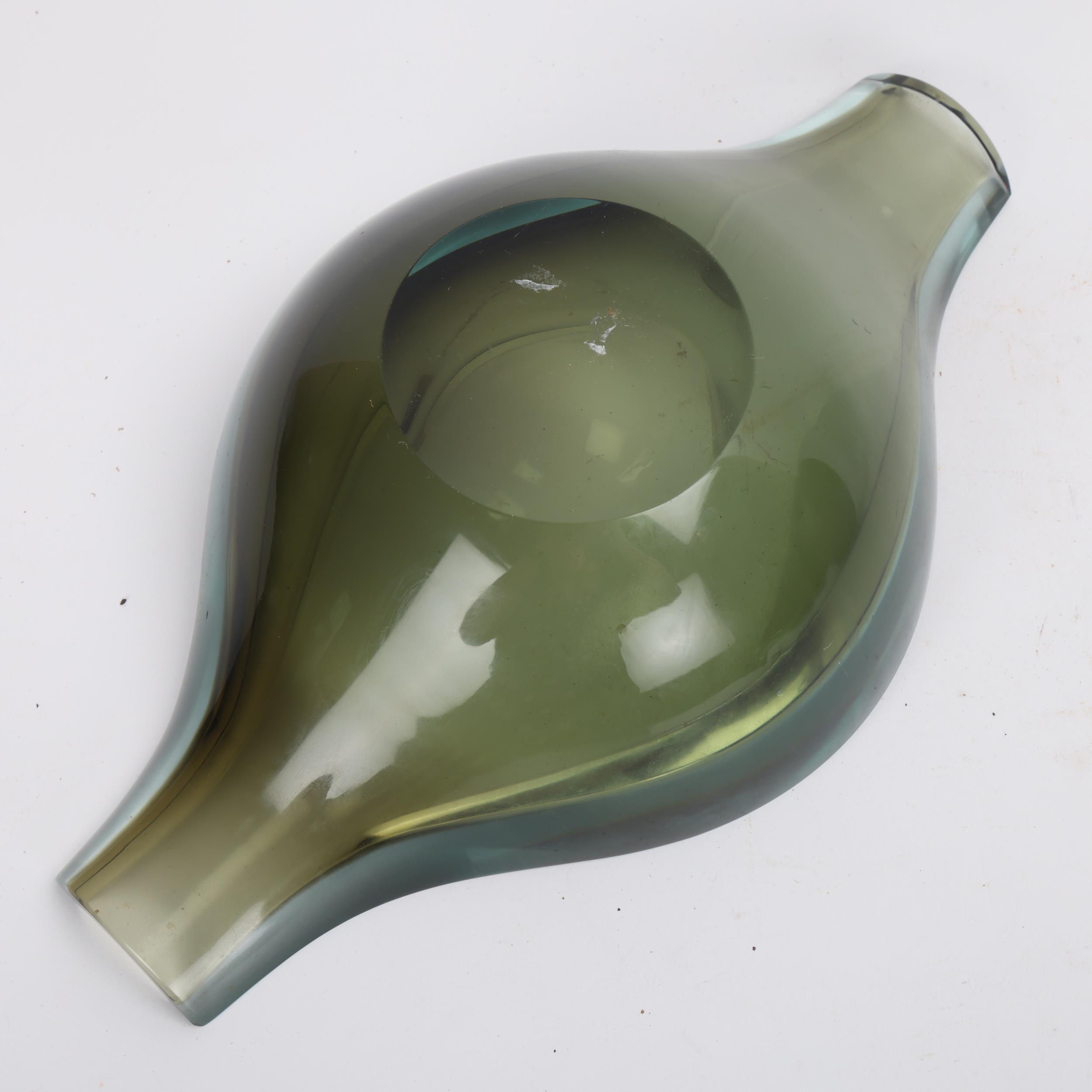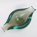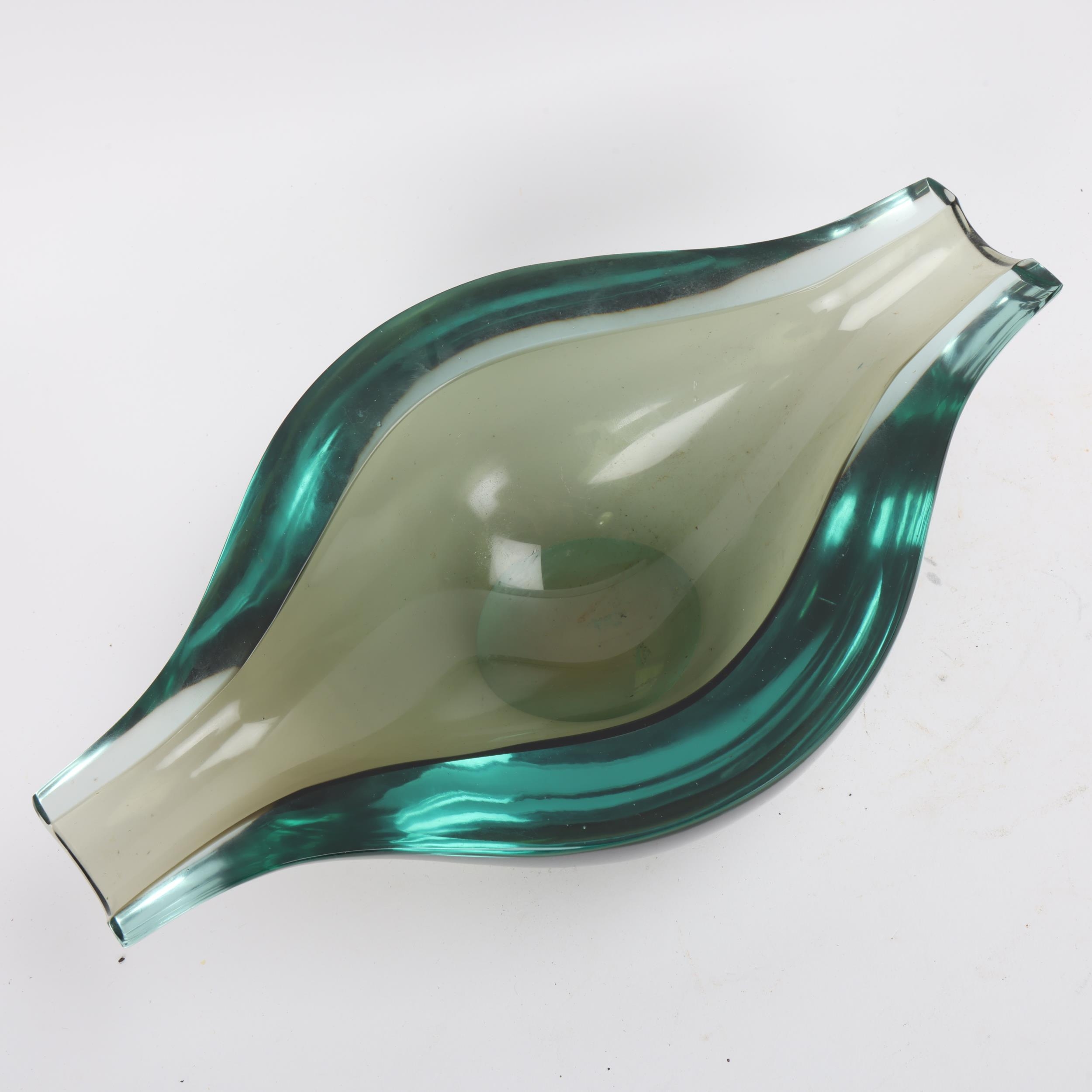 A heavy walled mi-century green glass dish, with centre channel, seed pod form, no makers marks, length, 29cm