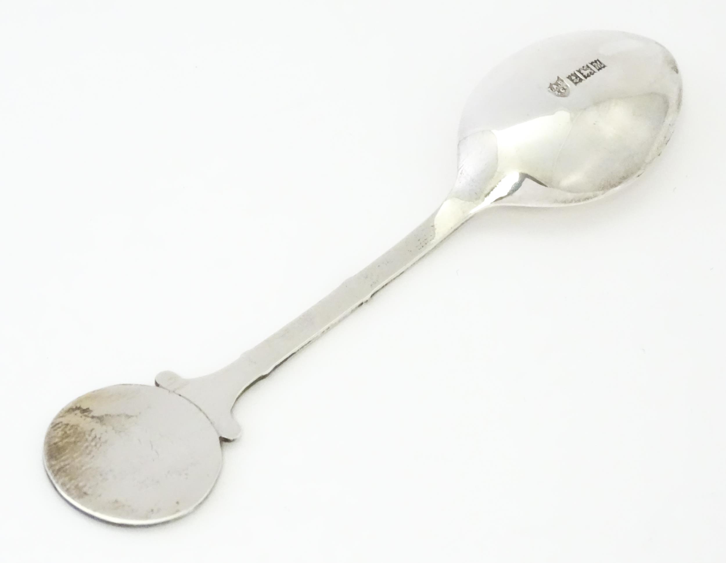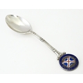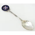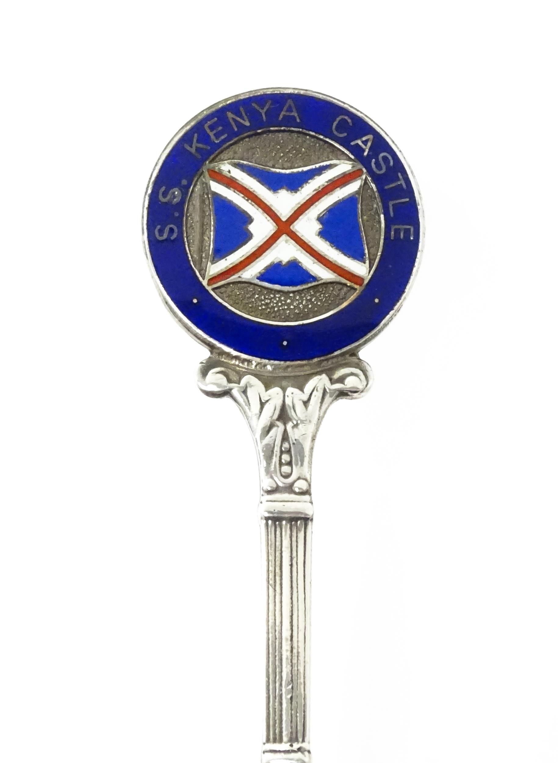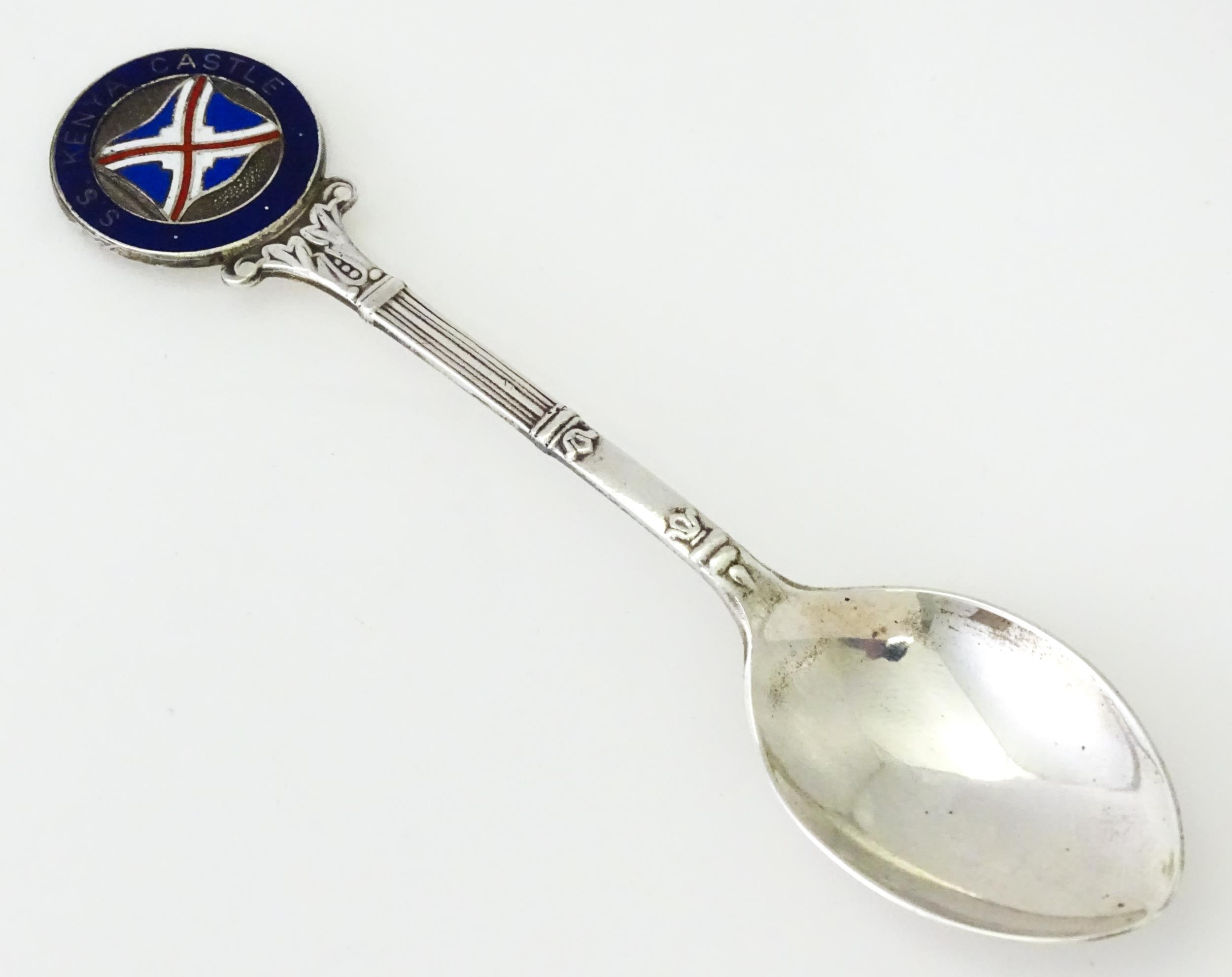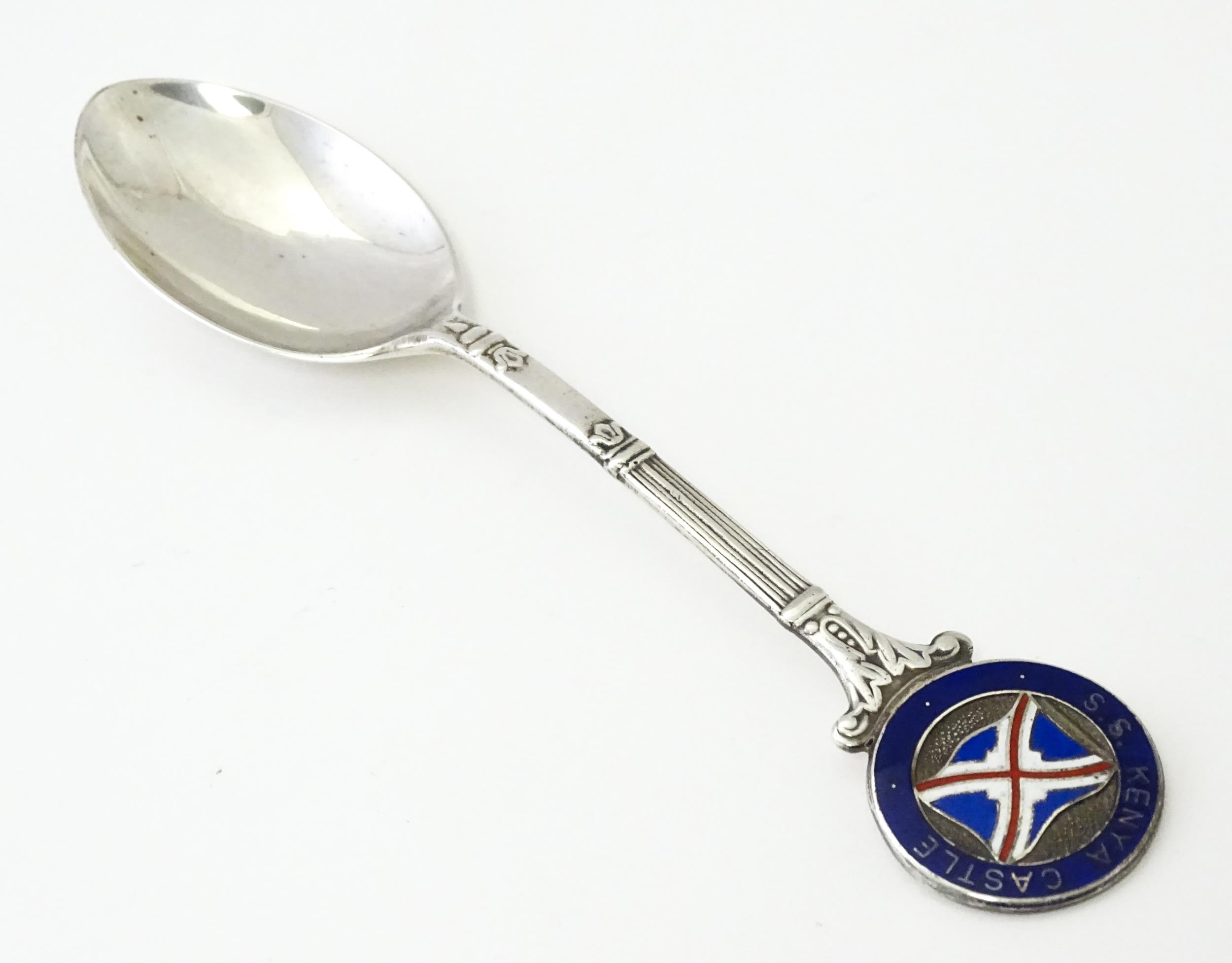 A silver souvenir teaspoon with enamel detail to finial titled S. S. Kenya Castle, hallmarked Birmingham 1961, maker T A Butler & Co. Approx. 4 1/2" long