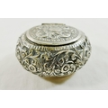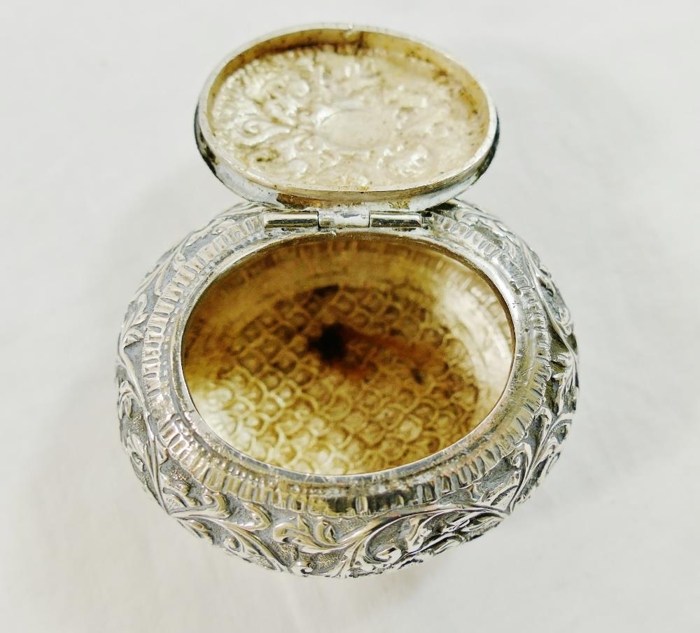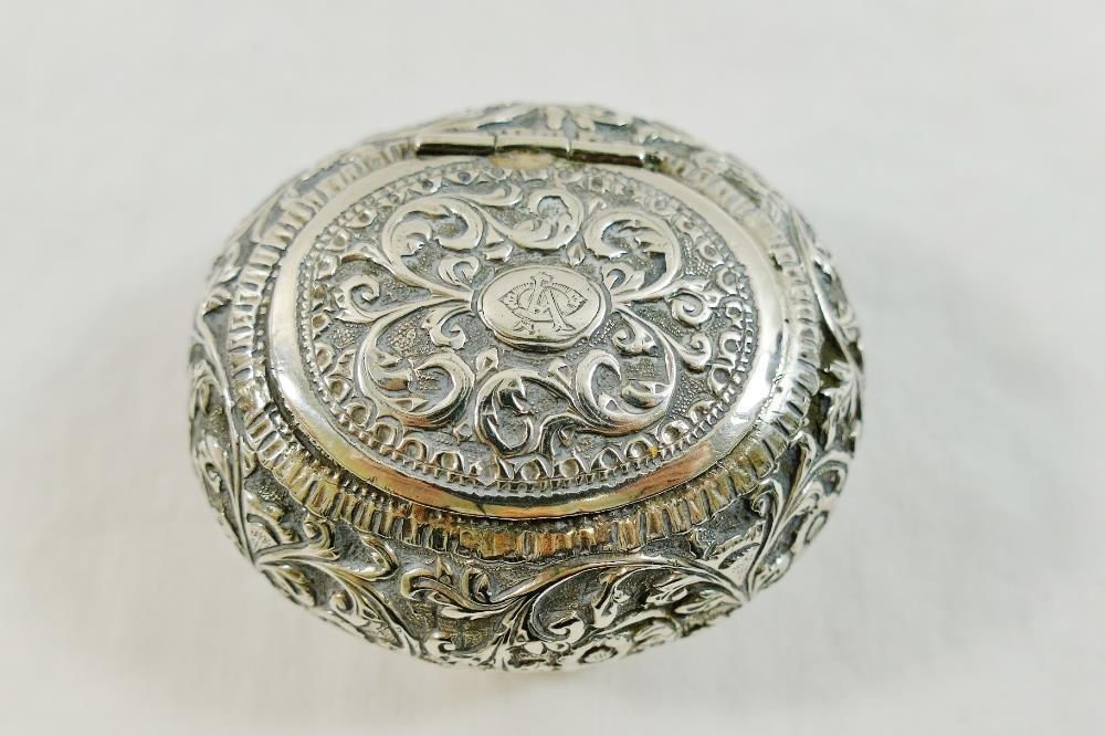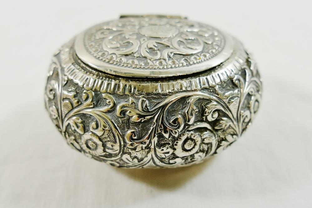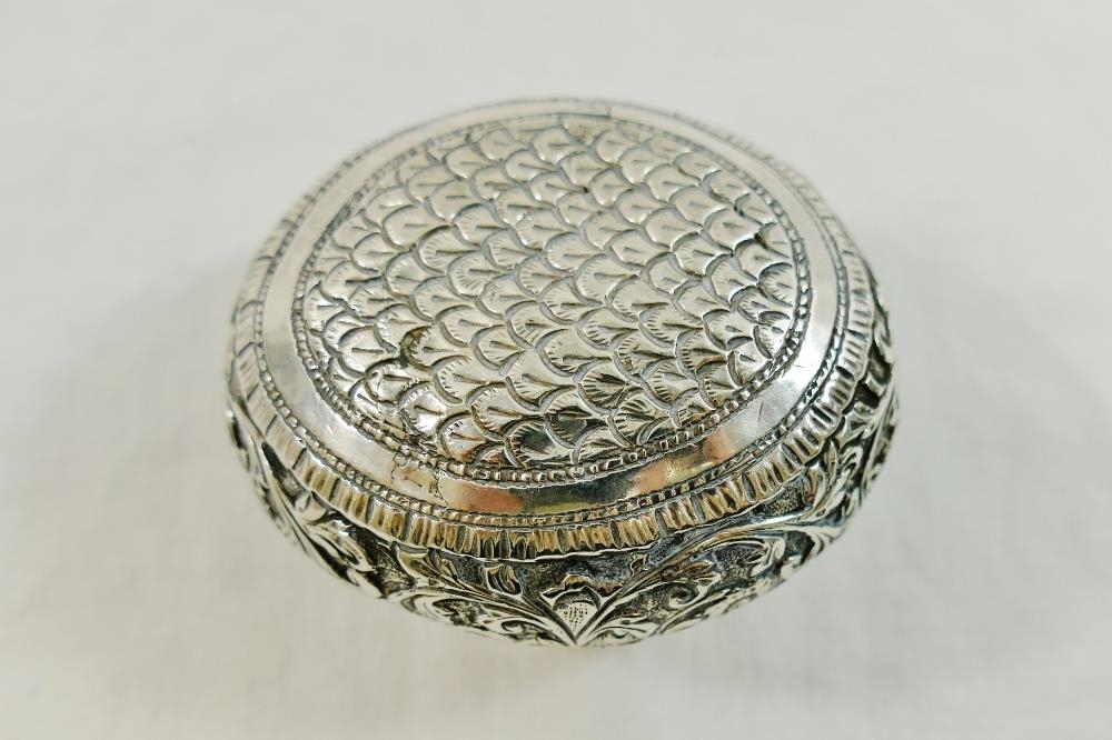 An Indian silver coloured metal oval snuff box, with embossed decoration and hinged lid, 3.5cm x 6cm x 7cm, 62.7g, 2.01ozt