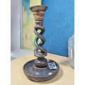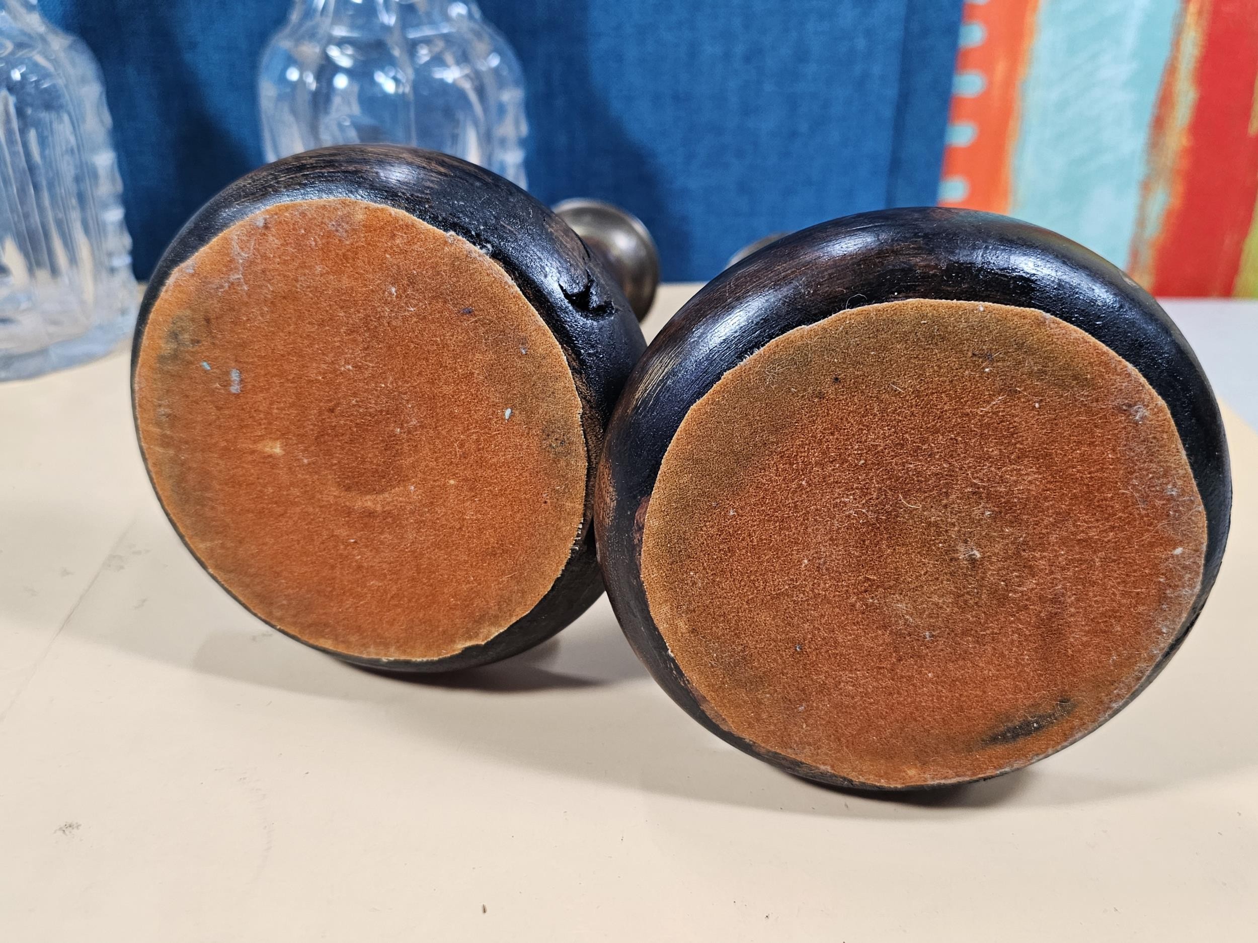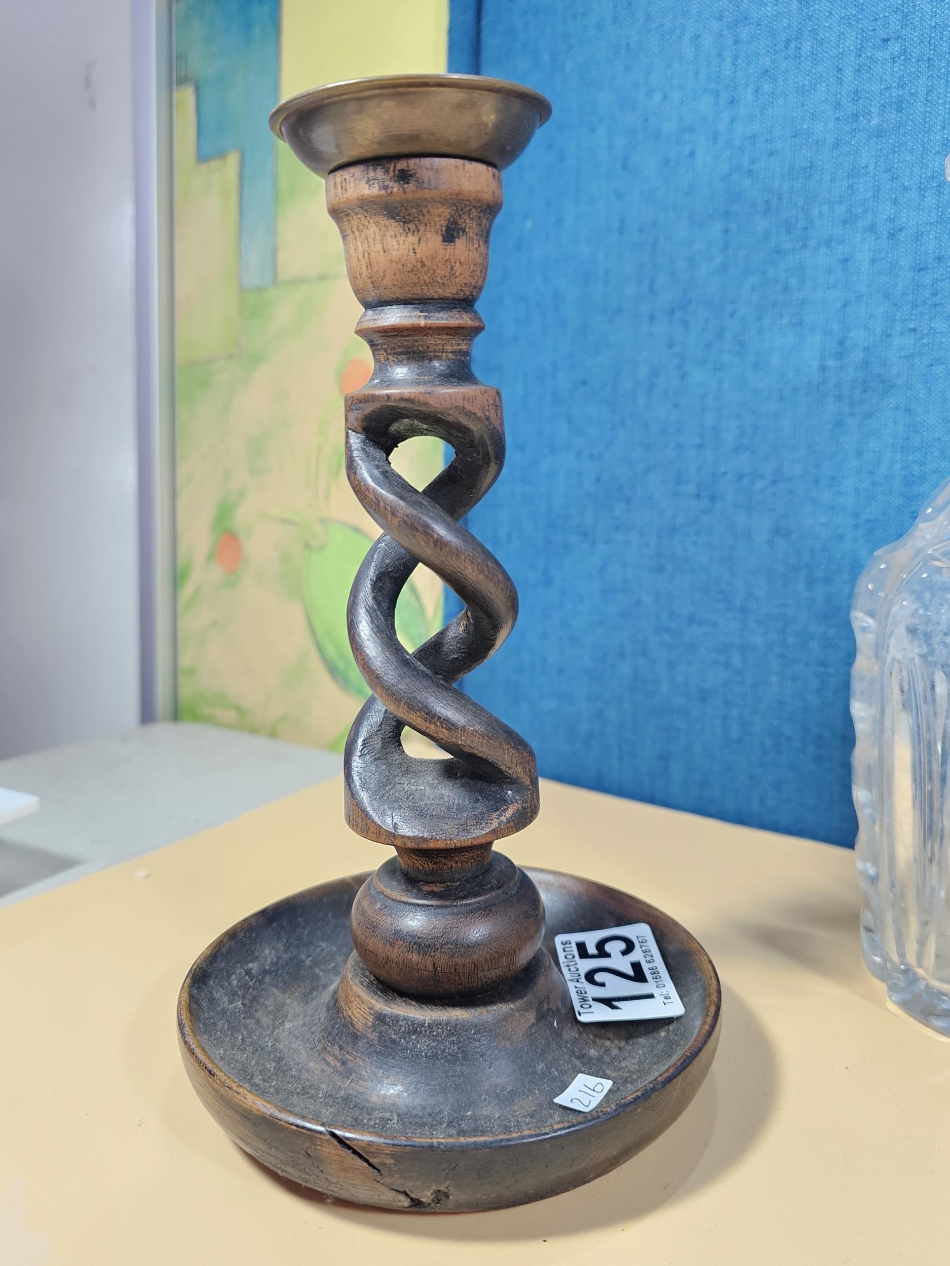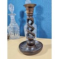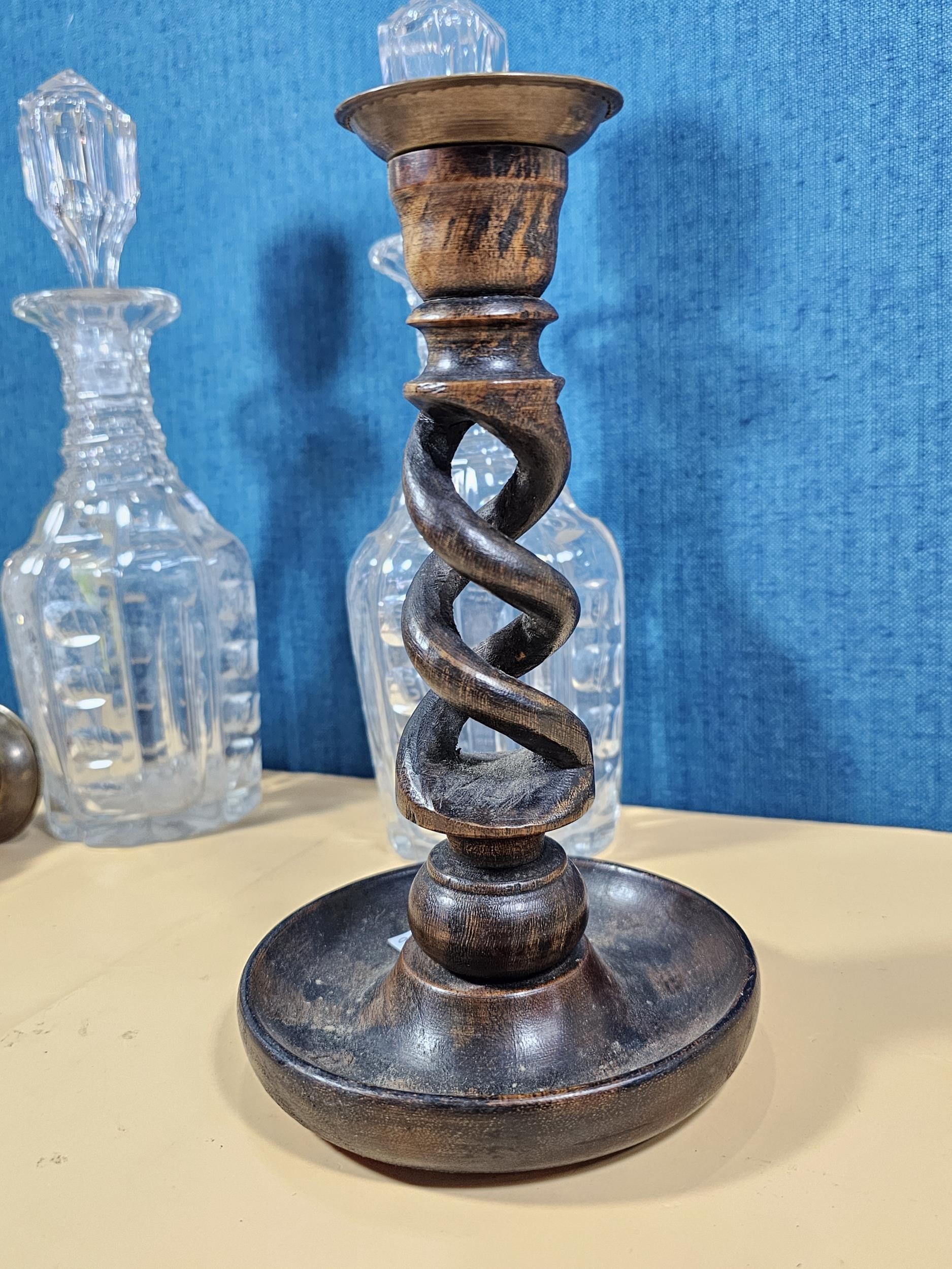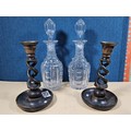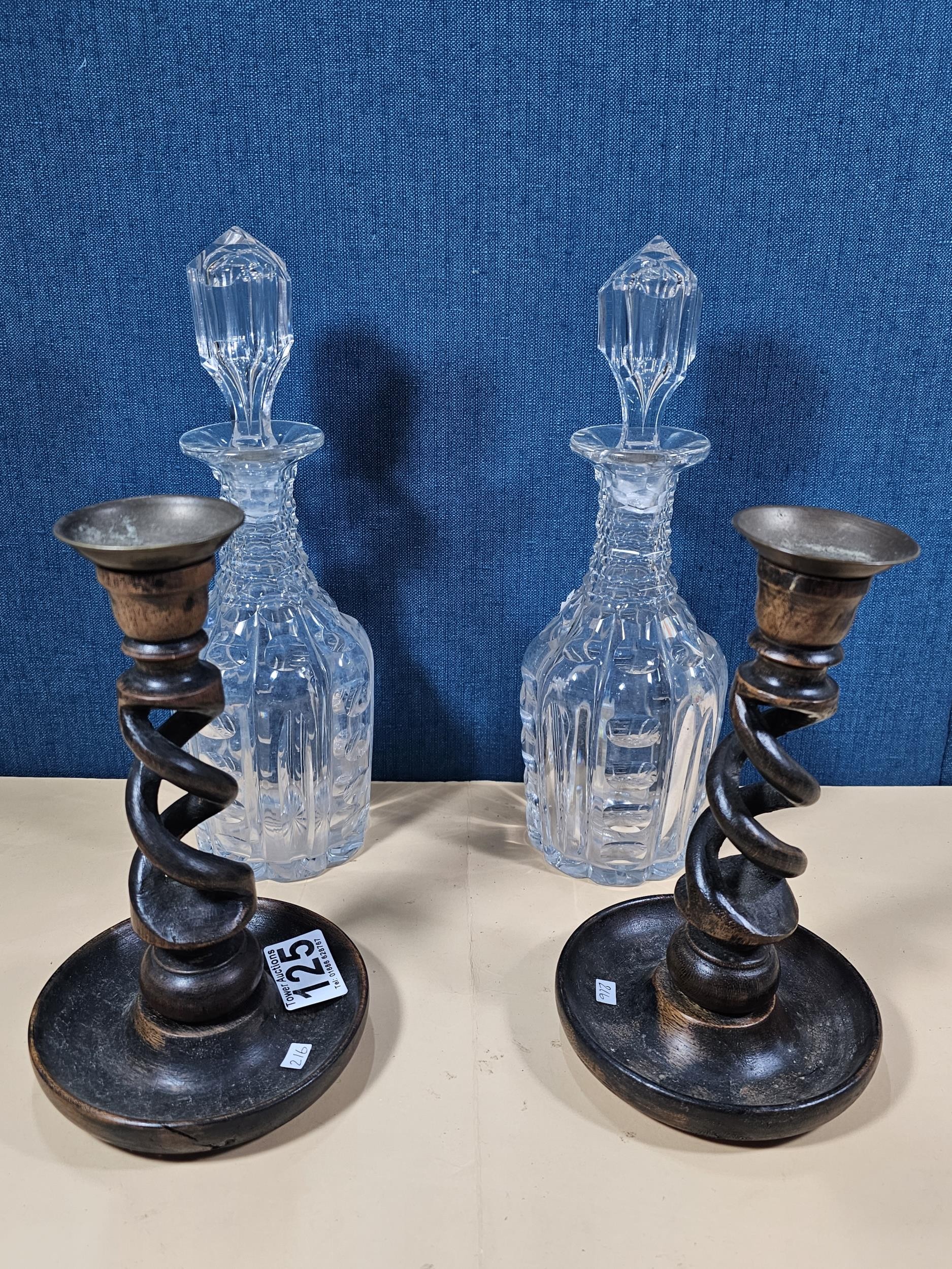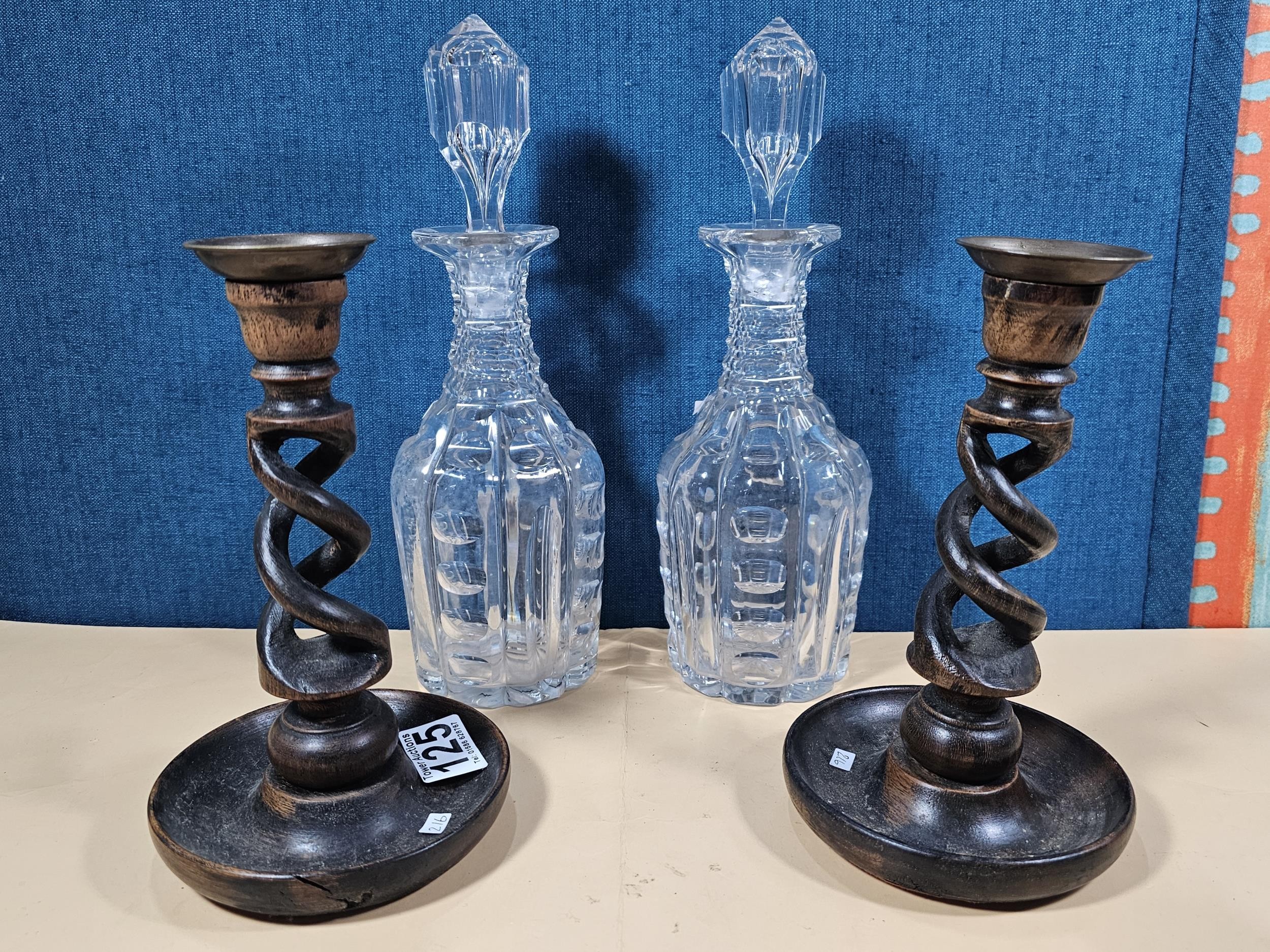 A quantity of collectables to include a pair of barley twist wooden candlesticks and a pair of cut glass crystal decanters with matching stoppers, all appear to be in good order the decanters have a height of 29cm