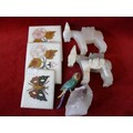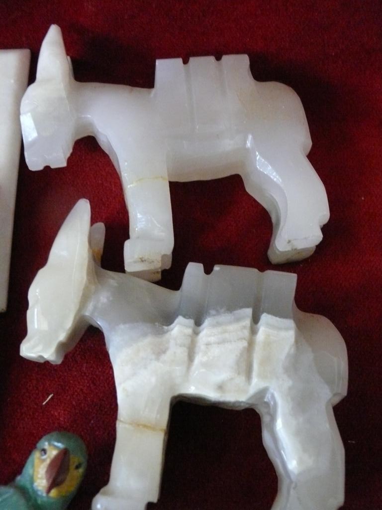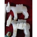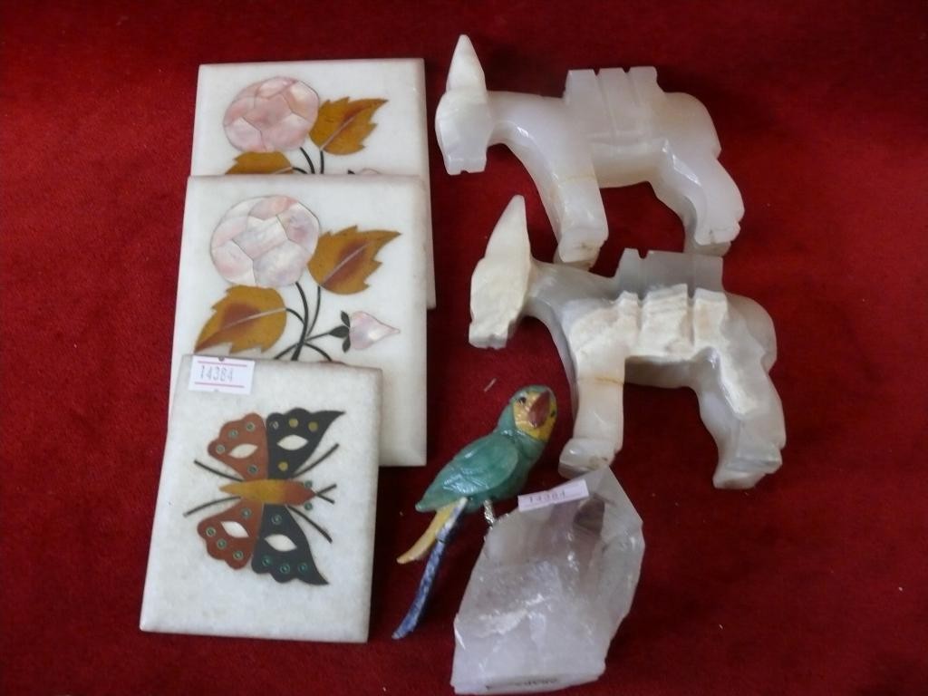 PAIR OF WHITE ONYX DONKIES, A PARROT ON A ROCK, AND 3 DECORATIVE SOAP STONE TILES WITH MOTHER OF PEARL INLAY