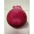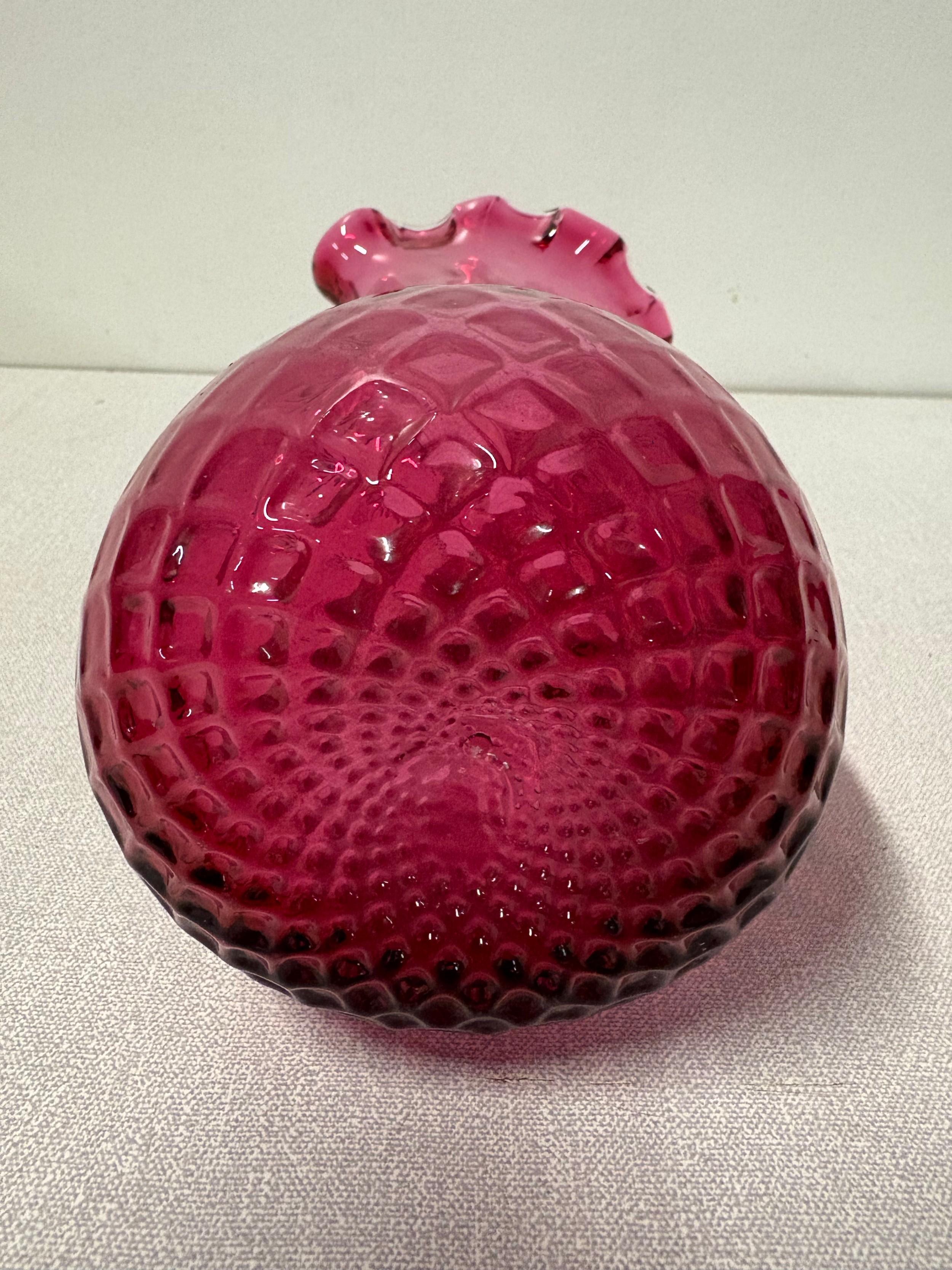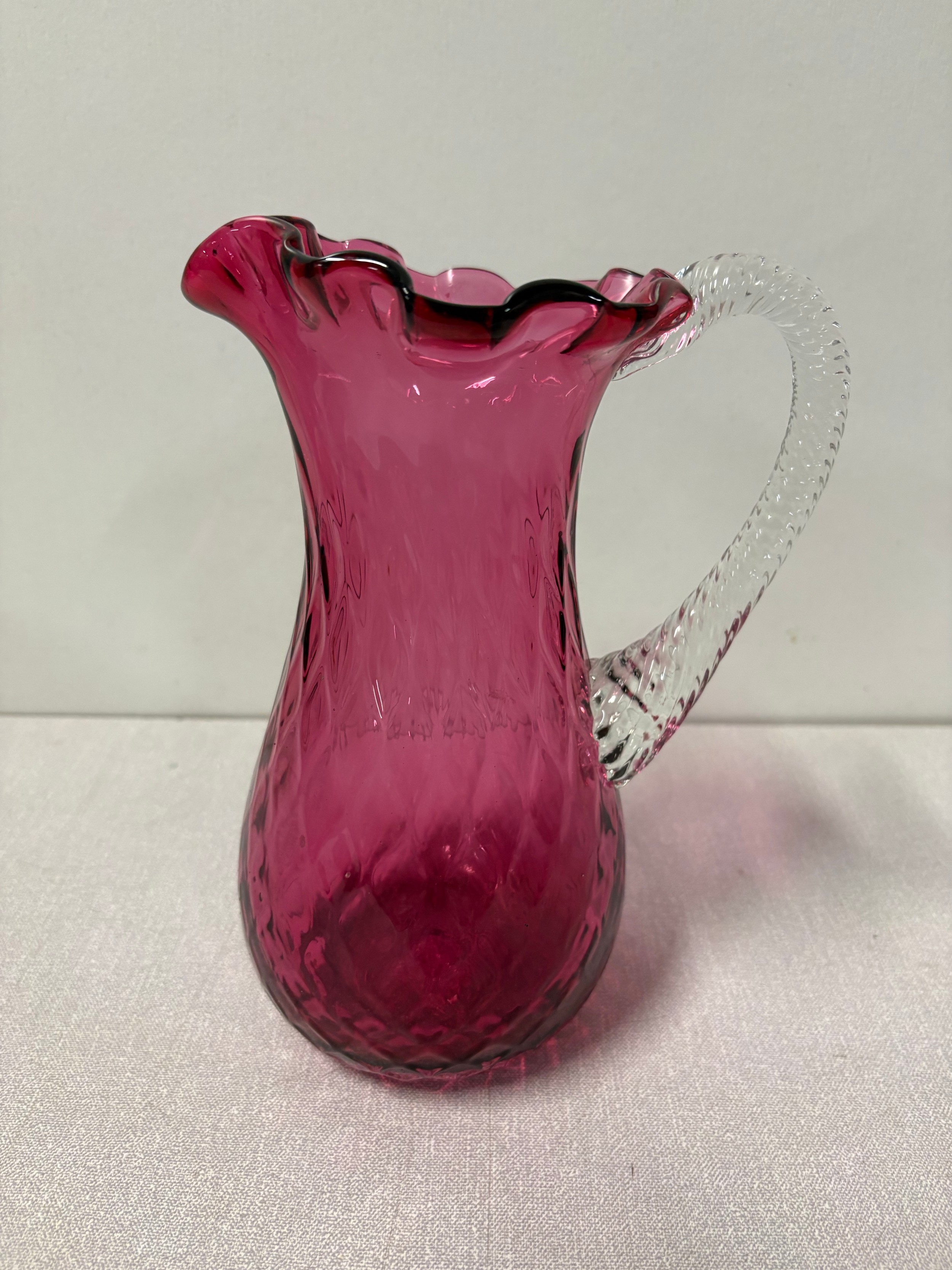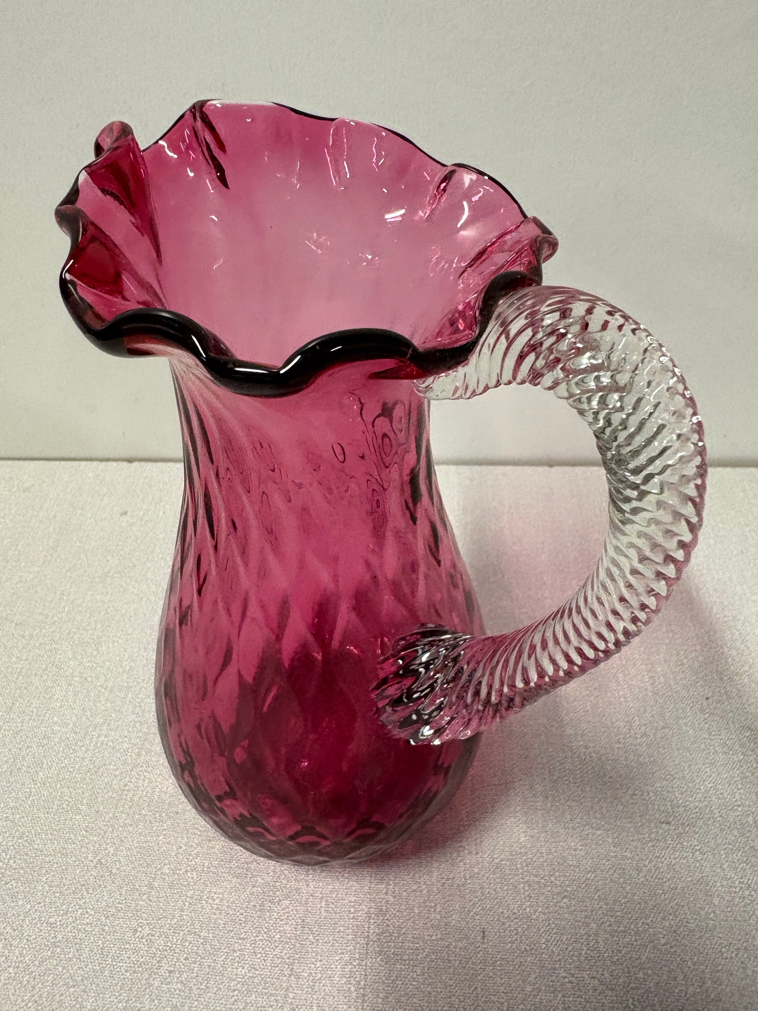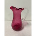 Large cranberry glass pitcher with ribbed handle, 9" tall.