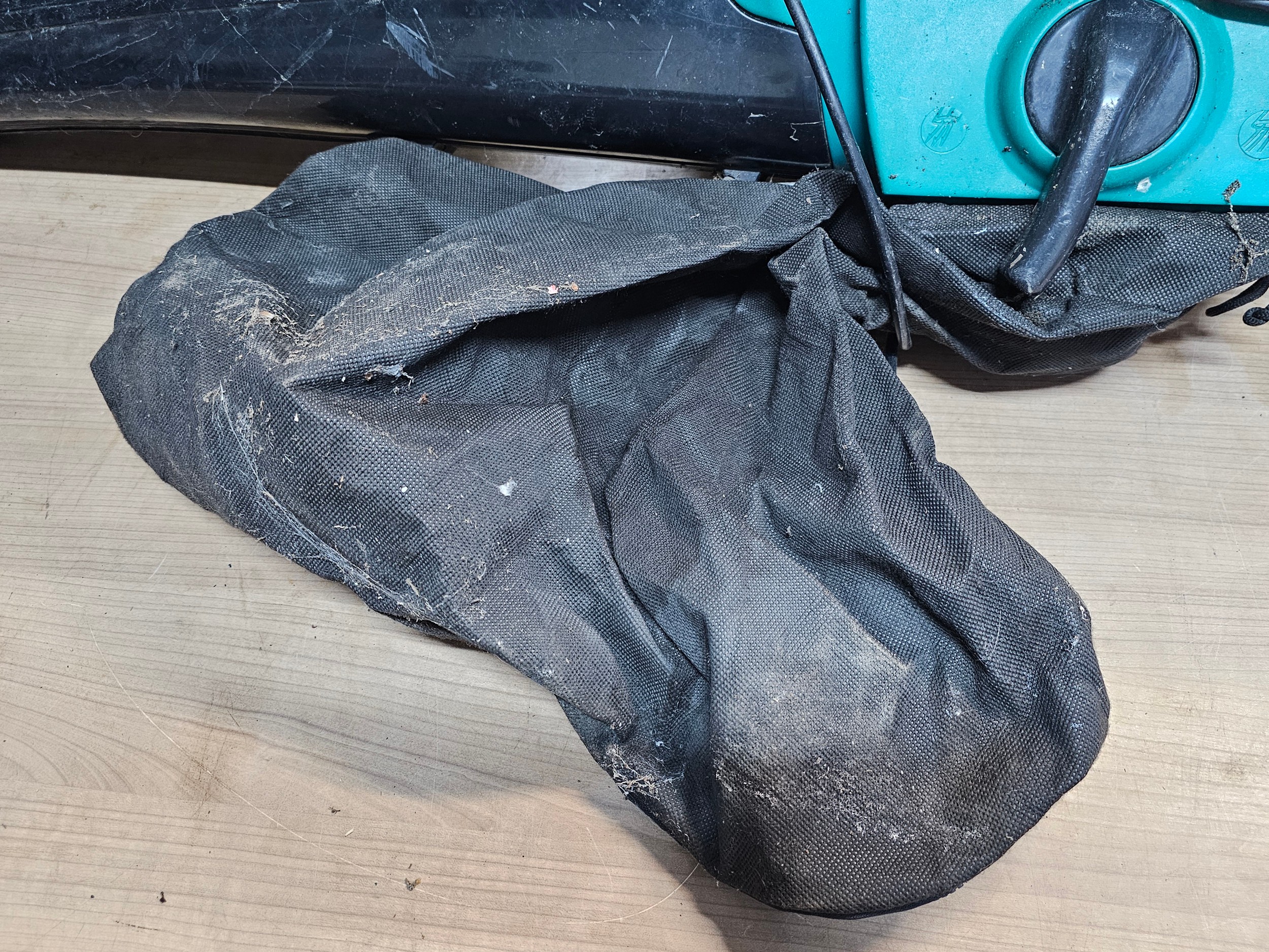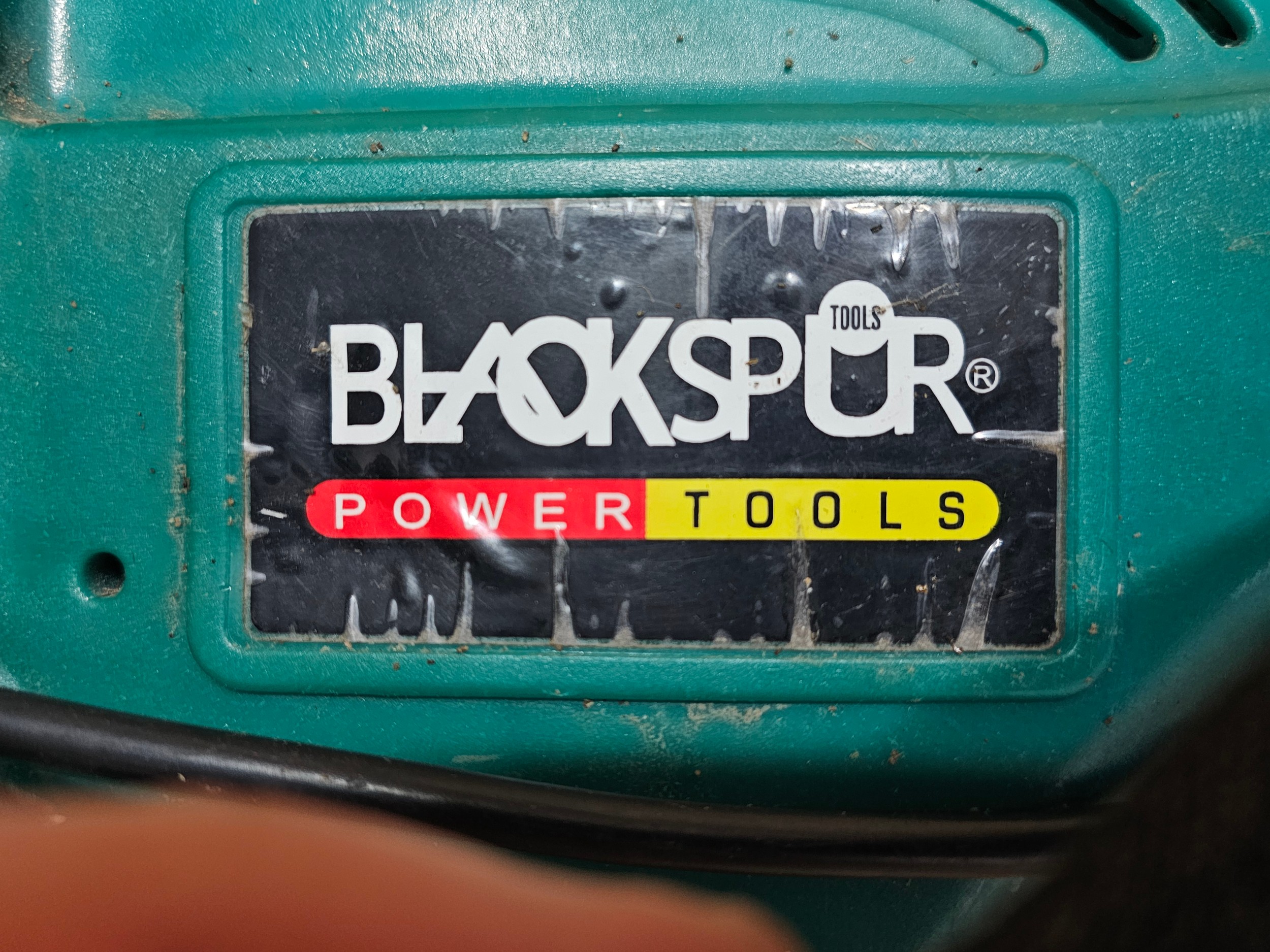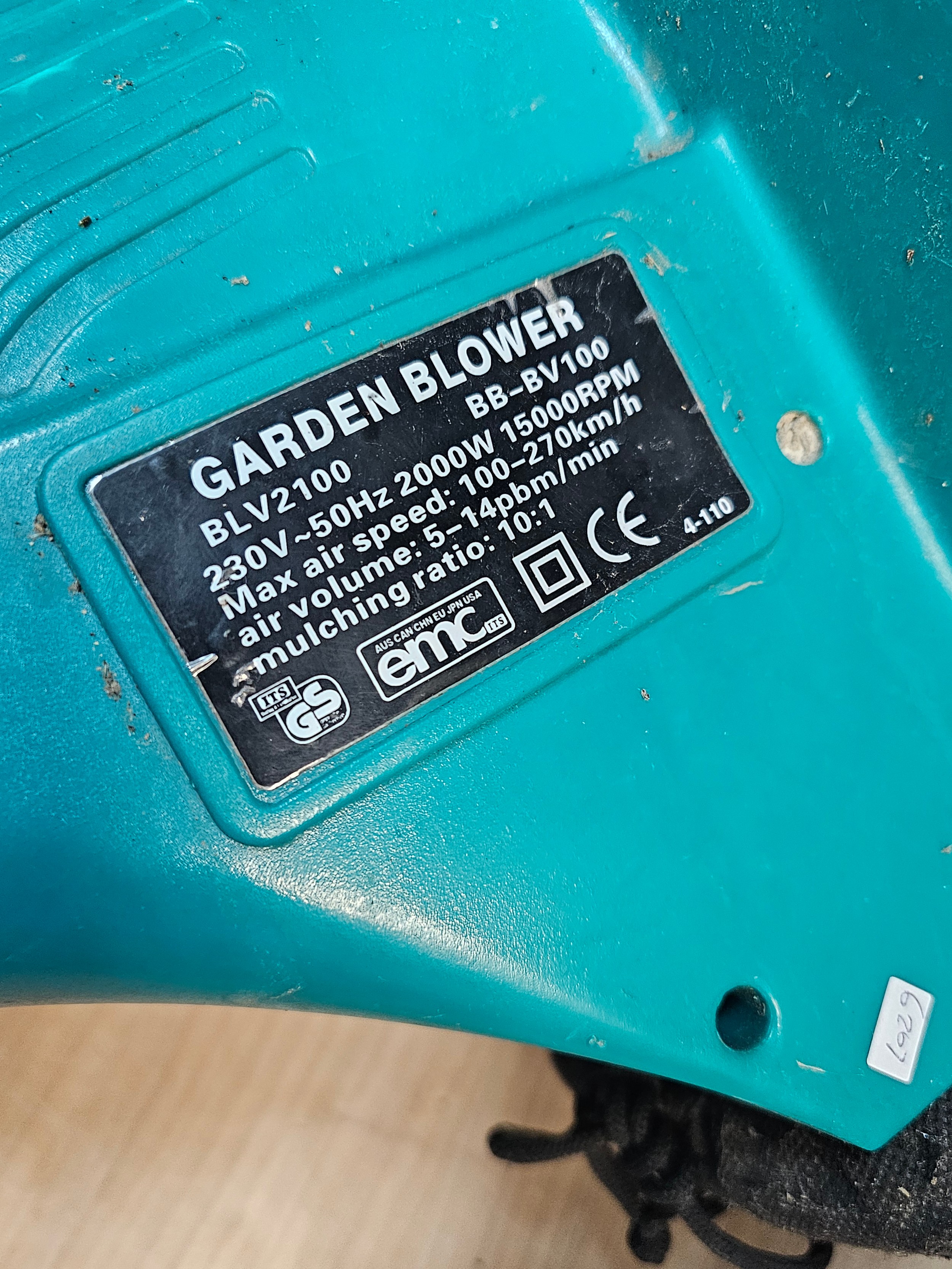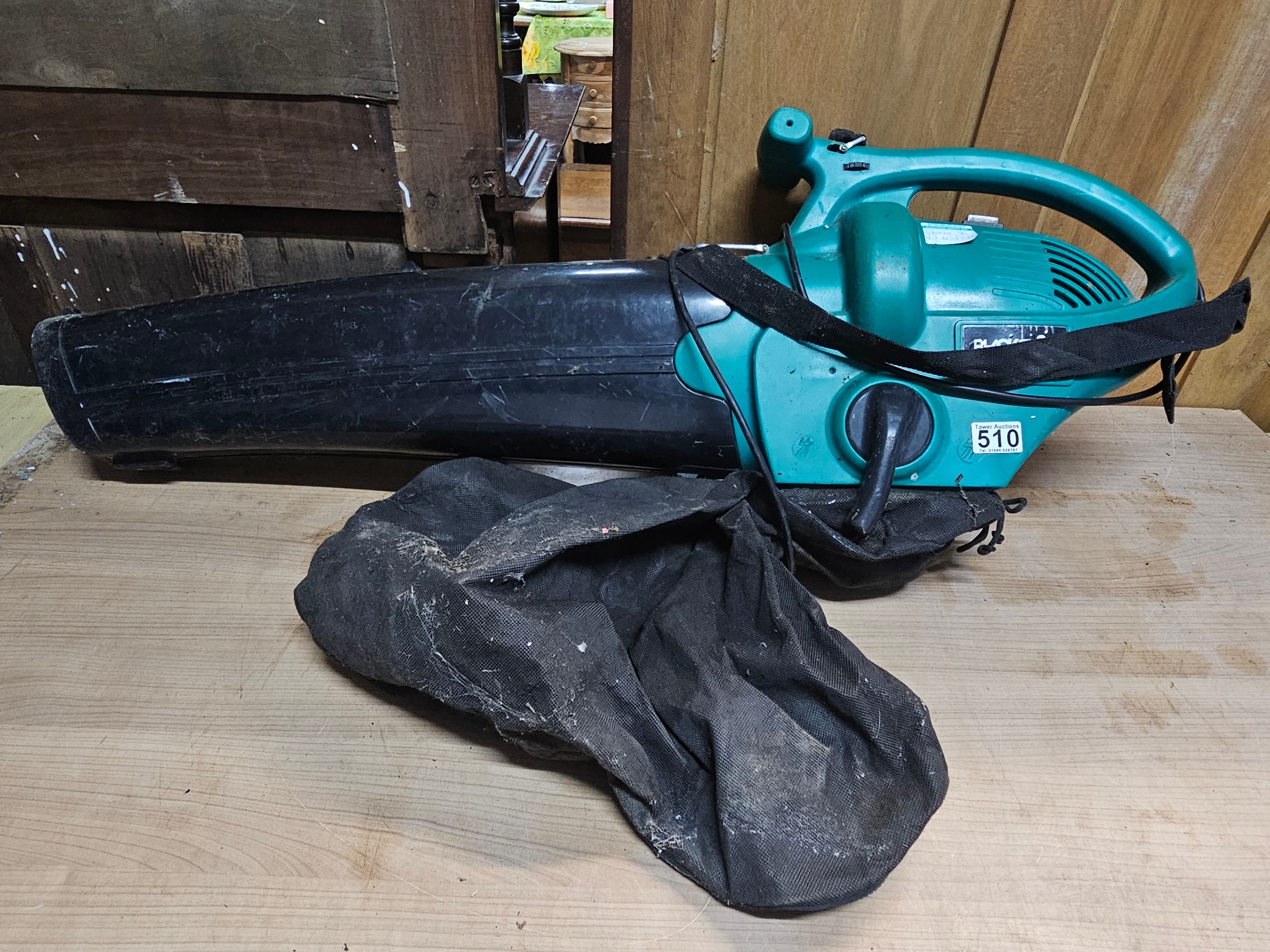 Blackspur garden power tool in the form a leaf blower with a catchment sack, blows and vacuums complete with carry handle